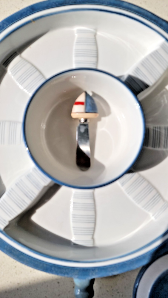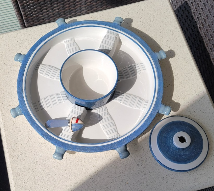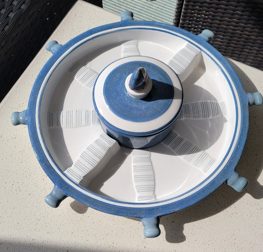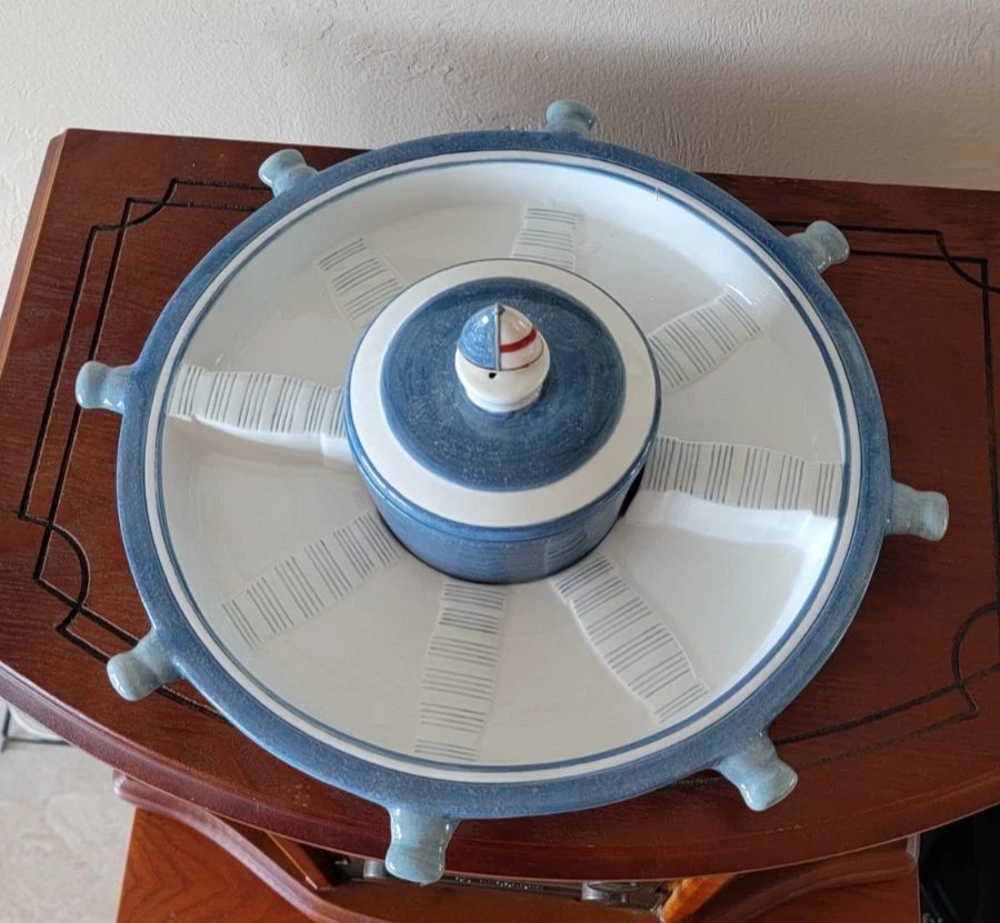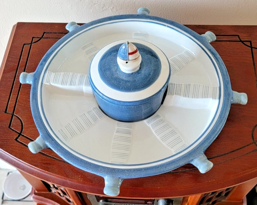 This beautiful serving tray set from GRASSLANDS ROAD is perfect for any occasion. With a nautical theme, the set includes a large round tray, four sectioned platters, dipping bowls, and knives. The tray and bowls are made of high-quality ceramic material with a glossy finish, making them easy to clean and dishwasher safe. The multicolor set is perfect for entertaining guests or for use during family dinners. The tray measures 14.5 inches in diameter, while the bowls are 4.75 inches wide. Weighing in at 4 pounds, this set is sturdy and durable. Whether you're hosting a formal dinner party or enjoying a casual meal with your loved ones, this serving tray set is sure to impress.