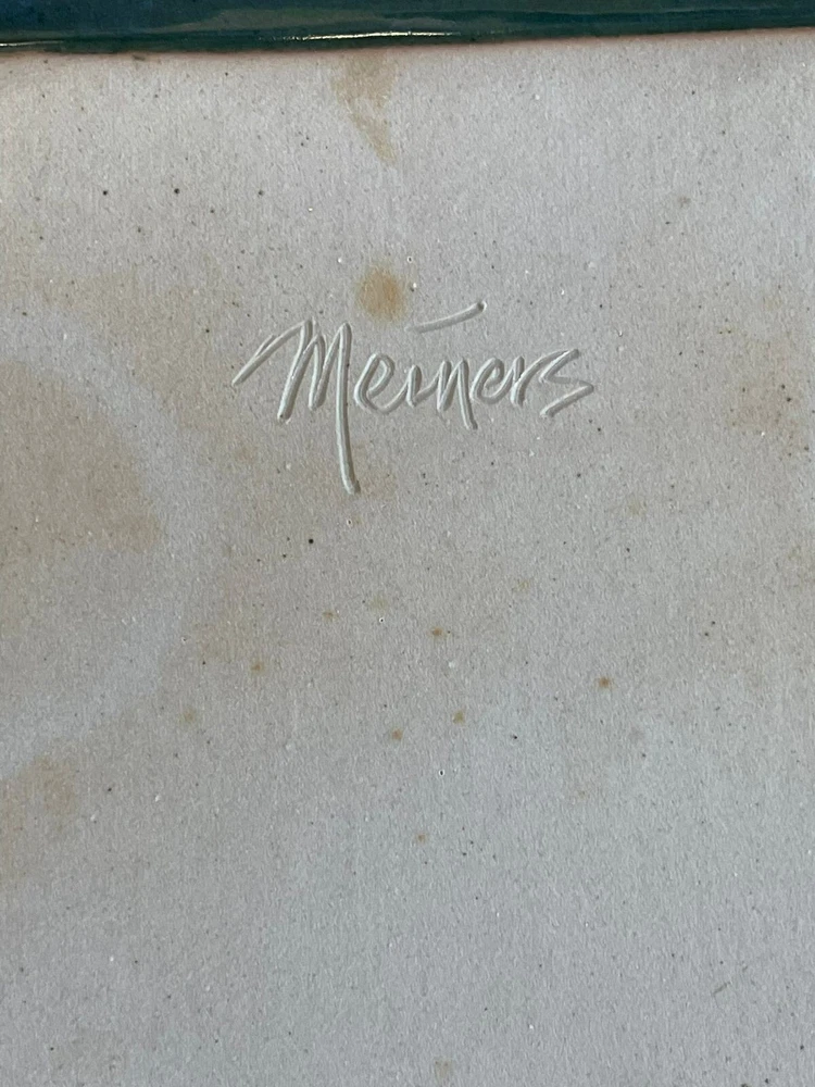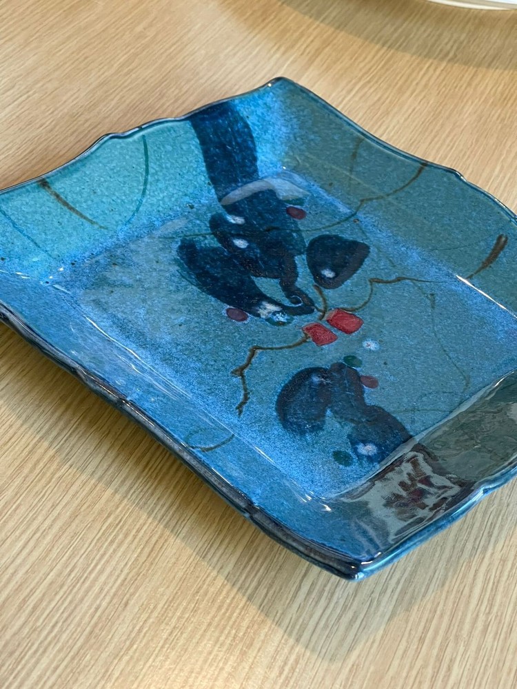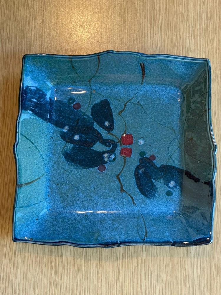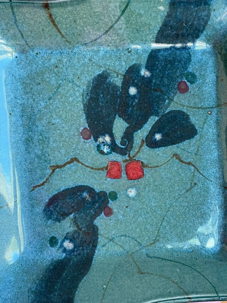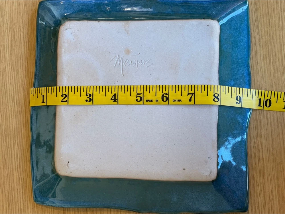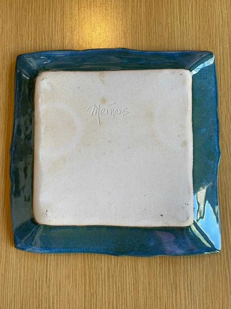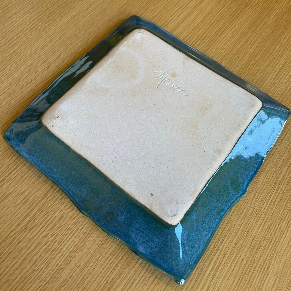 This Studio Art Pottery Tray is a square dish with a multicolor design in shades of blue, handmade from clay in the United States. The piece is part of an original production style known as Art Pottery, crafted using the pottery technique. The artist's signature adds a personalized touch to the handcrafted creation, making it a unique and artistic addition to any home decor.