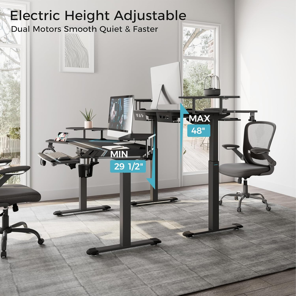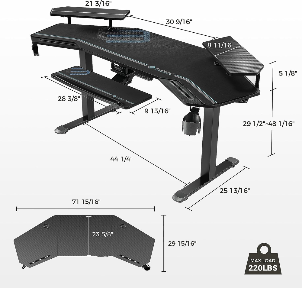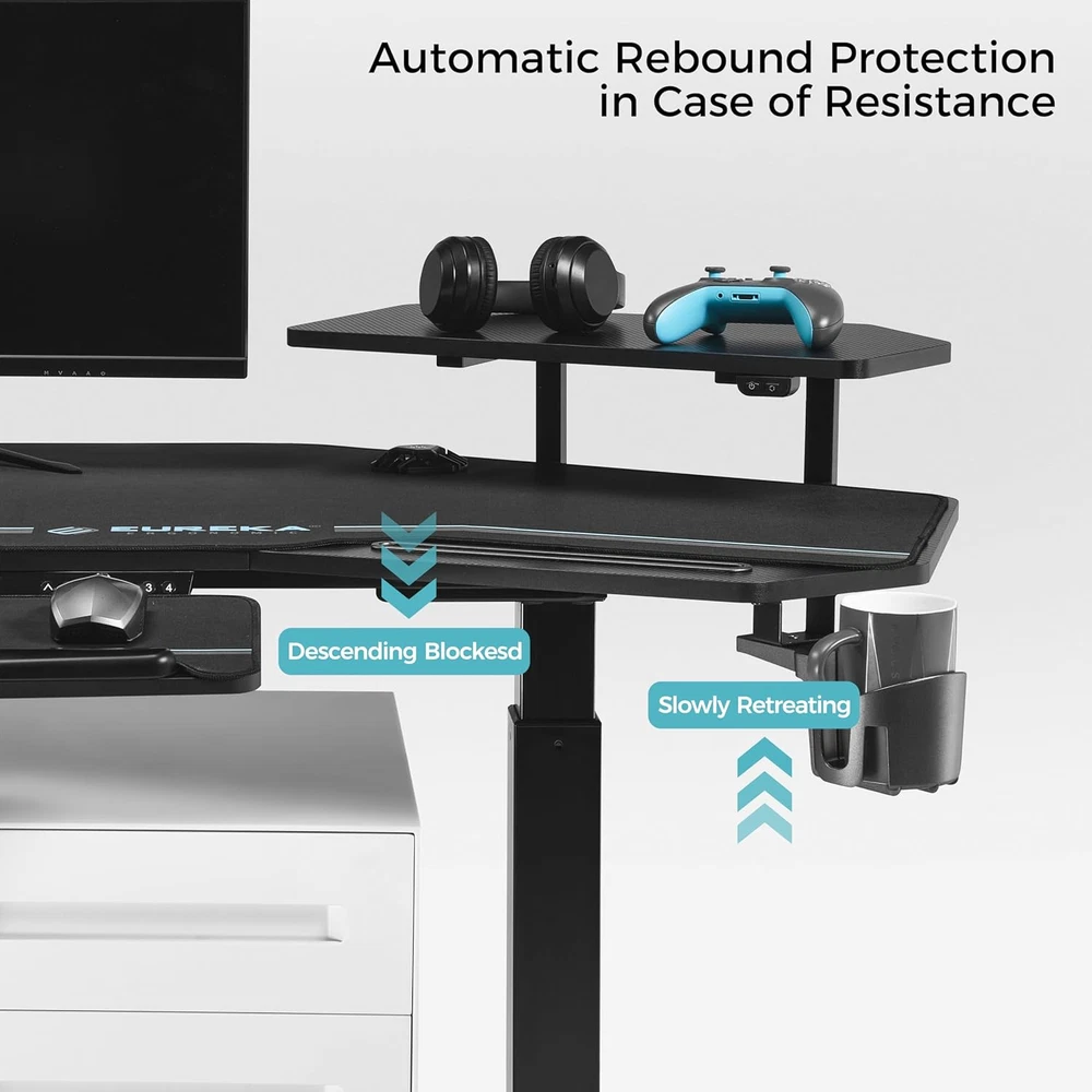 [ Large Sturdy Smart Standing Gaming Desk ] Advanced Dual Motor system generates enough power to lift the computer desk smoothly, evenly and quietly; Adjustable height ranges between 29" to 48", ideal for any adults; Quick response with the button operation; Allow to preset up to 4 frequently used heights; Smart Anti-Collison Technology with Built-in HALL SENSOR & AI CONTROL to detect obstacles and blackout, this sit stand desk stops instantly to prevent accidents; Max weight up to 220 lbs. [ 72" Ergonomic Wing-shaped Music Studio Desk Workstation ] People who work or game for long time will feel very comfortable as it provides flexible room for abdomen and arms;The wing shape desk design makes it easy to reach and grab what you want as well; A gaming desk area of 72x23.6 inches accomodates your music, studio,gaming or live streaming equipments while you still have ample room to move. Made of smooth carbon fiber texture, Eureka gaming standing desk is water- and heat-resistant. [ Convertible Dual Shelves with LED Lights ] Ultimate customization by installing in 3 Ways of Eureka RGB desk; MIDDLE as gaming desk standing desktop mount monitor shelves; LEFT&RIGHT as storage/display shelves for holding 1-2 monitors; BY THE SIDE for easily supporting 3-4 widescreen monitors; Single- and Multi- Color Lighting with 6 RGB colors and 1 white light for daily; Music studio desk built-in Light Controller helps you switch from battling to working mood easily. [ Complete Set ] LIMITED EUREKA ERGONOMIC COD XXL FULL coverage Mouse Pad is included now! Height Adjustable Keyboard Tray with mouse pad can be 360°horizontally rotated and 15°vertically tilted for you to get a comfortable position, greatly relieving soreness of your hands. Easy storage by pulling it back under the table if not needed. Computer keyboard tray for standing desk and Soft Full-desk Mouse Pad with non-slip rubber base creates top-notch user experience. [ Fully Functional ] The eureka ergonomic gaming desk has complete accessories. Dual Slots for tablets, mobile phones, etc, perfect for multi-taskers; Cable Management System features dual cable holes and socket holders under desk; Double headphone hangers and a cup holder are rotatable for easy grab.***5 YEARS of Limited Warranty; Feel free to contact our 24-hour US-based customer service with any questions; NOTE: You will receive 2 Packages. User Manual is packed in Package 1 with the desktop. Product Description Ergonomic Design |Anti Collision | Height Adjustable | RGB Lights — ORIGINAL WING SHAPE DESIGN — Cool & Spacious Desktop for Game Play, Study or Work EQUIPPED WITH 2 SHELVES Scientifically Partitioned Areas Provide You Easy Access IMMERSIVE EXPERIENCE Adjustable RGB Light Effect Alternating Sitting and Standing One click electric lifting, 29.5"-48" height adjustable Take care of spinal health & reduces neck and backache 1 72" Wing Shape 2 Multiple Configurations 3 360° Keyboard Tray 4 Full Coverage Mouse Pad 5 Advanced Dual Motor Wider Application 1 Left and Right 2 By the Side 3 In the Middle EUREKA ERGONOMIC 72" Wing Shaped Gaming Desk with Keyboard Tray Electric Height Adjustment- 4 Memory Mode&Anti Collision; Full Cover Mouse Pad - Waterproof and Sweat Resistant;Dual motor - Lifting more Smooth and Faster,Quieter; Adjustable RGB Lighting Effect - Multiple Modes; 10MM Adjustable Foot Pad&Carbon Steel Balance Bar - Non Scratch Floor How many packages will I receive? You will receive 2 packages. Package 1 includes Desktop, User Manual, etc. Package 2 are Electric Desk Frame, Keyboard Tray, etc. Why did I only receive one package? Two packages may not be sent or delivered at the same time. Please rest assured that the other one is still on its way. Will I receive an installation mannual? Yes, it is in Package 1 with the desktop. You can also find an installation video or download file on this product page. What can I do if I have questions about this office desk? Our local customer support team is always there to offer timely help. We pay much attention to customers need and we take pride in our innovative design, rigorous testing, and world class manufacturing process. What's the size and packaging information of this home office desk? Specification: Desk Area: 72’’(L)x23.6’’(W);Height Adjustable: 29’’-48’’ Package: Electric Standing Desk with Double Shelves x1, Full Desk Mouse Pad x1, Keyboard Tray x1, Mouse Pad for Keyboard Tray x1, User Manual x1
