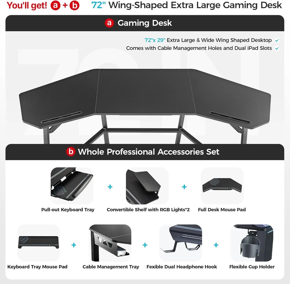Large Desk Surface: Wing-shaped Gaming desk measures 72" wide by 24" deep, supports up to 400 LBS. Ergonomic Desktop provides flexible room for your abdomen and arms, designed for the people who sit for a long time. Large gaming desktop with smooth carbon fiber texture easily hold gaming gears, music studio or live streaming devices. Fully Functional: Gaming desk comes with 2 monitor shelves with RGB lights for PC gamers and streaming. 2 iPad grooves to place the mobile phones and tablets. 2 cable management holes and 2 power socket holders keep your field tidy. A cup holder and a dual headphone holder on both sides of the desktop. You will have the perfect battle station to destroy your competition. Table with Keyboard Tray: The keyboard can be placed and can be pulled back and forth,which greatly relieve the pain of your hands. Pull it backward under the desk if not needed. The keyboard tray comes with a mouse pad, and also a customized full-desk mouse pad contained. Payment 1. Payment should be completed within 3 (Three) days of auction closing. Or unpaid dispute will be filed for closing auction automatically. 2. If for some reason there is any issue with the payment, please contact us, and we will be glad to work with you to have it resolved. Shipping 1. Package handling only takes 3 business day at our warehouse, so please make sure entering correct payment and shipping information before checking out. 2. According to eBay policy, we only ship to eBay ADDRESS. Once your payment is completed, you can leave eBay note or click the button named “contact seller” in your purchase history if the changes are needed before we send the product. 3. If an address change is needed after sending your item, you will be responsible for any fees associated. 4. We only ship to the Mainland 48 states, and we do not ship to Alaska, Hawaii, FPO or APO Terms of sales 1. All of our items come with a 30-day return policy. We ensure all our items are new and in excellent condition prior to shipping. In the event that you receive the item that is not to the standards above, please contact us via eBay messages. All returns should be shipped with delivery confirmation.New items must be returned unused, undamaged, in the original packaging. 2. Please note that all returns must be pre-approved by globalbid. Unauthorized returns will not be accepted. If you need to return, please check twice to confirm the item not work and contact our customer service representative, let us know the detailed problem and send us some pictures for confirmation. 3. All NON-seller mistake returns for refund are subject to 20% re-stocking fee and buyer should pay for the round-trip shipping fee. (E.g. you bought wrong model or wrong color). 4. We ONLY accept the return for original package. Please make sure that item has NO man-made sabotage. Used items will not be accepted for return. 5. We reserve the right to refuse any returns for objective reasons. Feedback 1. If you are satisfied with the product you received, please leave us positive feedback and 5 star comment, which will be highly appreciated. 2. If there is any problem about your order, please contact seller prior to leaving feedback, and we will be glad to work with you to have it resolved. 3.If you are dissatisfied for any reason, please do not be quick to leave negative or neutral feedback. We’ll try our best to resolve any problem for you to make EACH CUSTOMER 100% SATISFIED and always leave positive feedback to all our customers. Contact us 1.Before purchasing, you can contact us directly by clicking "Ask a Question" at bottom of this page. 2. After purchasing, you can contact us by clicking the button named “contact seller” in your eBay purchase history. 3. We will answer your question within 24 hours(except Holiday). FAQ Q: How do I pay for my purchase? A: We only accepts the payment method Paypal. Q: When will the item be shipped out? A: The item will be shipped within 3 business day once payment completed. Q: Where is my tracking number? A: Some of our parcels are shipped with tracking <, and u could check it as the following steps: Please log on your account. Click ”my eBay”----->”My Summary” or open your emailbox and find the shipping notification email. Q: How do I return an item? A: We accepts returns. Item must be returned within 30 days. You will be refunded within 5 working days of receiving your money back:The returned goods have been received. Please contact our customer service before you return an item. Q:Can you ship to Hawaii / Alaska / Puerto Rico / APO? A: We do not ship to the above addresses.