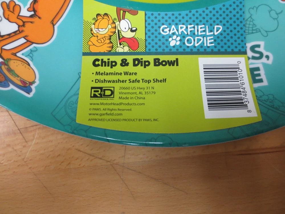 Brand new, first quality. This is an officially licensed Garfield & Odie Chip & Dip Bowl. Made from super durable melamine plastic. Top shelf dishwasher safe. Lightweight. Empty tray weighs about 12 ounces. Let your favorite cartoon characters Garfield and Odie add a little flair to your next gathering or event. This versatile tray measures about 13 inches across. The bowl molded into the center measures about 1 1/2 inches deep. This tray works great as a chip & dip bowl, a cheese platter, veggie tray, and other uses you will undoubtedly invent. Let your creativity blossom. If you are a Garfield fan, cat with an attitude that he is, add this versatile piece to your collection. Free shipping to any eBay or PayPal confirmed CONUS address.