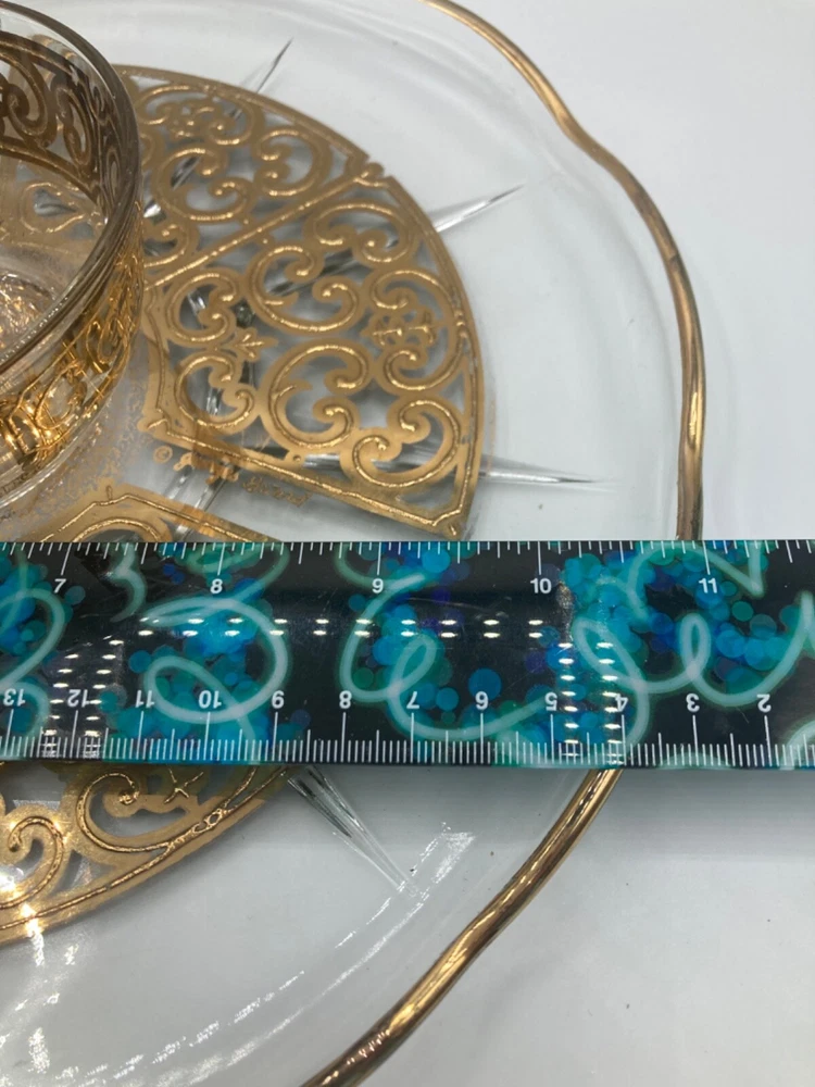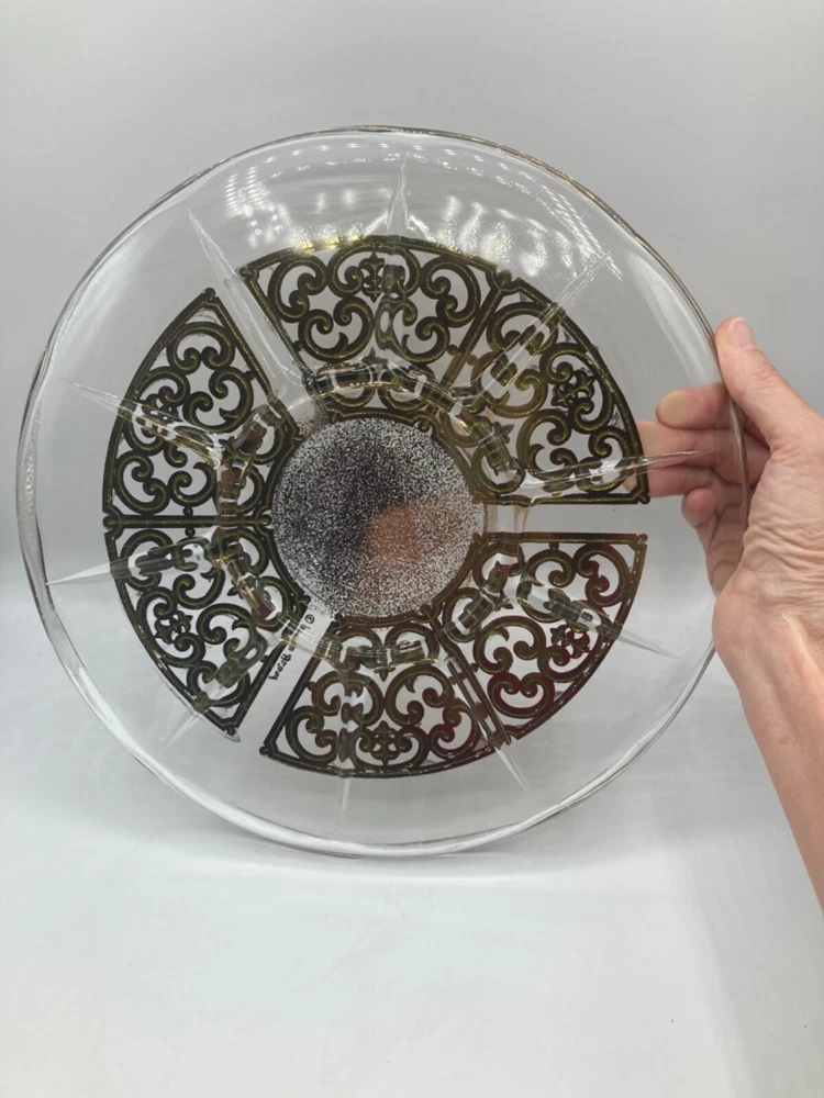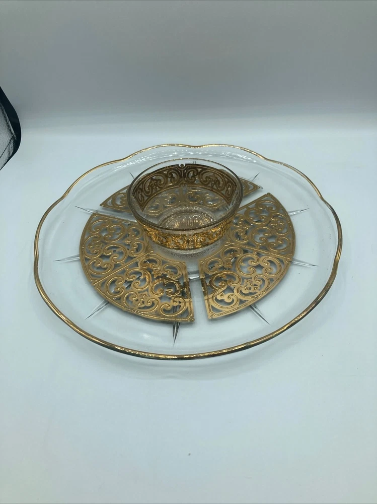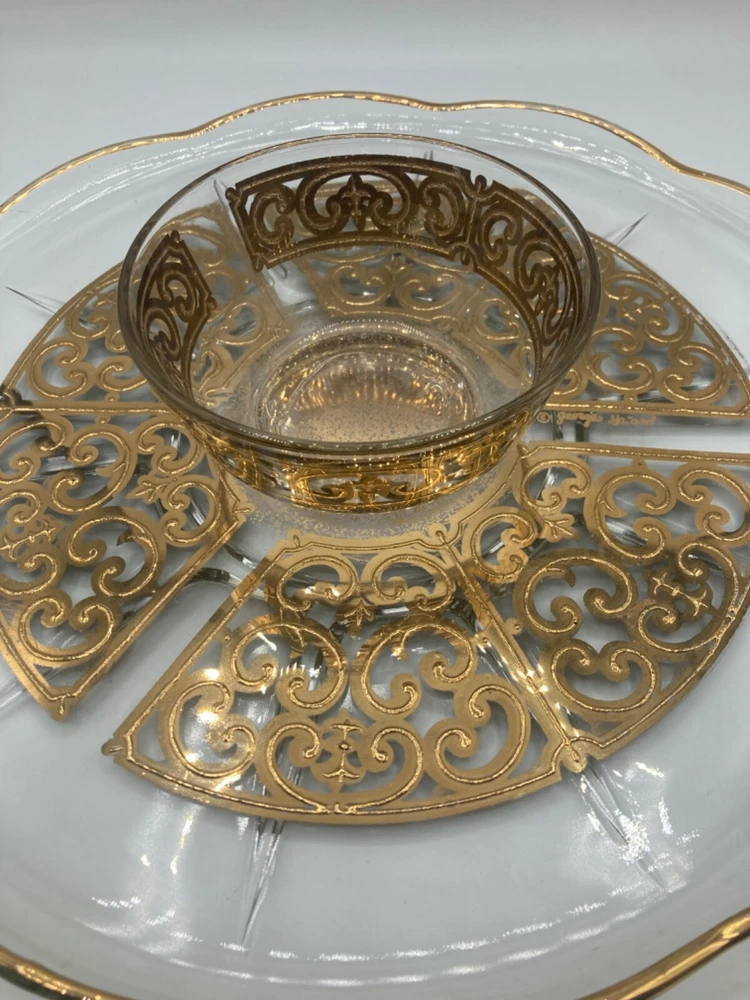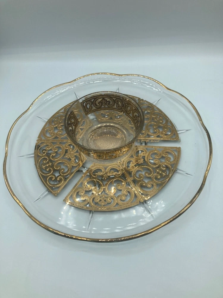 Add a touch of vintage elegance to your serving collection with this Georges Briard Gold Foil Glass Chip/Dip platter set. This set includes a large round platter with an 11-inch diameter and a matching serving bowl, perfect for entertaining guests. The gold foil detailing adds a glamorous touch to the clear glass, making it an eye-catching addition to any table setting.Crafted from high-quality glass, this serving set is not only beautiful but also durable and functional. Use it to serve chips, dips, or any other appetizers and impress your guests with the sophisticated presentation. Ideal for any occasion, from intimate dinner parties to large gatherings, this Georges Briard Chip/Dip platter set is a must-have for any host or hostess.