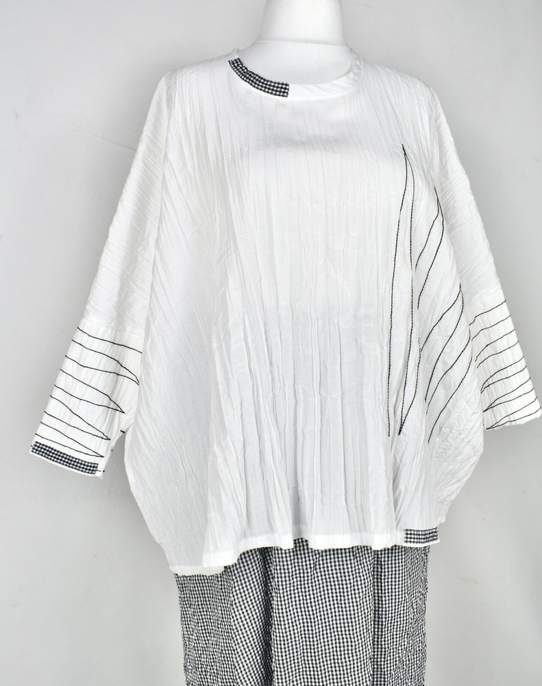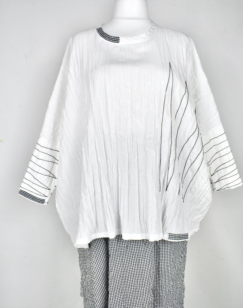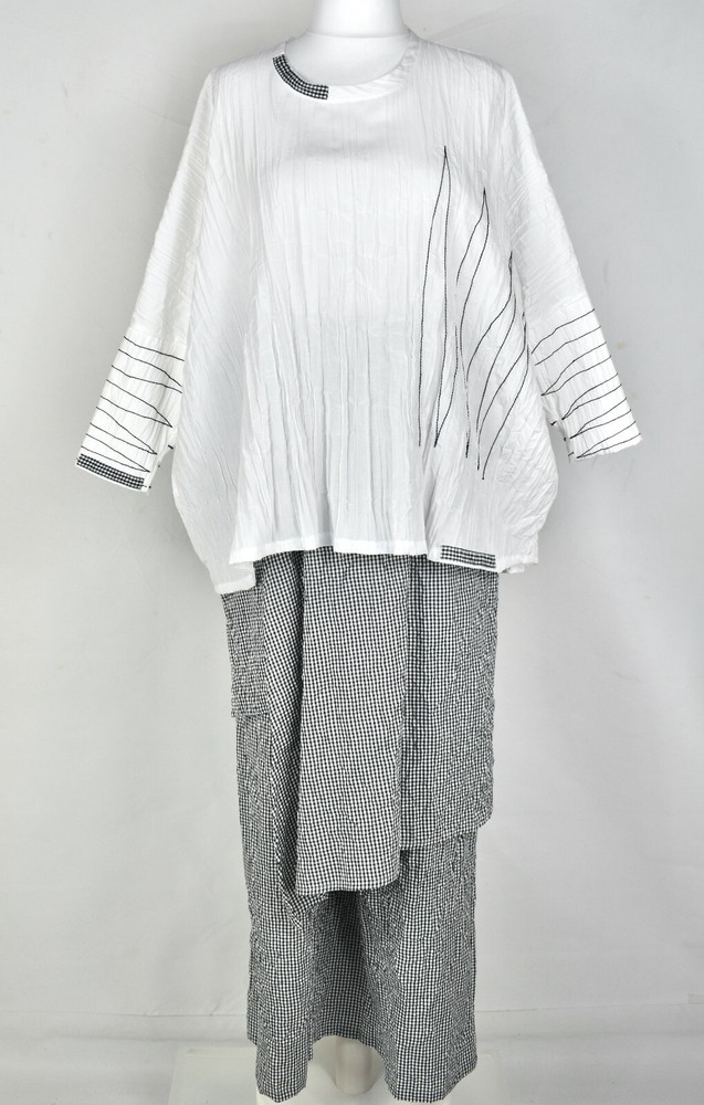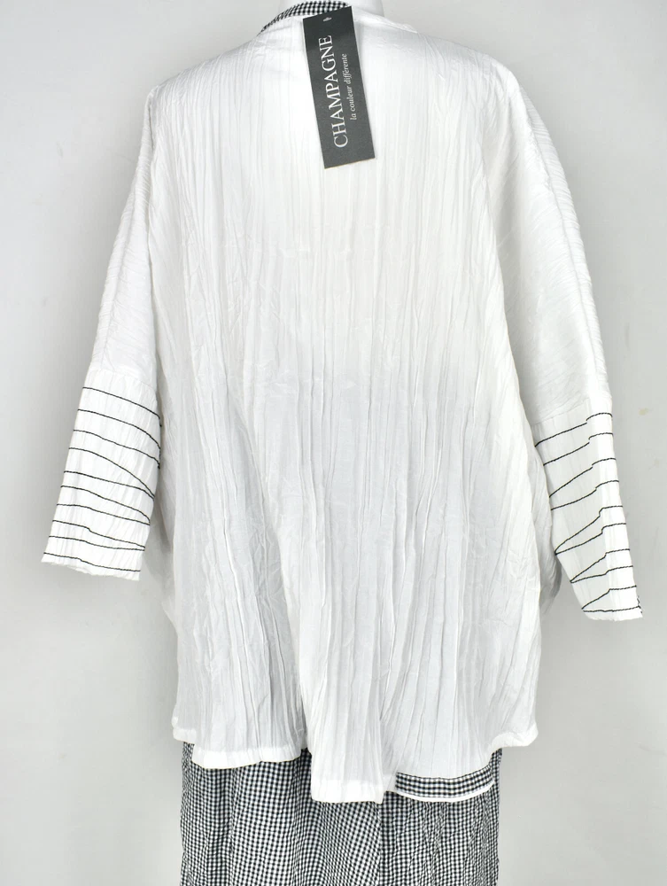 Stunning Asymmetric dipTunic by German Designer Champagne white crinkle fabric with black contrasting destail Long sleeve Crinkle pattern detail Size L/XL/XXL Measures 30+ inches across the front to achieve the relaxed look Length is 34 inches to lngest point