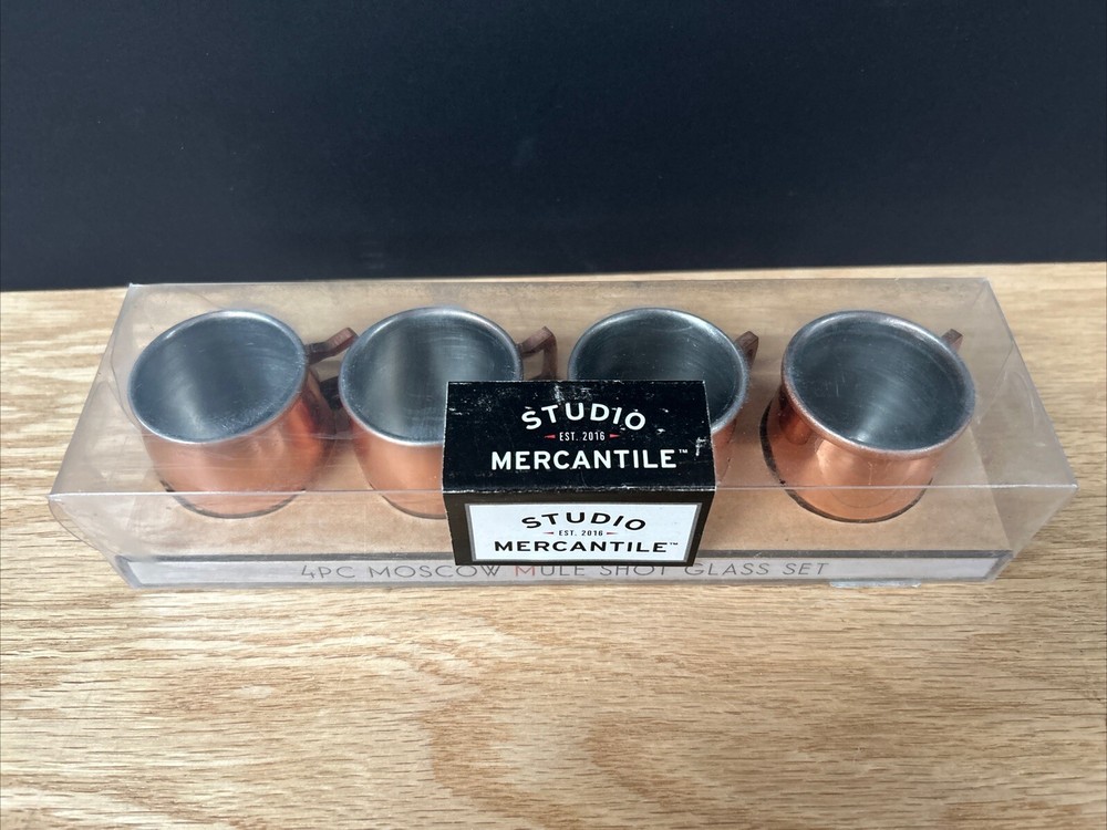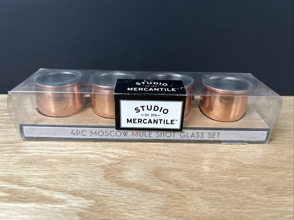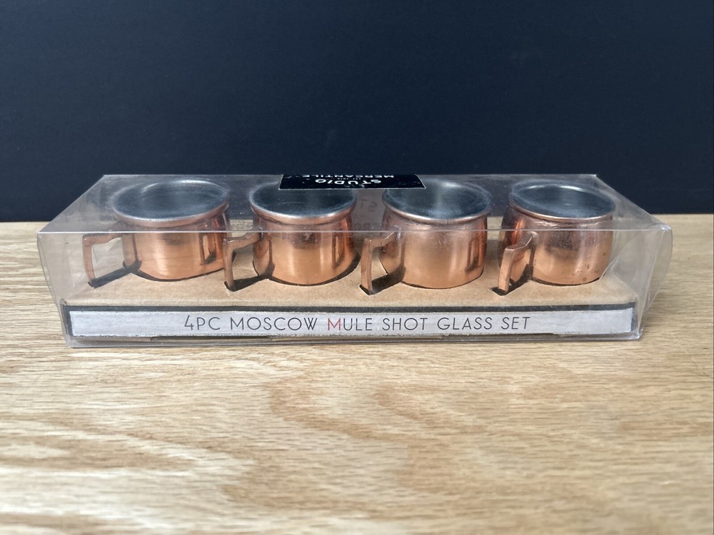 Elevate your drinking experience with this Studio Mercantile Moscow Mule mug set. The four-piece set includes solid copper, round-shaped shot glasses that are perfect for all occasions. Each mug has a unique, handmade design and features the classic Moscow Mule theme. Crafted in India, these copper mugs are of high quality and are perfect for a service of four. The set includes mugs that are perfect for enjoying your favorite drinks, whether you're hosting a party or just relaxing at home. This traditional style mug set is a must-have for any cocktail lover.