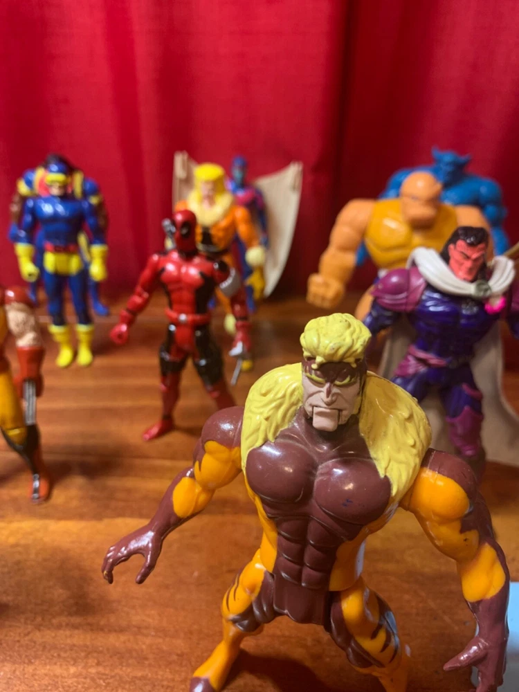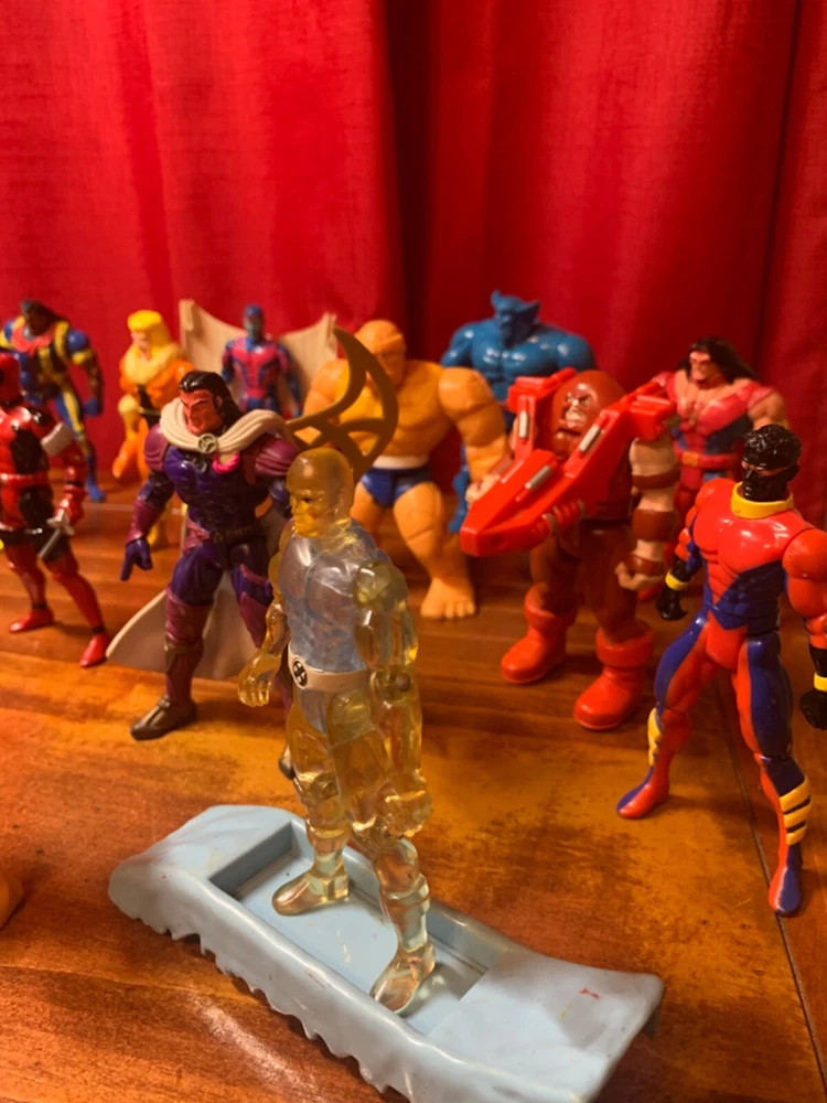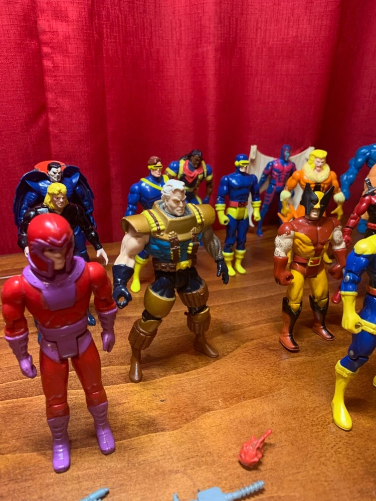Gigantic Lot of X-Men, Fantastic Four and X-Force Action Figures and Accessories. Some wear, tear, discoloration and chipping. Morph main face right eye area was painted. Warpath arm was wired together. Wolverine mask is broken. As is