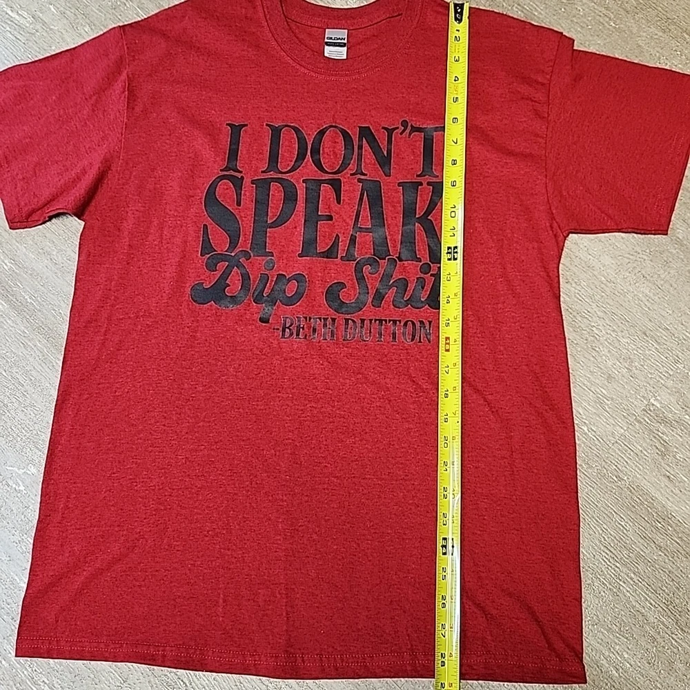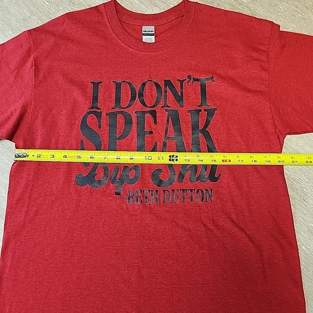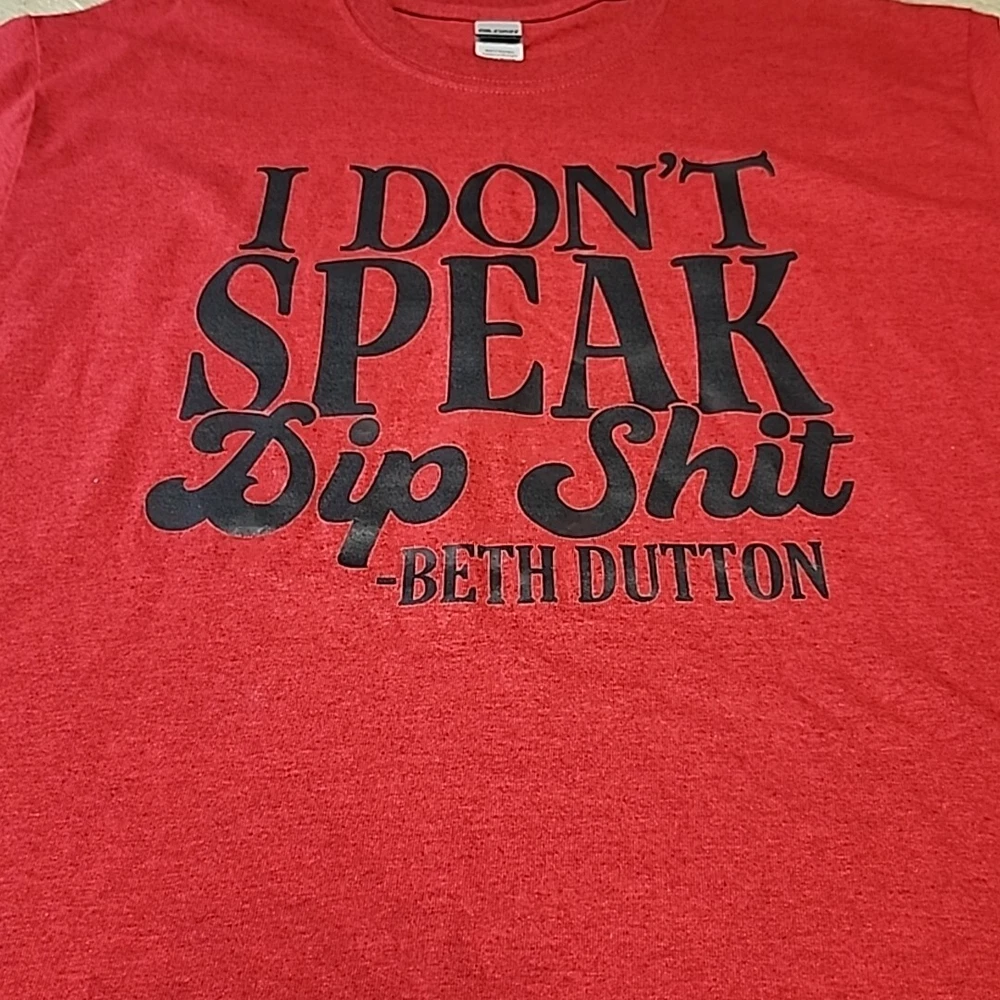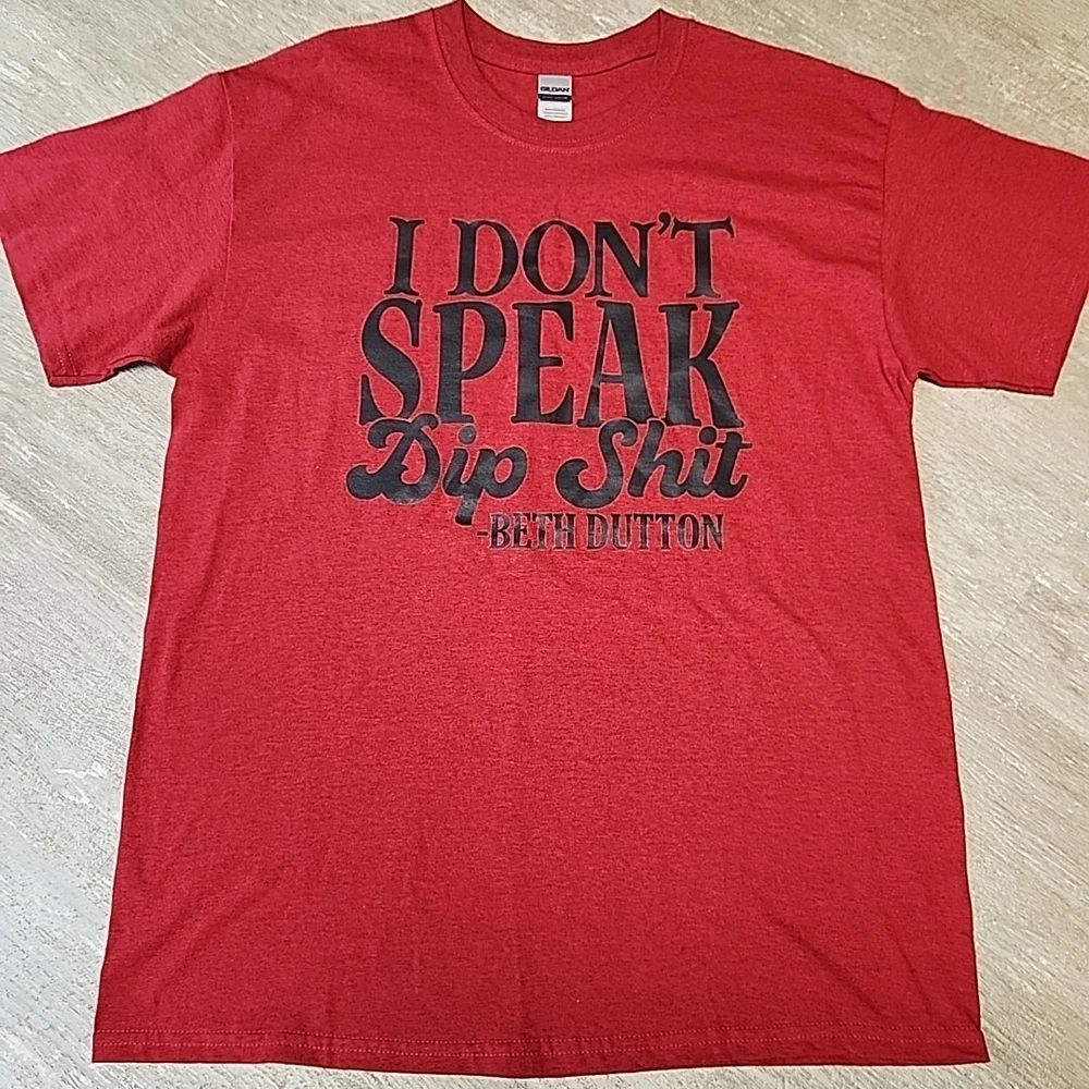 This Gildan custom t-shirt in size L features a solid redish color with a crew neck and short casual sleeves. Made of 100% cotton, the shirt is designed for unisex adults and has a basic style with a humorous "I Don't Speak Dip Shit-Beth Dutton" slogan referencing the TV show Yellowstone and the character Beth Dutton. The heavy cotton material makes it suitable for all seasons, and it is perfect for fans of Yellowstone or those looking for a fun and comfortable tee. New without Tags. A friend made it for me, because I like Yellowstone but I don't wear shirts with a bad word on it.