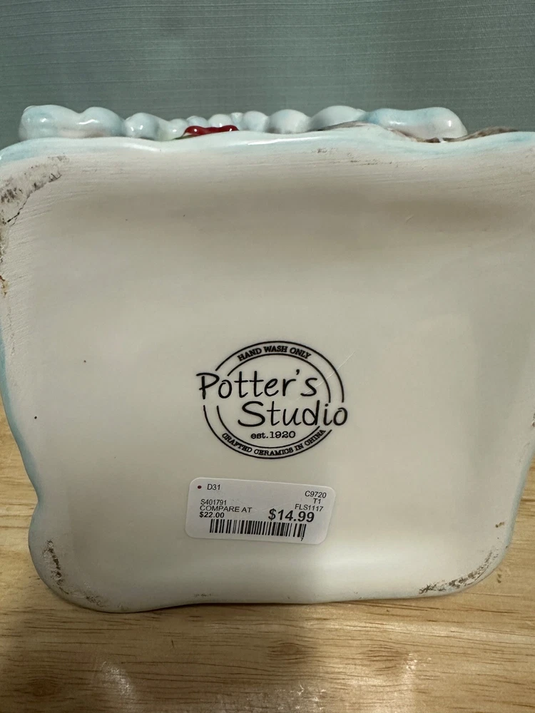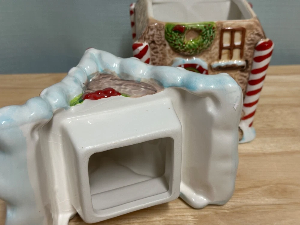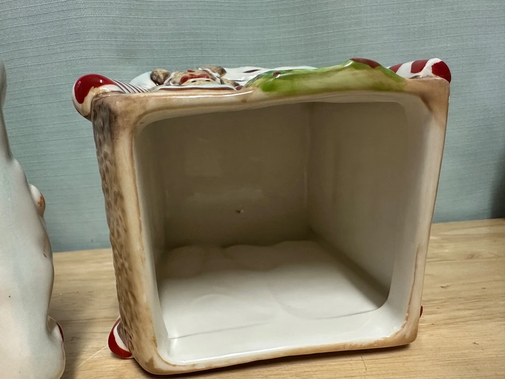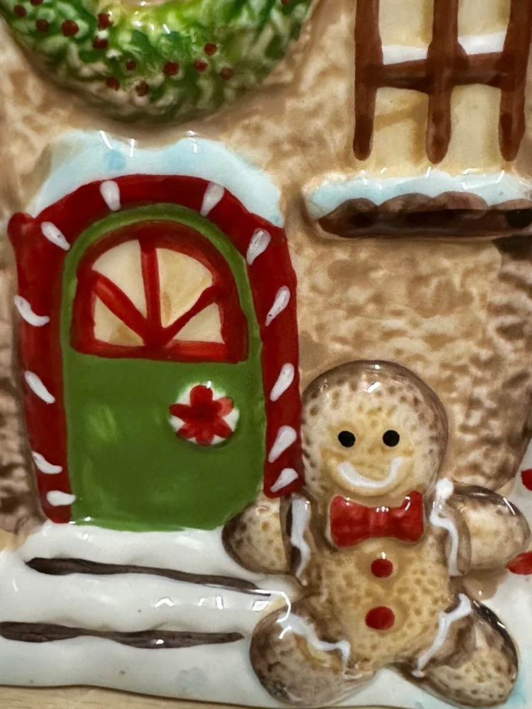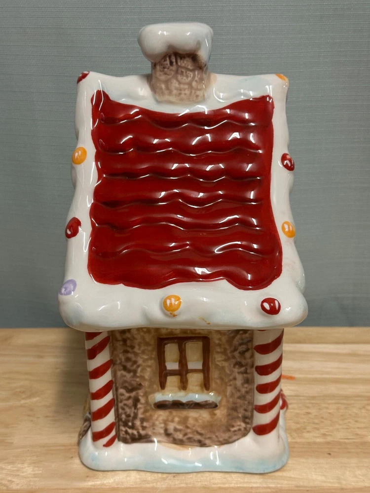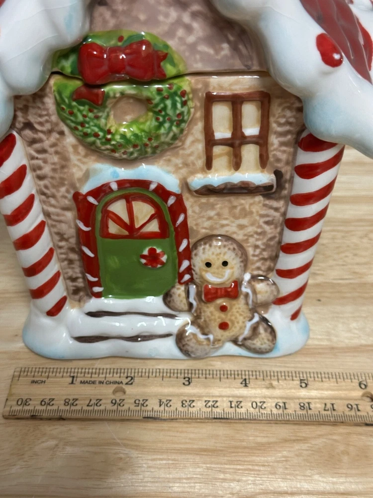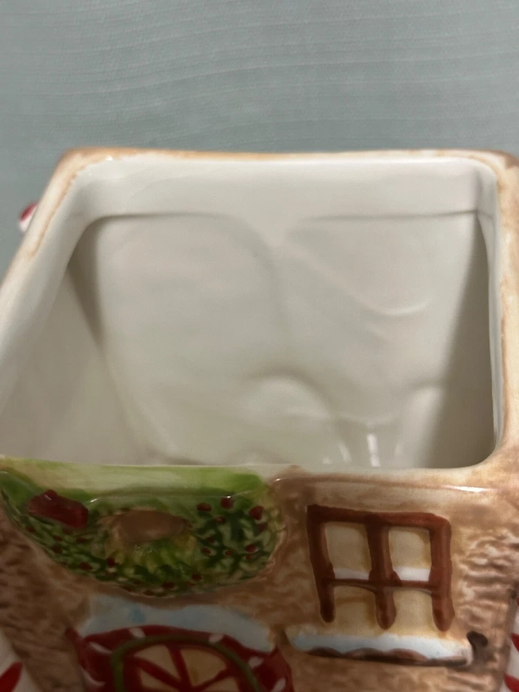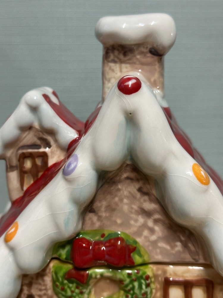Gingerbread House Cookie Jar from Sleigh Bell Potter's studio This whimsical gingerbread house cookie jar is a delightful addition to your holiday decor. Crafted with attention to detail, it captures the festive spirit of Christmas and adds a touch of charm to any kitchen or display. Design and Features: Material: Made from high-quality ceramic, ensuring durability and a smooth, glossy finish. Dimensions: 10 inches, making it a substantial piece for your holiday display. Details: The cookie jar is designed to resemble a classic gingerbread house, complete with intricate details such as candy canes, gumdrops, and icing decorations. The roof is adorned with colorful candies, and the windows and doors are outlined with white icing. Colors: The jar features a vibrant color palette, including rich browns for the gingerbread, bright reds and greens for the candies, and white for the icing. These colors are hand-painted, adding to the jar’s festive appeal. Functionality: The lid of the jar lifts off to reveal a spacious interior, perfect for storing cookies, treats, or other holiday goodies. The lid fits securely to keep contents fresh. Collectibility: Due to their unique design and seasonal theme, these cookie jars are highly sought after by collectors and can be a cherished addition to any holiday decor collection Usage: Decorative: Ideal for display during the Christmas season, whether on a kitchen counter, mantel, or as part of a festive centerpiece. It can also be a charming addition to a vintage or themed holiday decor. Functional: Perfect for storing holiday cookies and treats, adding a touch of nostalgia and festivity to your home.