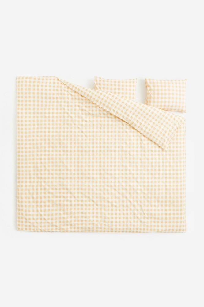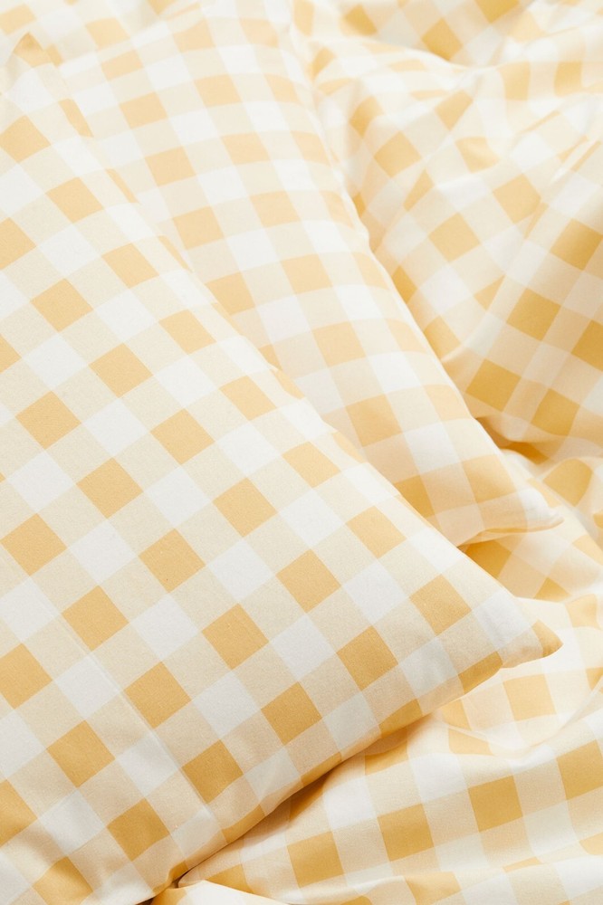 GINGHAM CHECK DUVET 100% cotton. Machine wash. Imported. Measurements 88 in. by 92 in. Shams 20 in. by 26 in. Auction is for QUEEN Duvet with TWO STANDARD PILLOWCASES Color available is YELLOW Item is BRAND NEW in ORIGINAL PACKAGING!