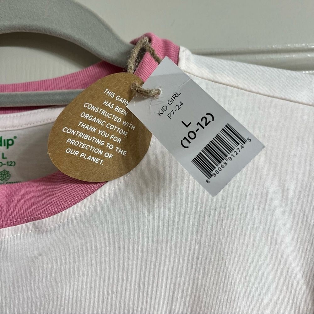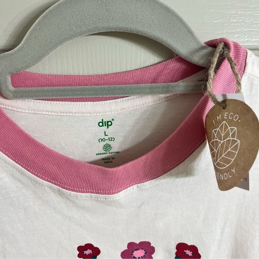 Adorable New with Tags organic cotton graphic floral tee for the book lover in your life! Brand: Dip Girls/Kids size large 10-12 Let your imagination Bloom Smoke free pet free home Shipped within 2 business days This charming kids' tee features a vibrant floral graphic with the inspiring message 'Let Your Imagination Bloom.' The white and pink color combination adds a playful touch, perfect for everyday wear.