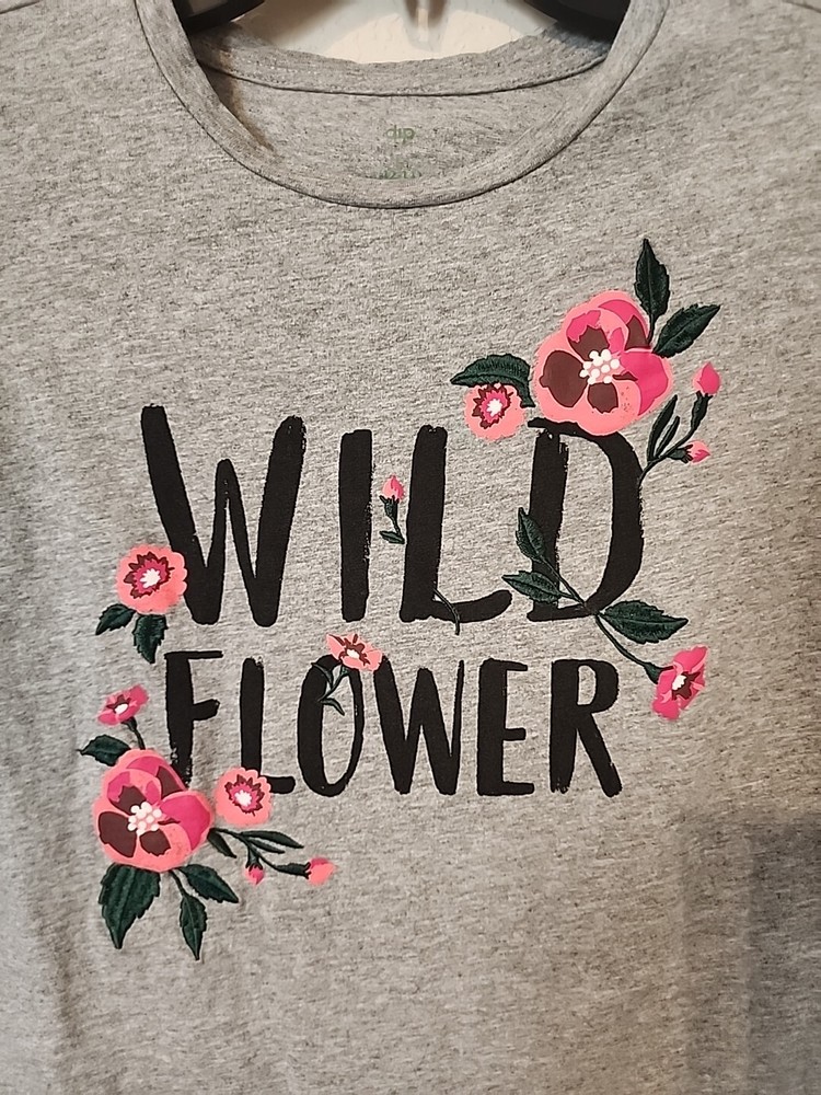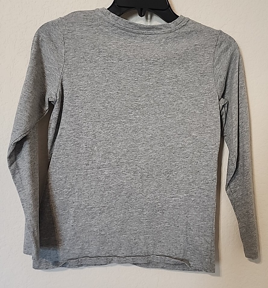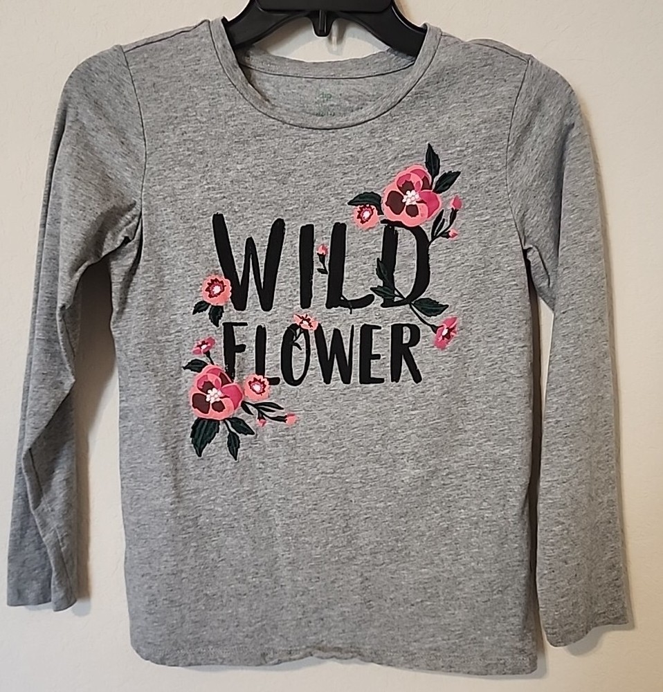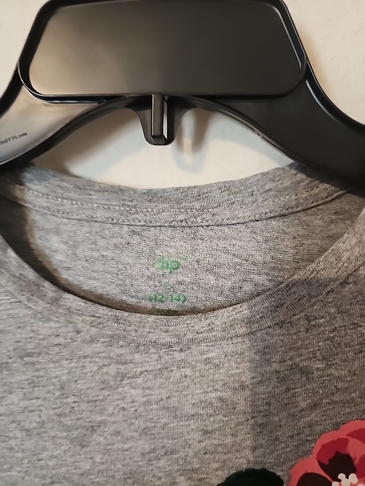 This girls' long sleeve screen tee by dip is made of 100% cotton knit material and features a solid gray color with flower accents. The shirt has a crew neckline and pullover closure, making it perfect for casual, formal, or activewear occasions. It is machine washable and has a fabric wash of light, ensuring that it can be worn in all seasons. The shirt is a size L 12/14 and has a regular fit. It is a basic style tee with a theme of flowers, making it a great addition to any girl's wardrobe. The shirt has no tags and is not personalized, but it does feature letters as accents. It can be worn by girls in the department of sizes 4 & up.