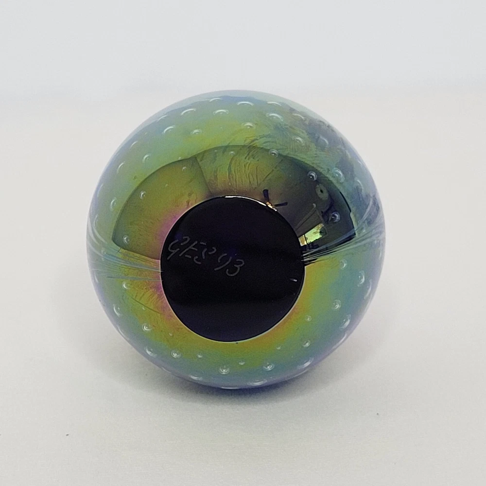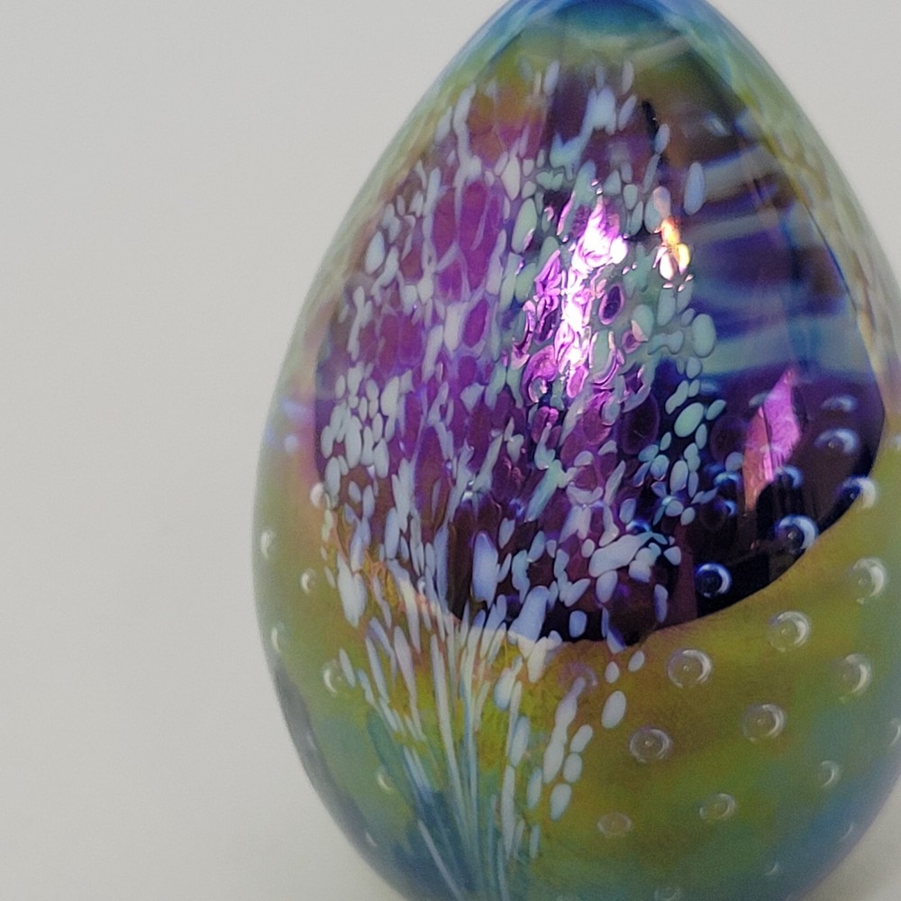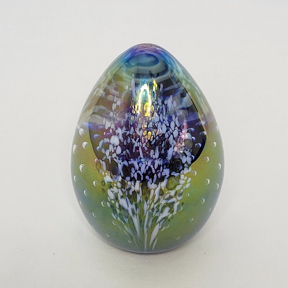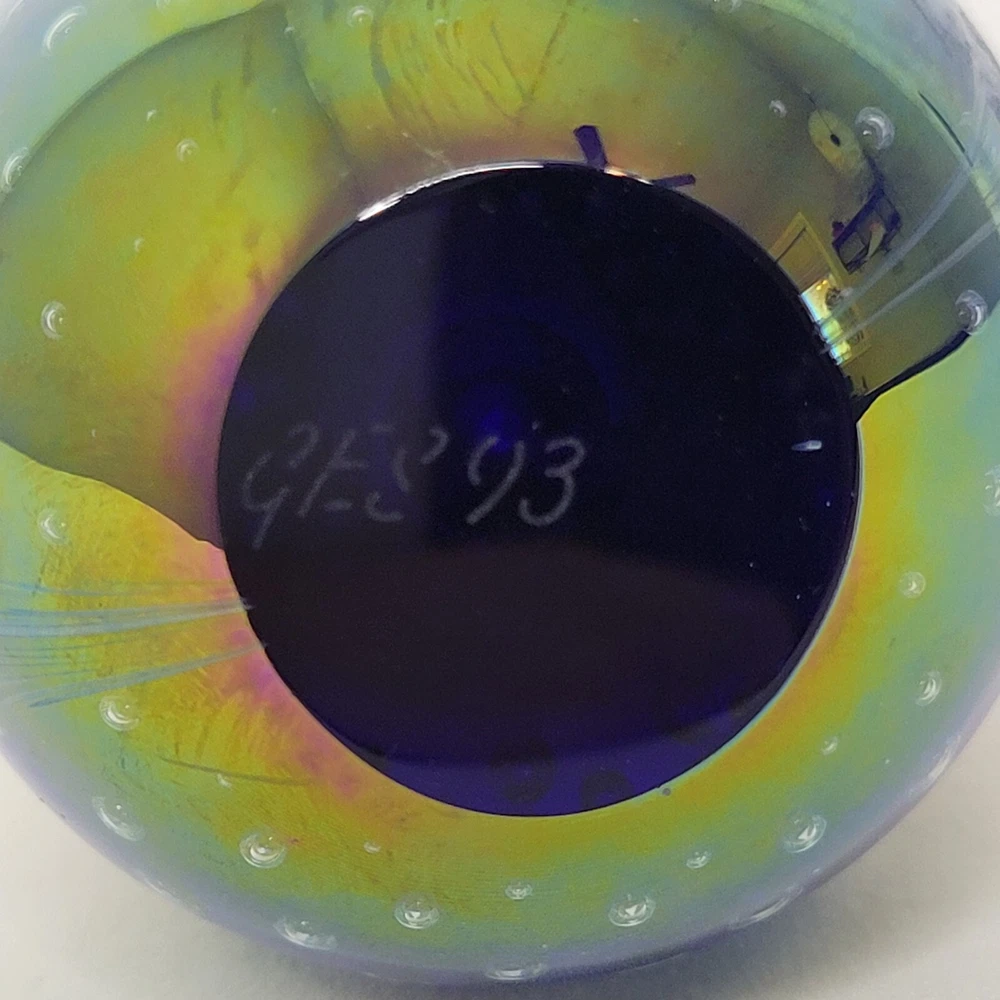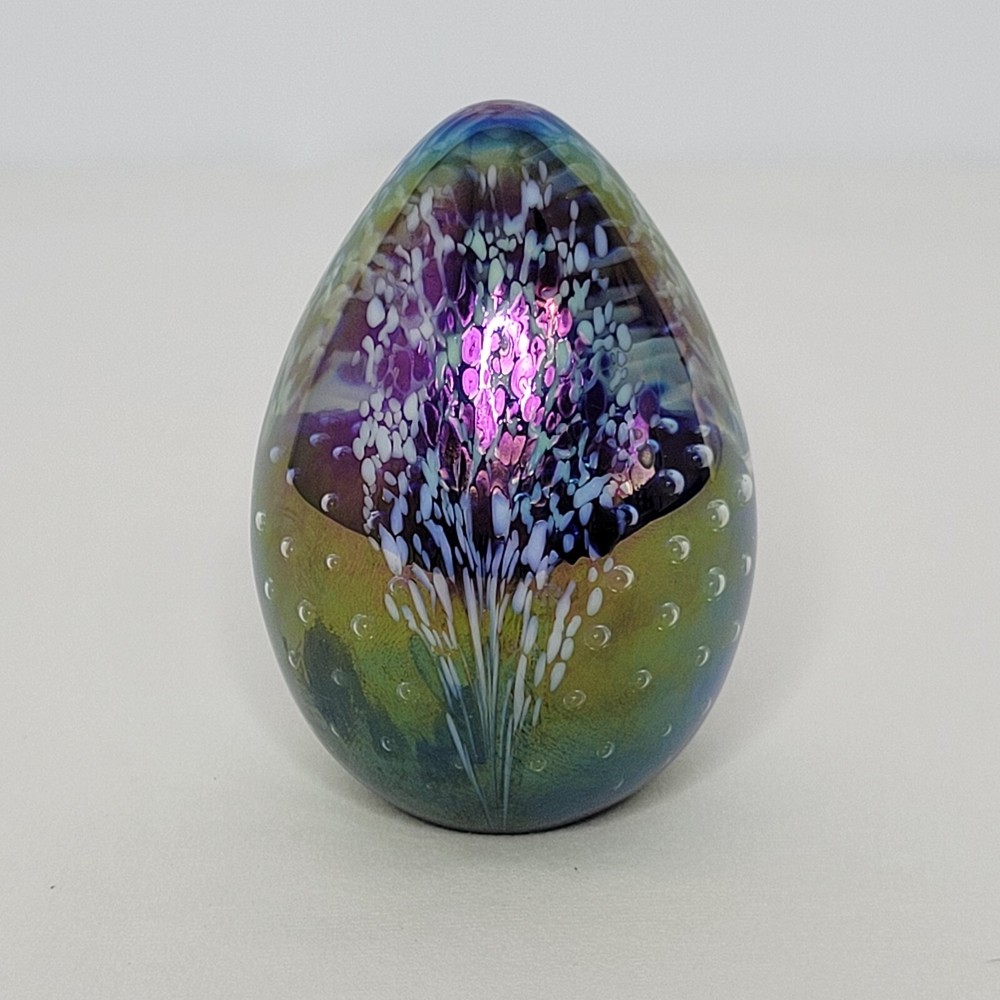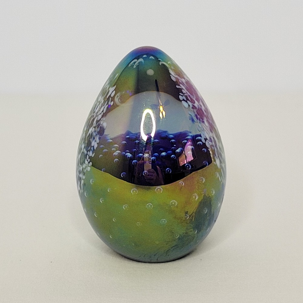 Glass Eye Studio 1993 Signed Iridescent Bubbles Egg Shaped Glass Paperweight 3.5" Tall x 2" Wide. Good Pre-Owned Condition, please see photos for more details. Thank you!