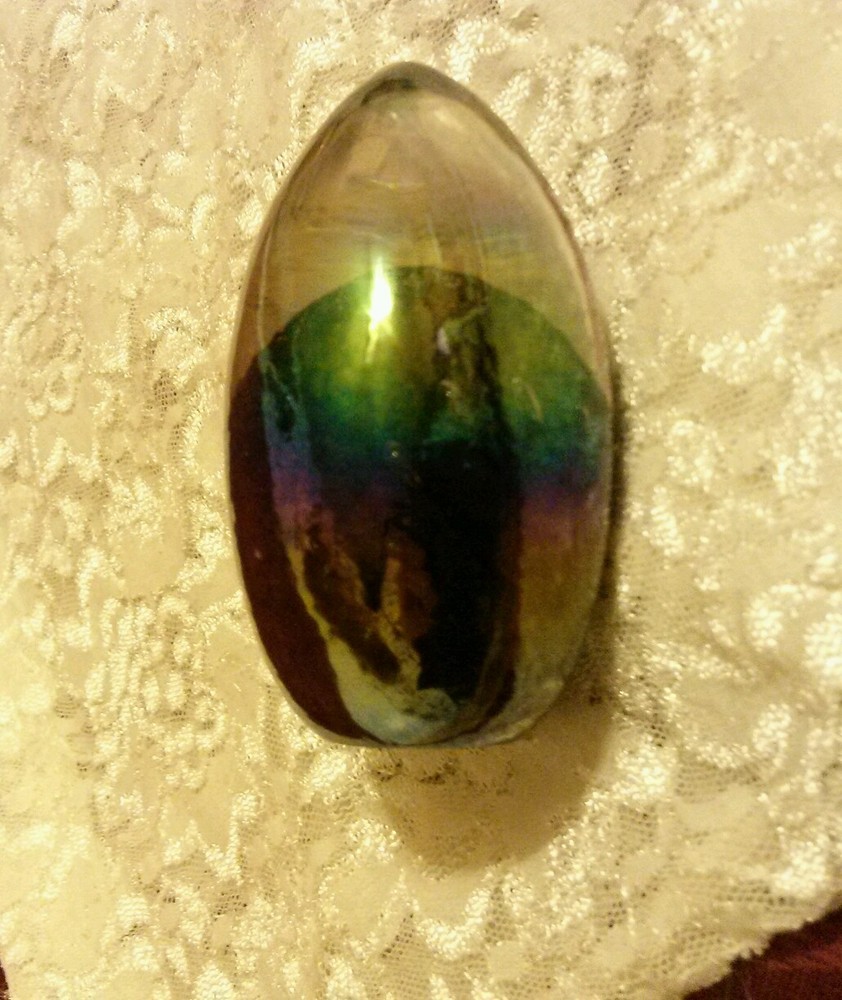Great Glass Eye Studio Irridescent/Dichroic Oval/Egg Shaped Paperweight from 1992 in EUC ! No original box. Beautiful shades of purples, blues, greens, mauves, silver in gorgeous shimmering irridescent metallic rainbow effect ! Has controlled bubbles in a pattern. Bottom is hand hallmarked/etched GES 92. Very nice decoration for Easter, Spring or all year long ! No cracks or chips. Looks very good. Just been sitting in my china hutch for the past 15 years. Measures approx. 3 1/2" tall. Just needs a light wipe down to remove finger smudges. I do not clean items prior to sale. Several years ago, I badly damaged 2 very expensive items while trying to clean them. Since that time, I leave the cleaning to the new owner, less expensive and safer :) ITEMS SOLD AS IS. PLEASE ASK QUESTIONS PRIOR TO BIDDING. THANK YOU ! Smoke Free home, but, we do have clean, groomed canine family members. Flat shipping charge of $ 7.99 for USA shipping via Fed Ex Smart Post or USPS Parcel and I pay the balance of shipping plus tracking and insurance costs. xxxxxxxxxxxxxxxxxxxxxxxxxxxxxxxxxxxxxxxxxxxxxxxxxxxxxxxxxxxx ALL INTERNATIONAL SALES ARE SENT VIA EBAY GLOBAL SHIPPING, ONLY.xxxxxxxxxxxxxxxxxxxxxxxxxxxxxxxxxxxxxxxxxxxxxxxxxxxxxxxxxxxx I only accept returns in the extremely rare situation if I have grossly misrepresented an item. And, although I'm human and can make an honest mistake, I'm very, very careful with my descriptions. If there is an issue, please let me know ASAP and I will be happy to work you. Lastly, I strive for all 5s in feedback.....so, I will gladly leave feedback for you after you receive your item, you're satisfied and have left feedback for me. If, due to inclement weather or another unforseen situation, I am unable to ship within one (1) business day AFTER I have received payment (which excludes Saturday, Sunday, and all Postal Holidays). I will email asap. That means, if you pay on Friday, your item will not ship until Monday. I volunteer at a nursing home on Sats and PO is closed whenever I'm finished for the day. After 2 days of non-payment, the Ebay Automatic Non Paying Bidder Service will open a non-payment claim. ****PLEASE BE ADVISED, SINCE 99% OF MY ITEMS ARE STORED IN LARGE, CLEAN RUBBERMAID CONTAINERS, I ADD A LAUNDRY DRYER SHEET TO EACH CONTAINER. SO, THERE MAY BE A SCENT OF FRESH LAUNDRY SHEET TO YOUR ITEM, WHICH DOES DISSIPATE WITHIN A SHORT PERIOD OF TIME. I DO THIS TO KEEP CARDBOARD BOXES AND PACKING PAPER FROM HAVING A STORED ODOR. IF YOU HAVE A PROBLEM WITH THE SCENT OF LAUNDRY DRYER SHEETS, PLEASE DON'T BID ON MY AUCTIONS. I'VE NEVER HAD AN ISSUE WITH ANY OF MY AUCTIONS DUE TO MY STORAGE METHODS, BUT, I JUST WANT TO KEEP PEOPLE INFORMED. Regardless of the shipping method stated in the listing, All items will be shipped via Fed Ex Smart Post or USPS Standard Ground 2-9 business days for arrival. However, If close in cost, I will ALWAYS upgrade. International sales will continue to be shipped via Ebay Global Shipping, only Thank you for your understanding.