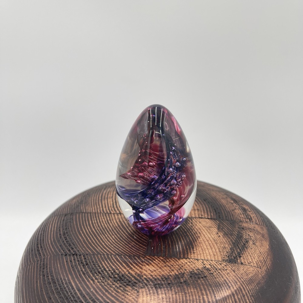 This beautiful paperweight from Glass Eye Studio features a swirl pattern in a vibrant purple color. The egg-shaped design and art glass production style make it a unique and decorative piece for any collection. The incised backstamp indicates the year of manufacture, which is 1999, and it falls under the late 20th century era. The material used for this paperweight is glass and it belongs to the studio type category. Its intricate swirl pattern and purple color make it an eye-catching piece, perfect for display. This vintage paperweight is a must-have for collectors and enthusiasts of glassware and decorative pottery.