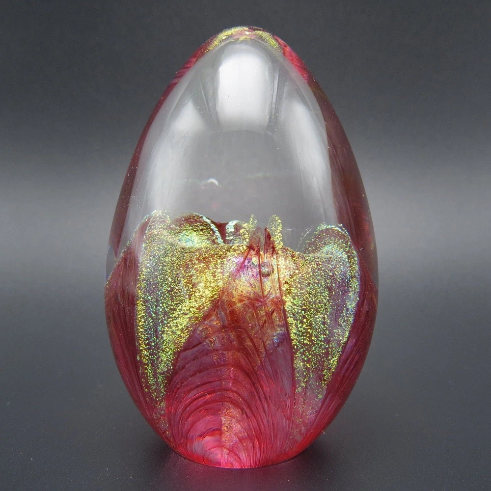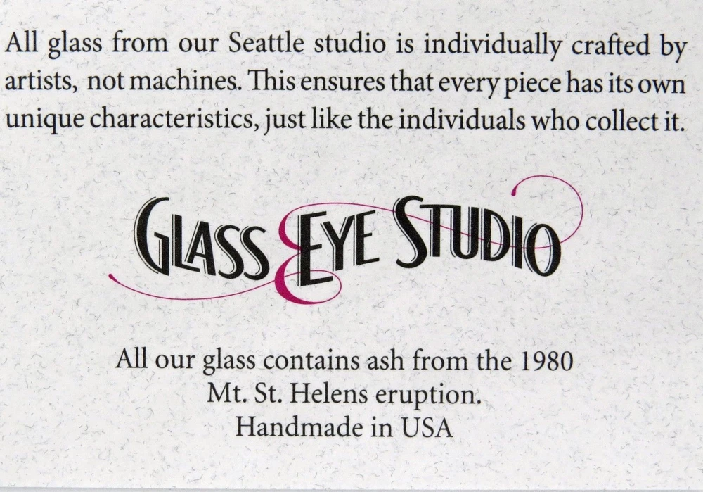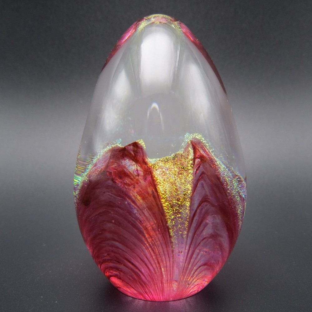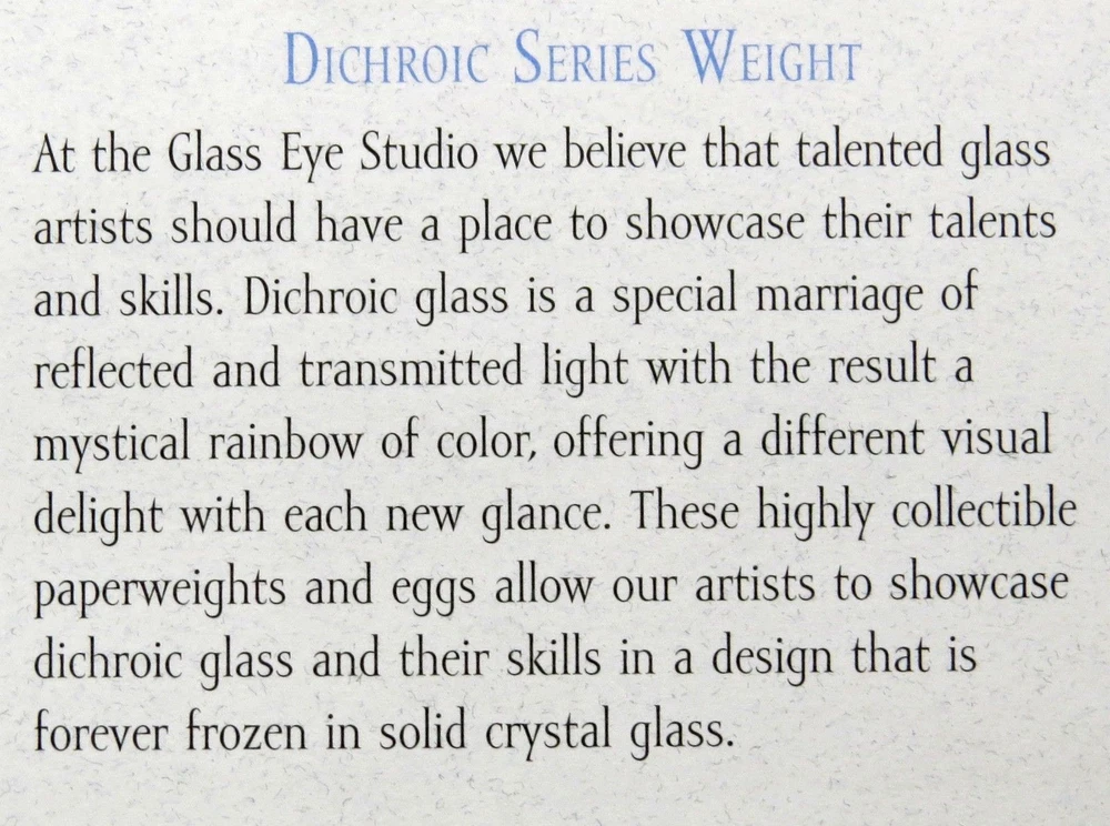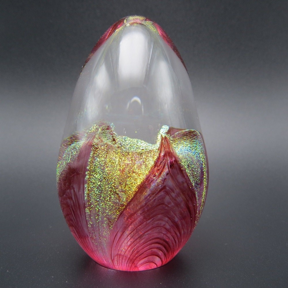 One of the world's oldest symbols, the image of an egg representing the magic of new life. Dichroic Egg Series: Cranberry Passion Flower Approximately 2 1/2 inches tall Egg photos are of the exact egg you will be purchasing Individually hand crafted by artist in Seattle Washington Each egg contains ash from the 1980 Mt St. Helens eruption Glass Eye Studio has produced egg weights since 1978 Lighted display not included Holidays and Memories is proud to offer beautiful creations by Glass Eye Studio. Glass Eye Studio was established in Seattle in 1978 when the Northwest glass scene was just starting to take off. Today, Seattle is a glass design Mecca and glass Eye Studio is a leading producer of innovative glass designs. The Glass Eye design team consistently produces designs and styles unique to Glass Eye Studio using innovative methods and vivid modern colors combined with traditional techniques and classic forms. Made in Seattle, Washington USA.