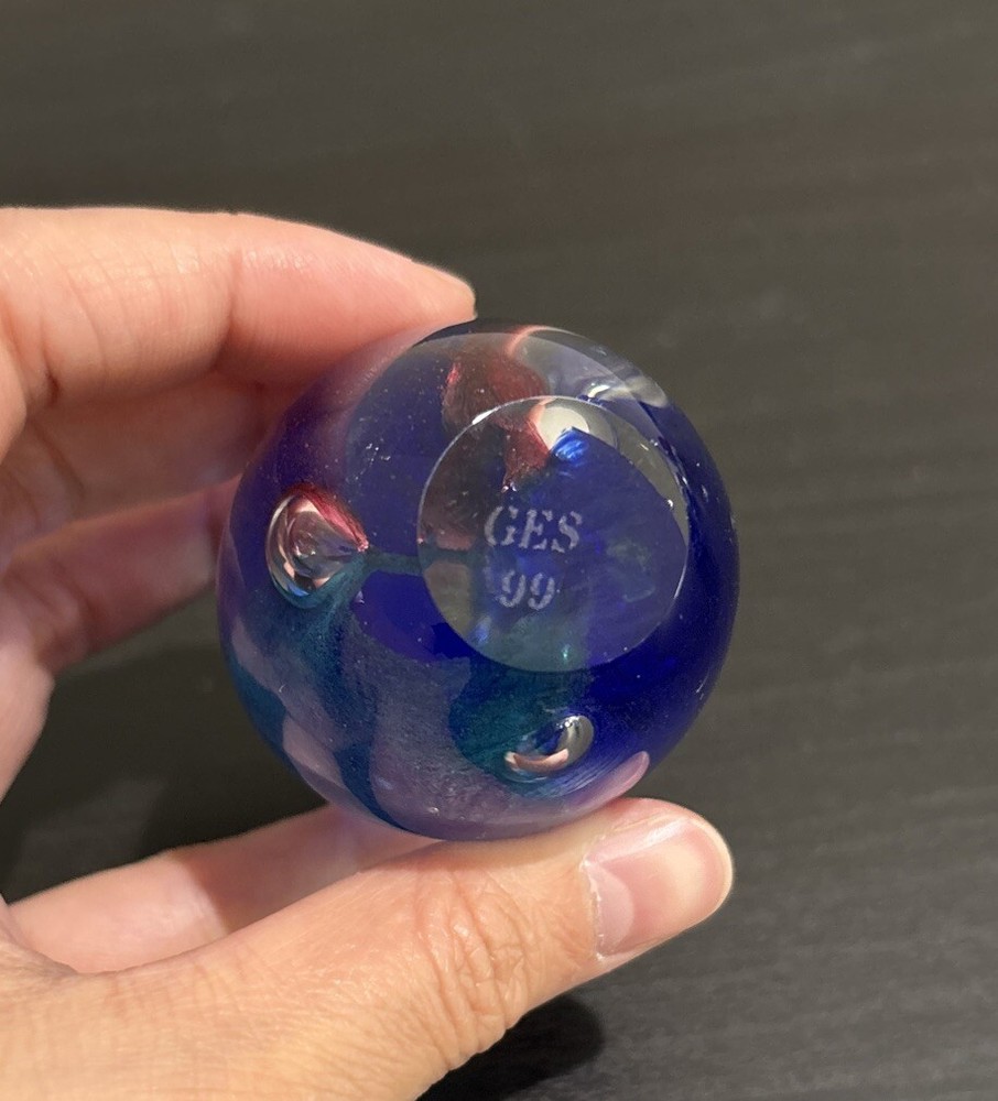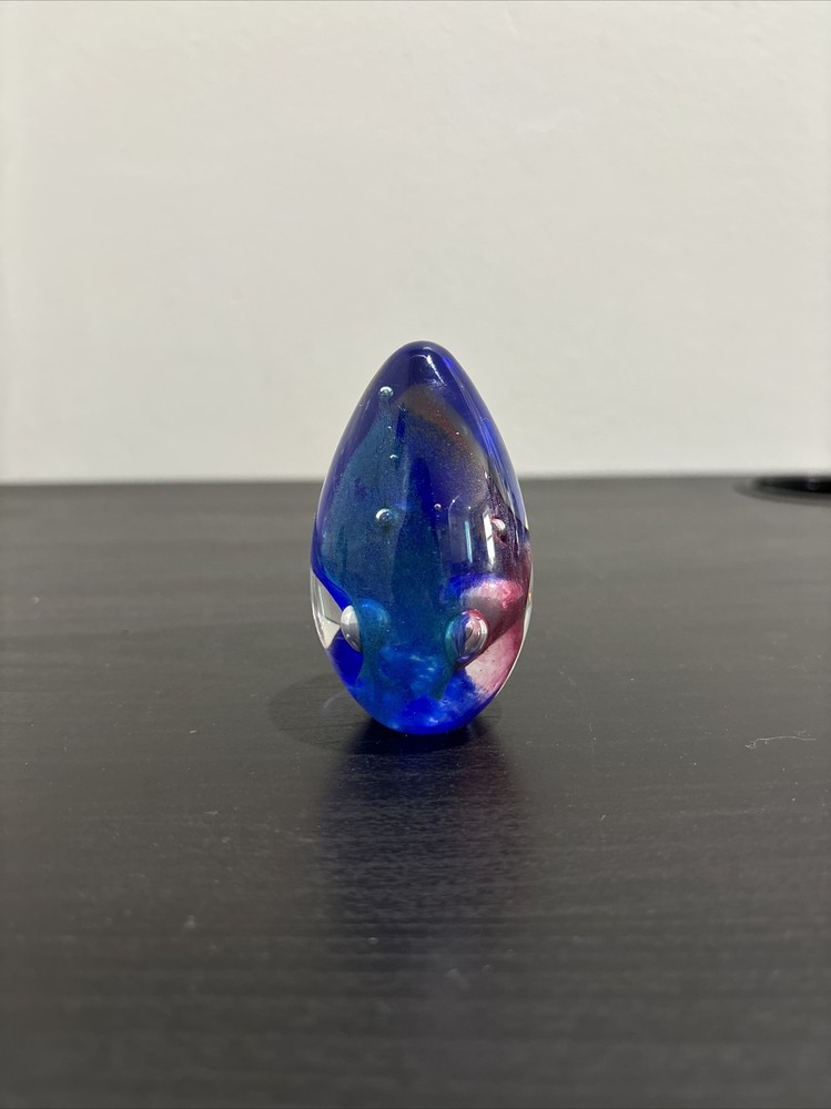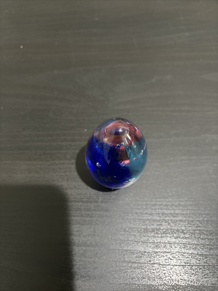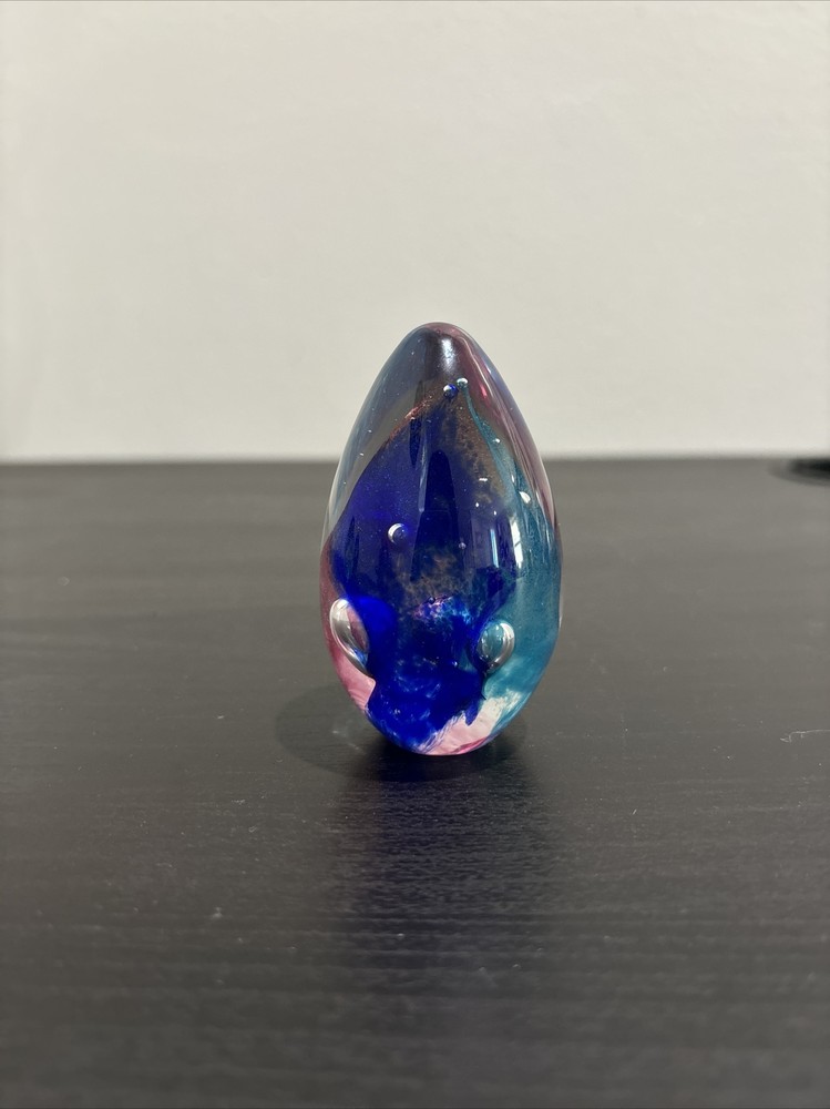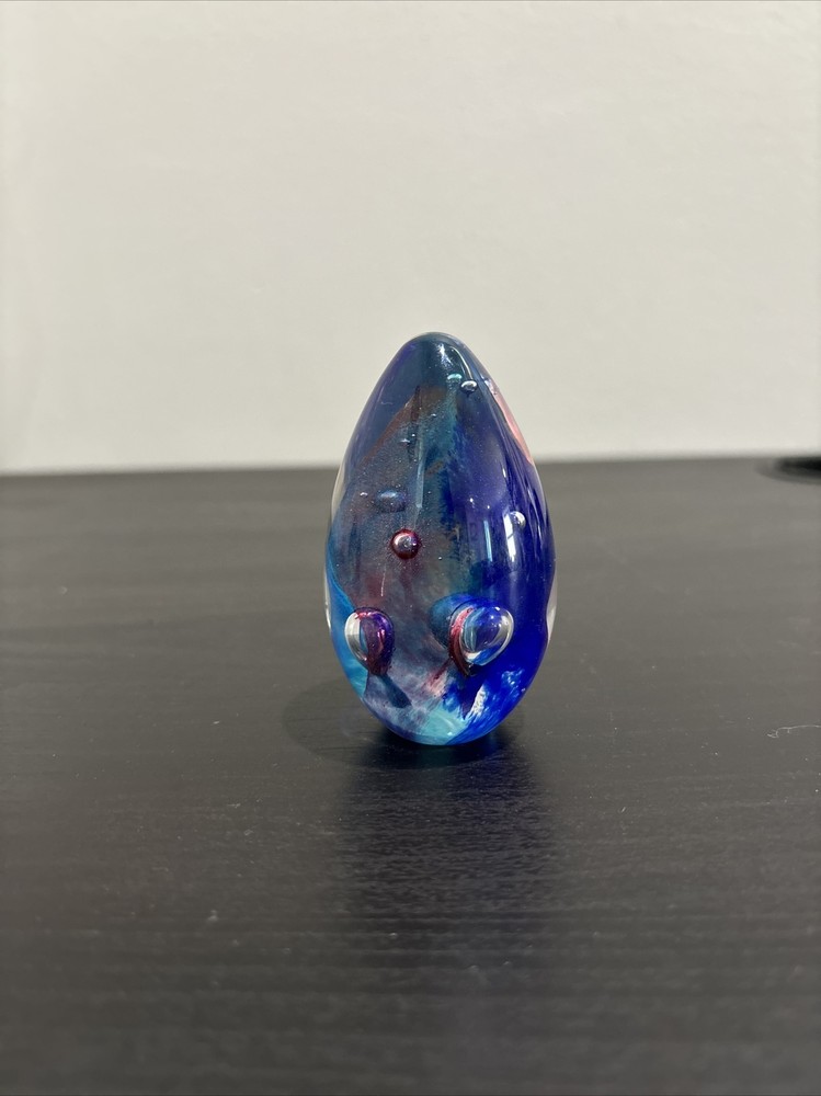 This stunning hand-blown glass paperweight is a true work of art! The gorgeous swirls of blue, teal, and pink create a mesmerizing bubble effect inside the smooth egg shape. It feels substantial and high-quality, with a beautiful glossy finish that catches the light. The artist's signature and GES 99 mark prove it's an authentic Glass Eye Studio piece. Perfect for displaying on a desk or shelf—it always draws compliments! The colors are even more vibrant in person. A must-have for art glass collectors!