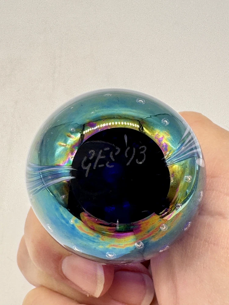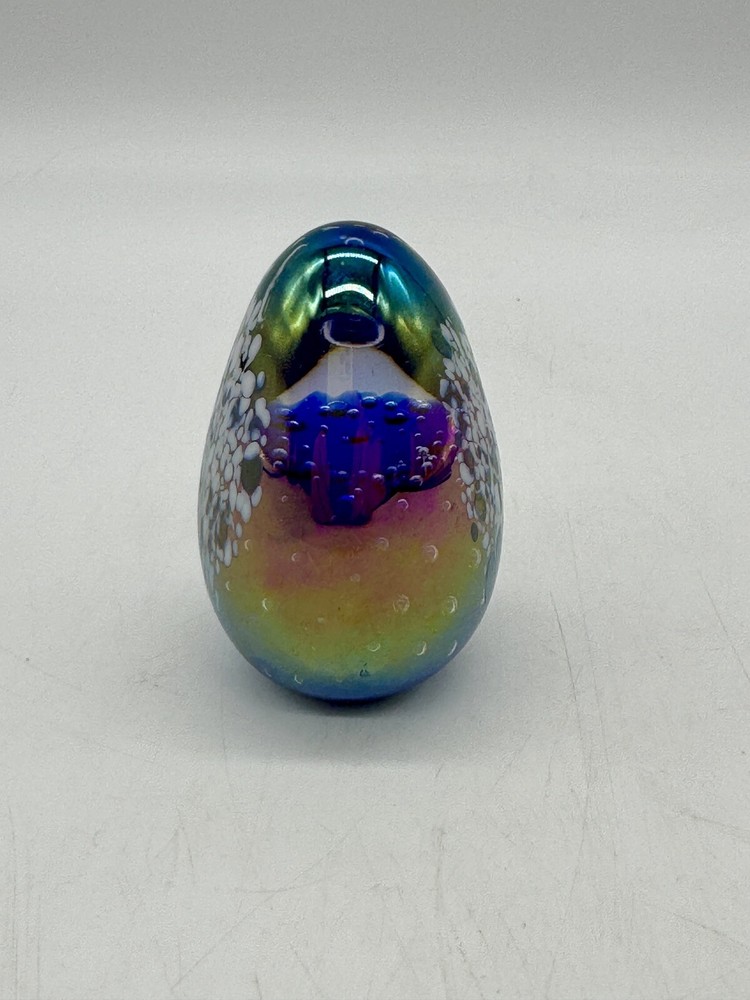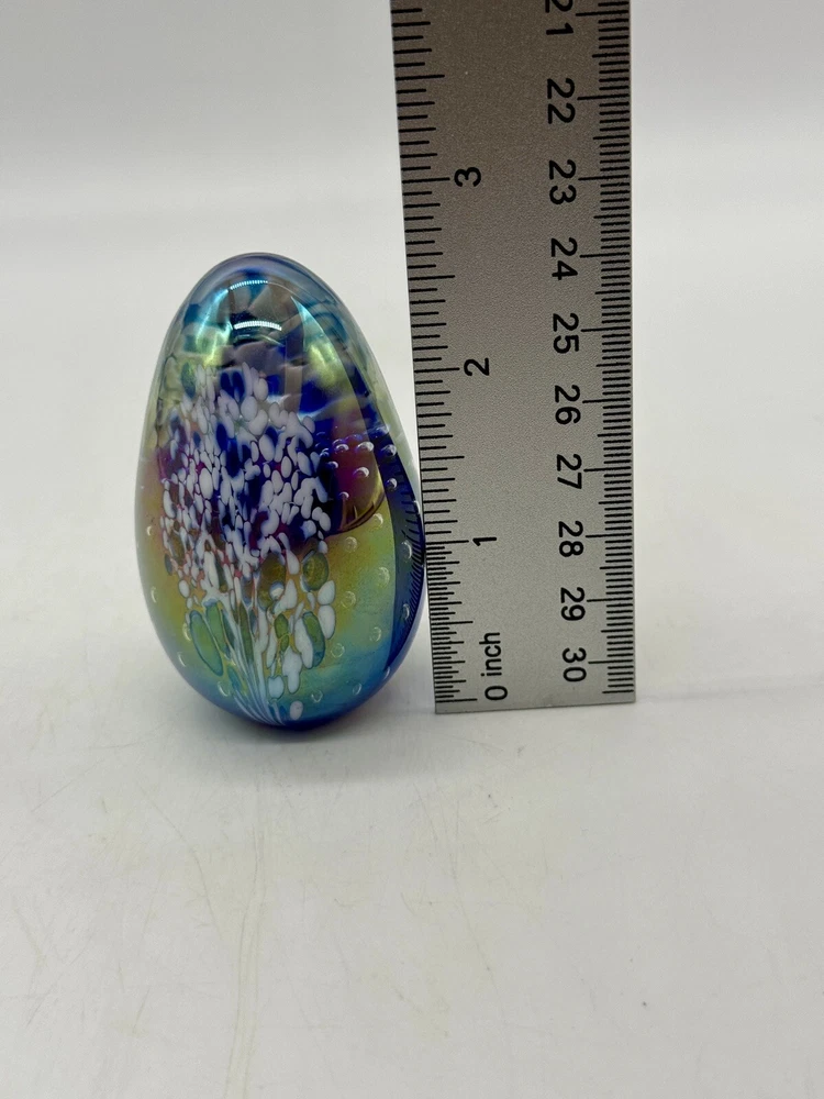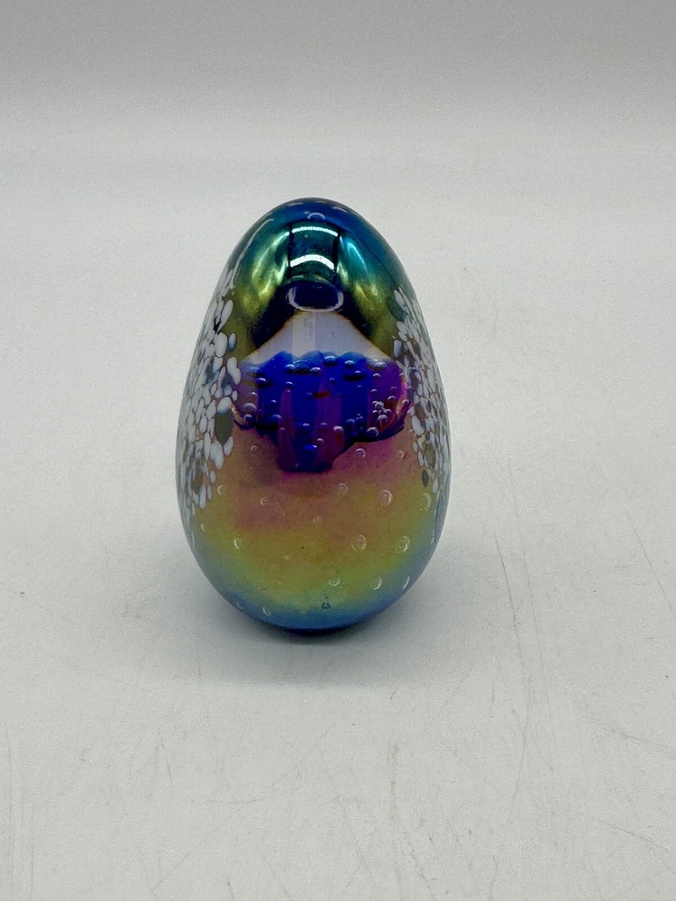 Glass Eye Studio Egg Shaped Iridescent Paperweight Multicolor Signed GES ‘93. Condition is Used. Shipped with USPS Ground Advantage.