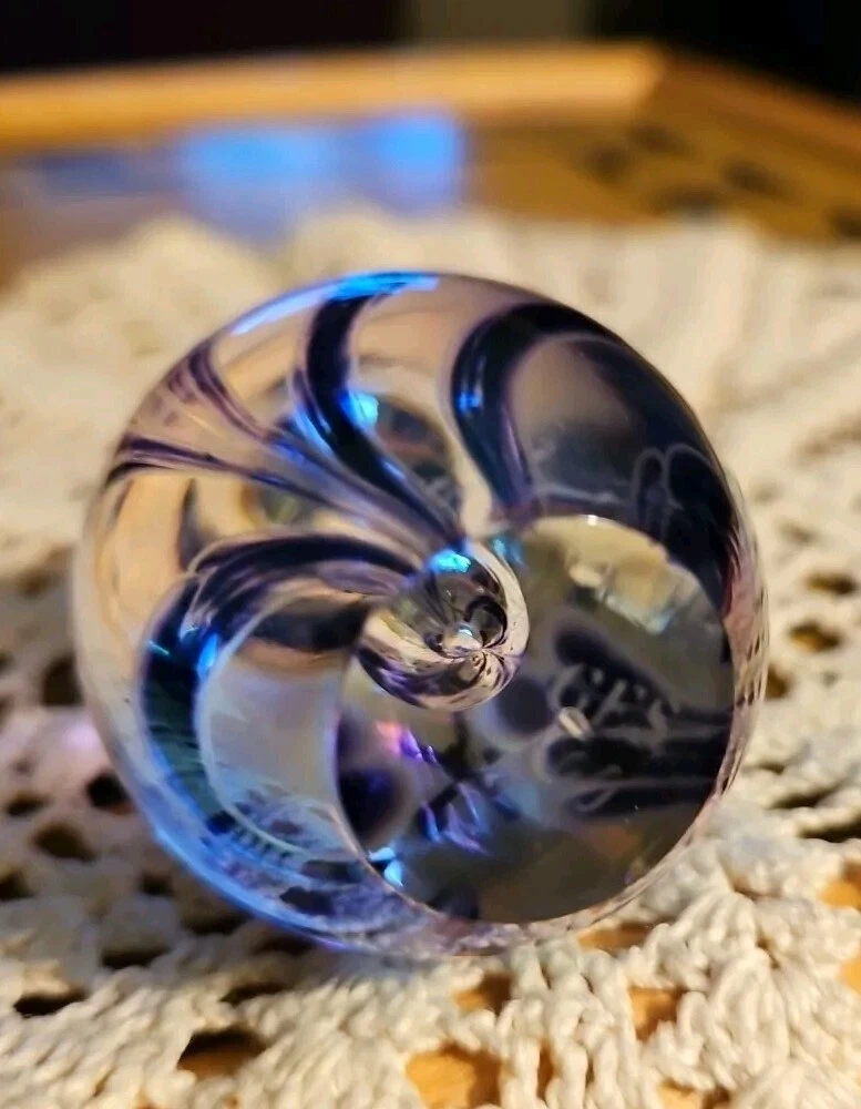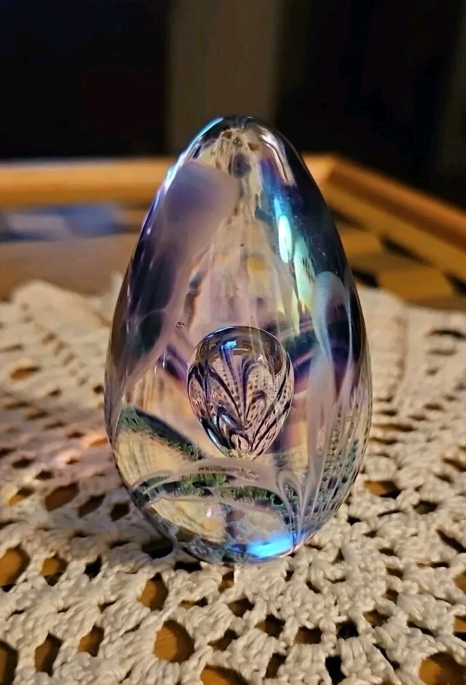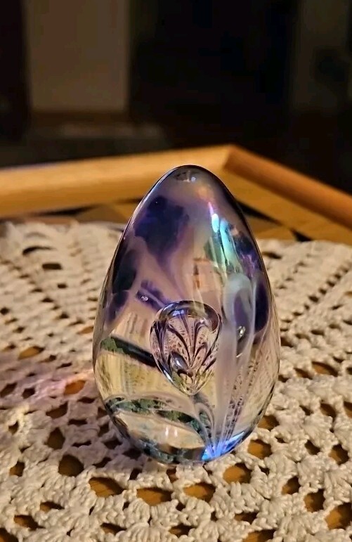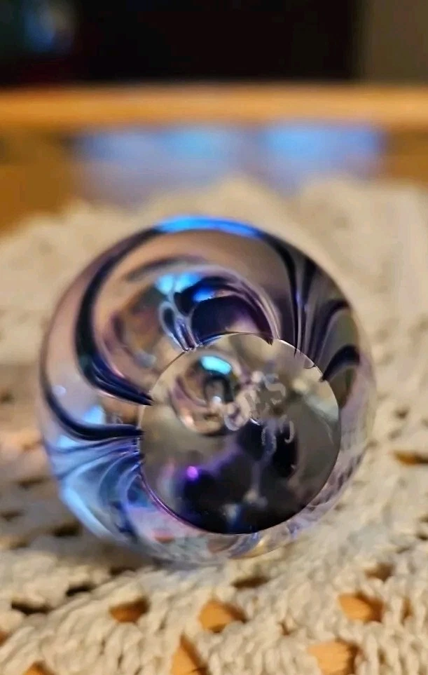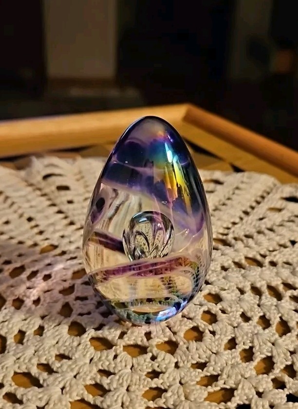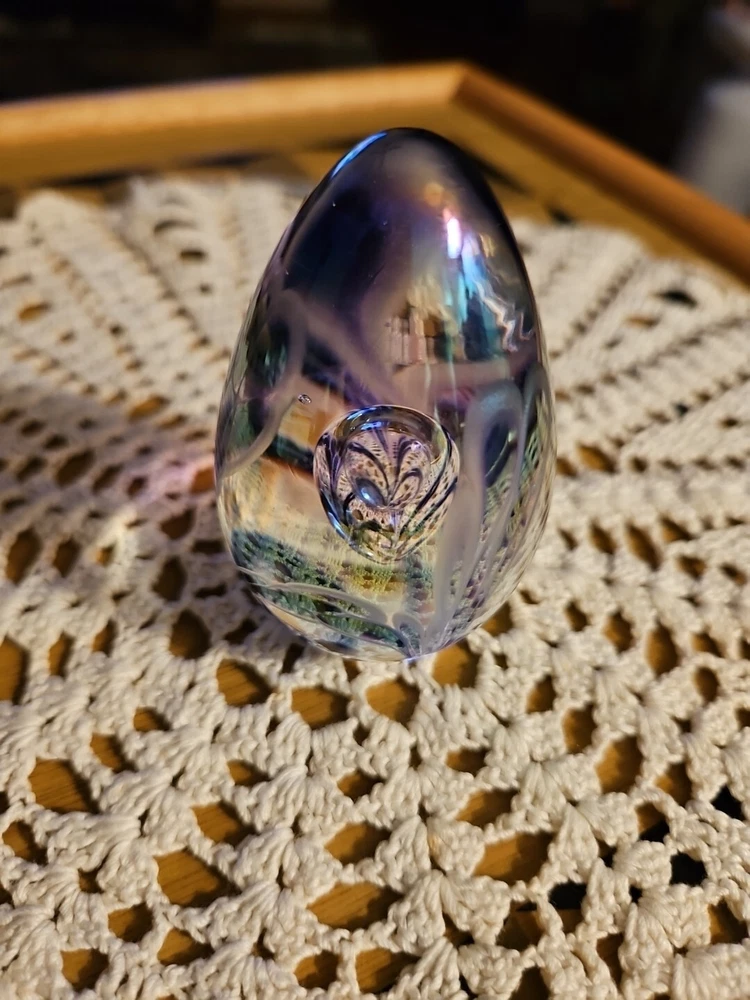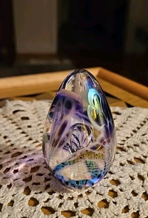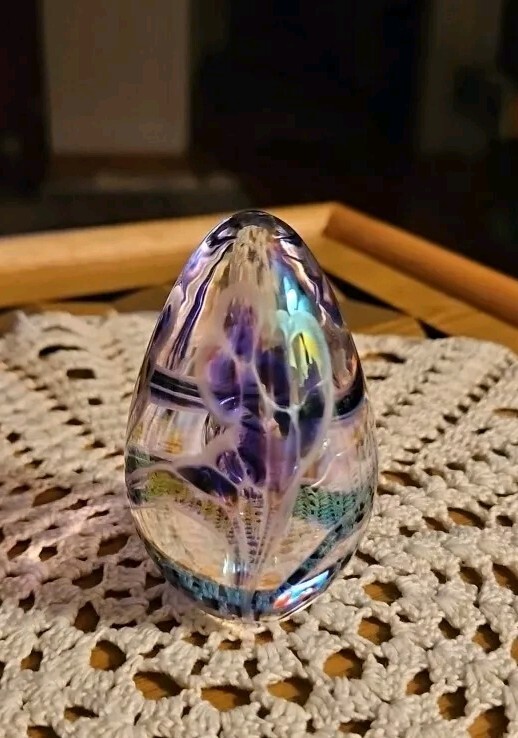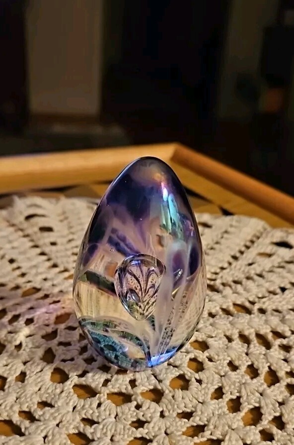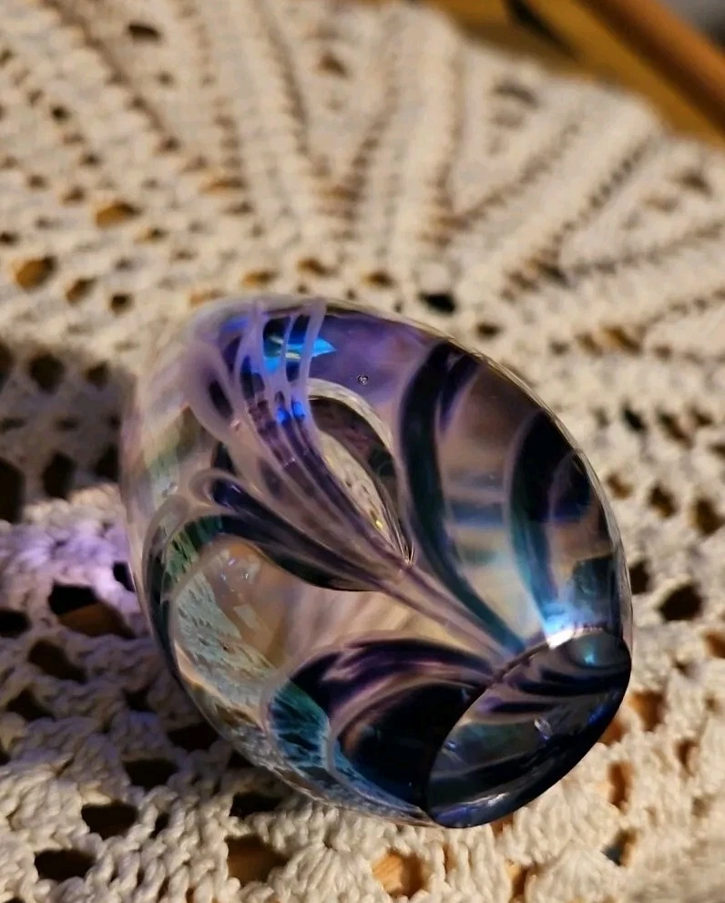 Absolutely gorgeous! The colors shift beautifully in the light, and the handcrafted floral detail adds such elegance. Perfect size for a desk or display, feels sturdy and well-made. Love that it's signed—definitely a special find for any art glass lover. So glad I bought this little treasure!