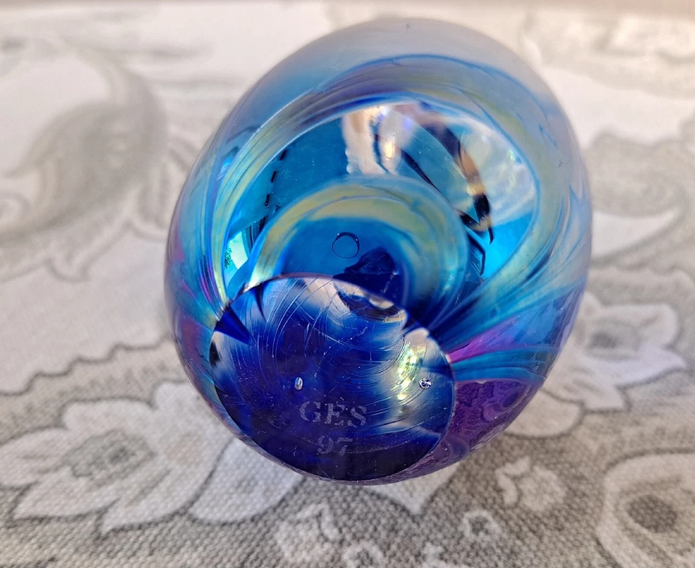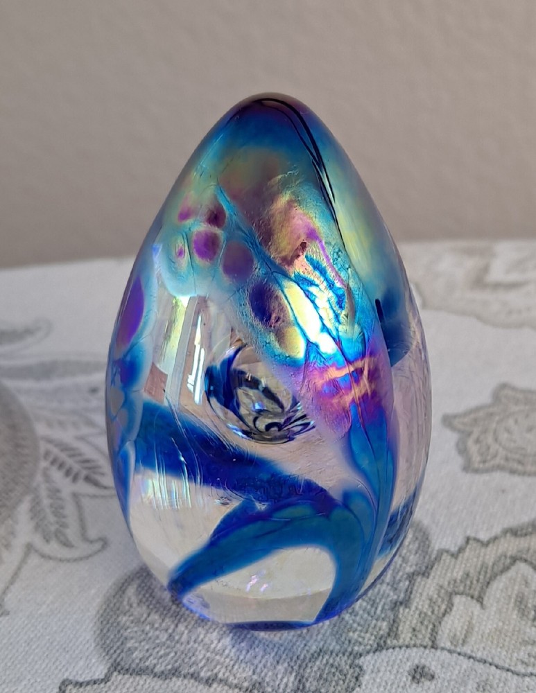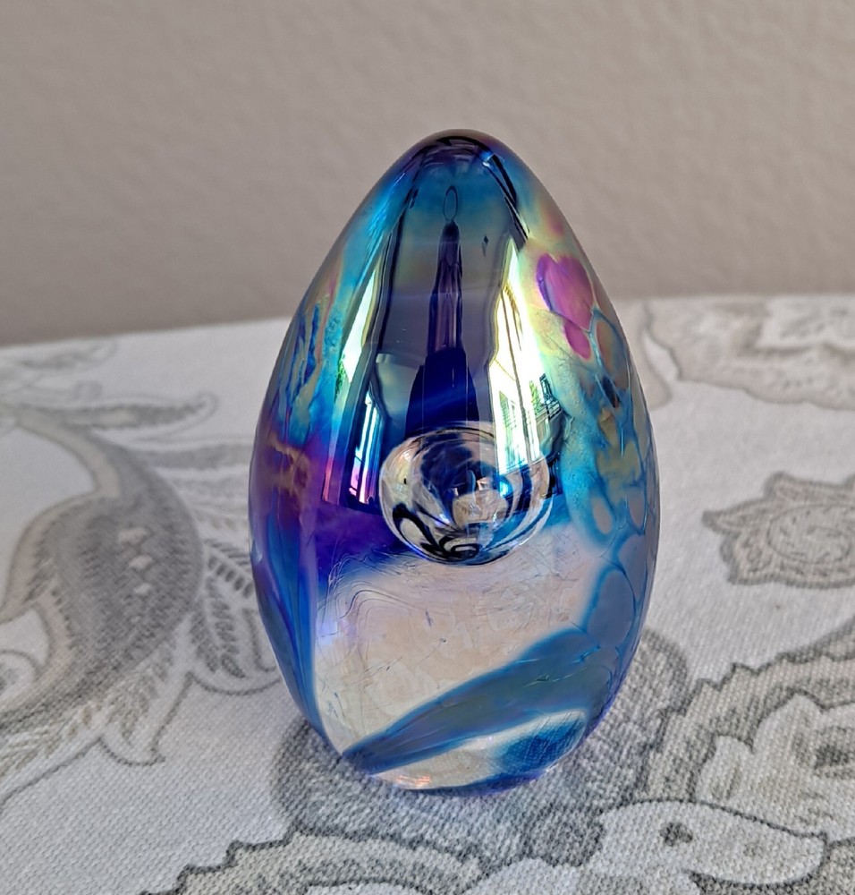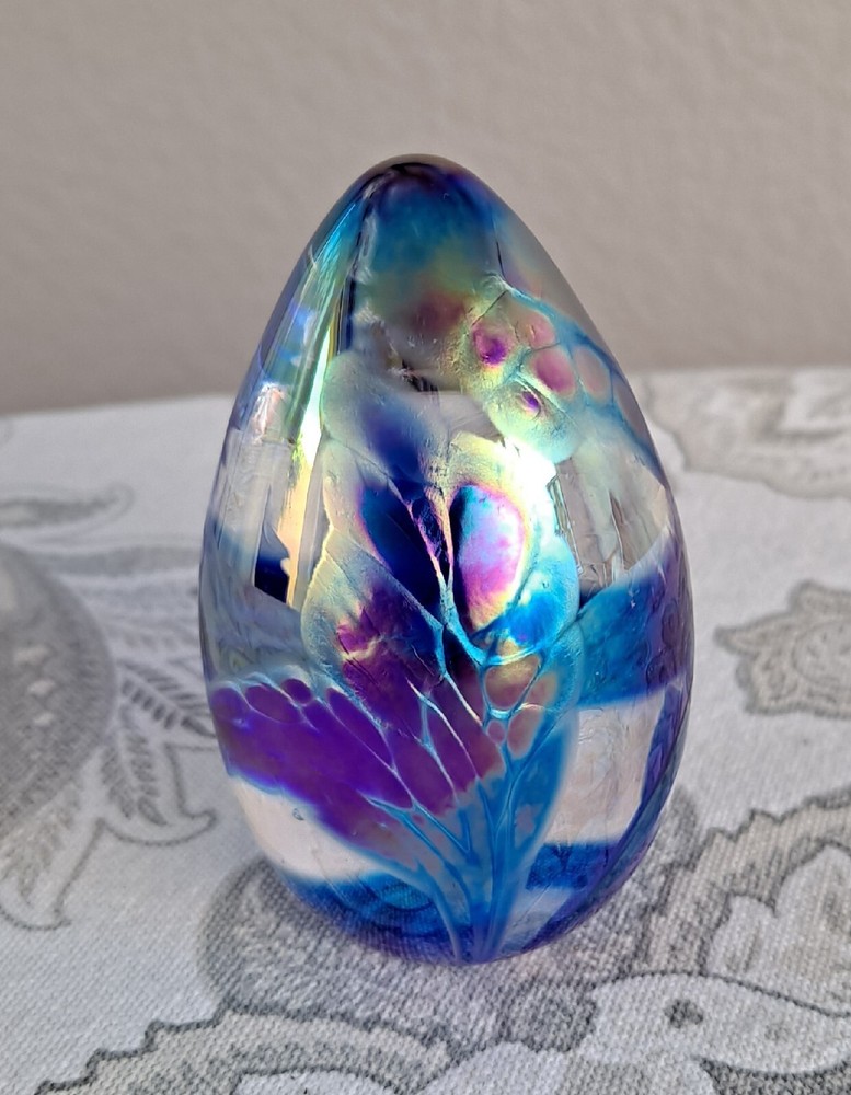 Glass Eye Studio (GES) 1997 Dichroic Egg Shaped Glass Paperweight. Measures approximately; 3 1/2" × 2" Beautiful! Design looks like an Iris flower. Review all pictures prior to purchase.