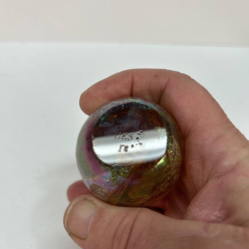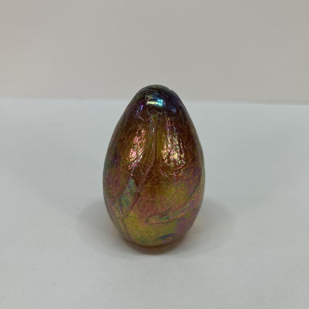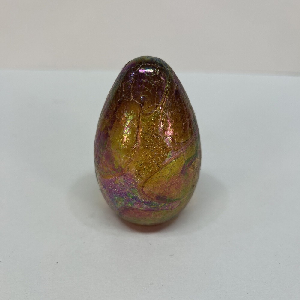 This stunning paperweight by Glass Eye Studio is a one-of-a-kind piece of art. The iridescent, multicolored egg shape is hand-blown from high-quality glass, making each one unique. The intricate dragon design and glossy finish make it a beautiful addition to any collection. This contemporary original features the Glass Eye Studio brand and is handmade with care. It is signed by the artist and produced using art glass techniques. The paperweight measures 3.25 inches in diameter and is a must-have for any paperweight collector.