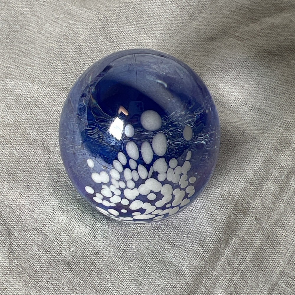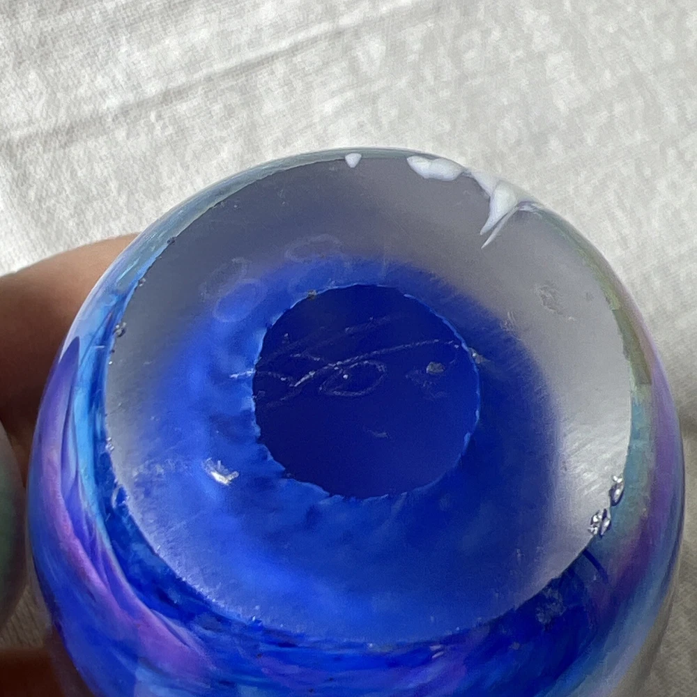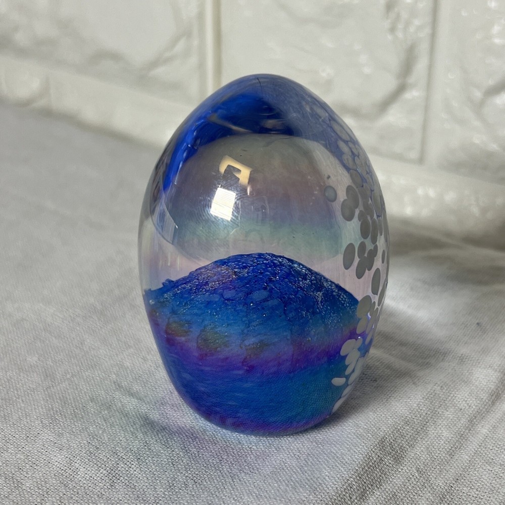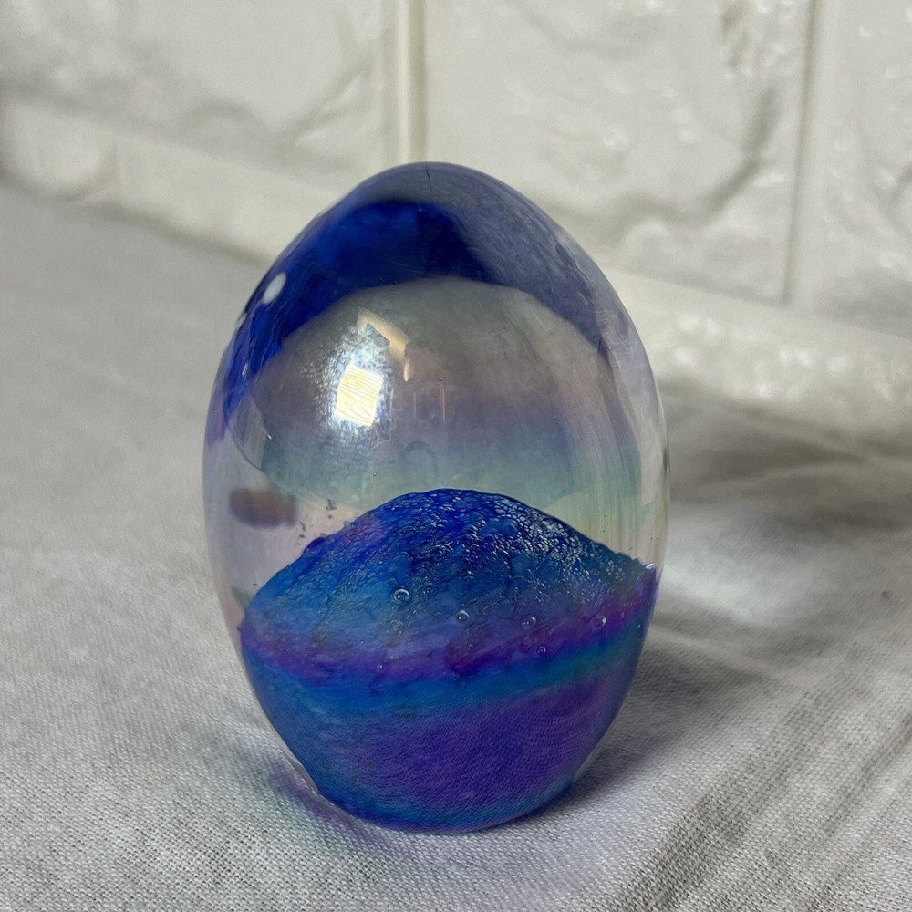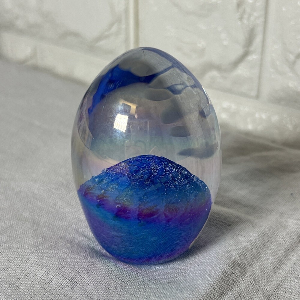 This beautiful paperweight from Glass Eye Studio features a mesmerizing swirl pattern and is hand-blown from multicolored glass. The egg-shaped design, featuring bubble accents, makes it a unique addition to any collection. The piece is a contemporary original, produced in the late 20th century, and is handmade by skilled artisans. The paperweight is an ideal decorative item for any home or office space. It is an original piece from North America and appears to be Glass Eye Studio style. The paperweight is perfect for collectors who appreciate art glass and want to add a touch of elegance to their space. No markings on bottom other than what appears to be the numbers 83. See pictures and let me know if you have any questions.
