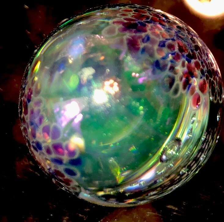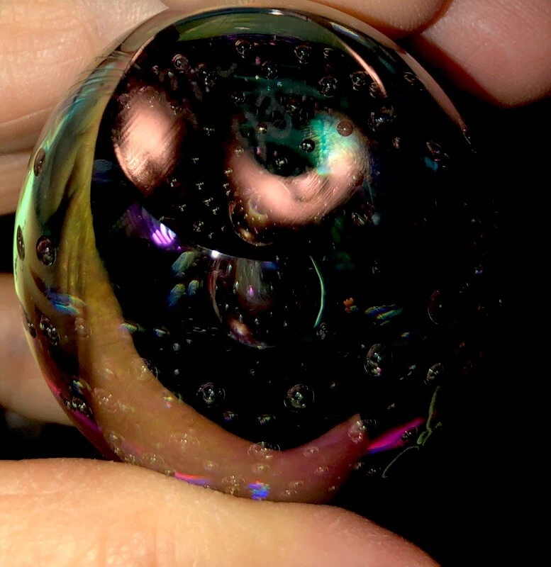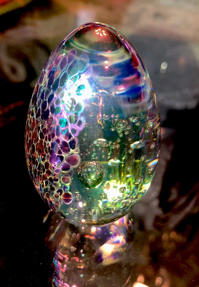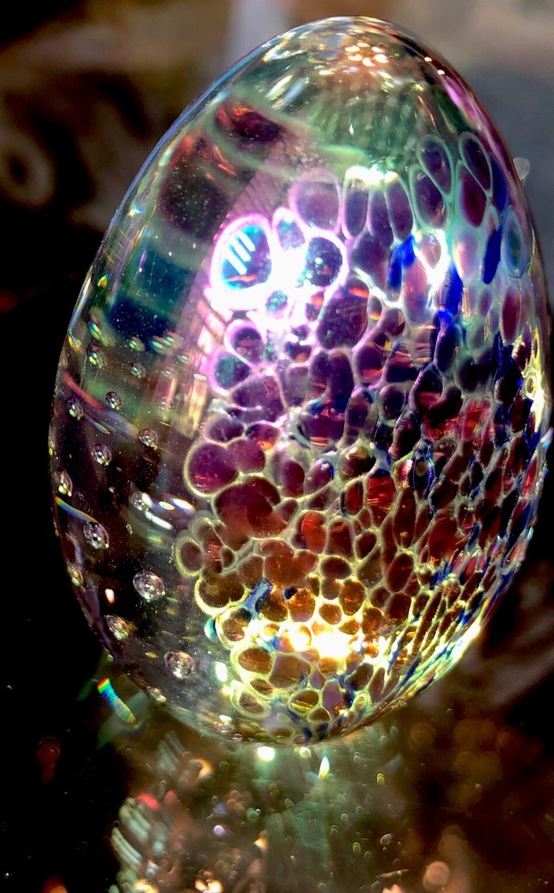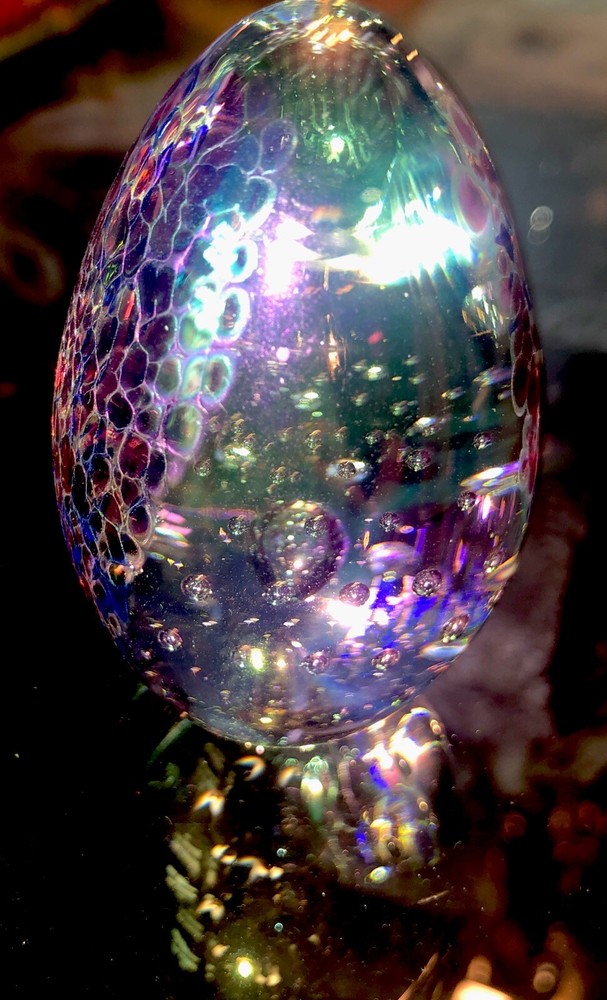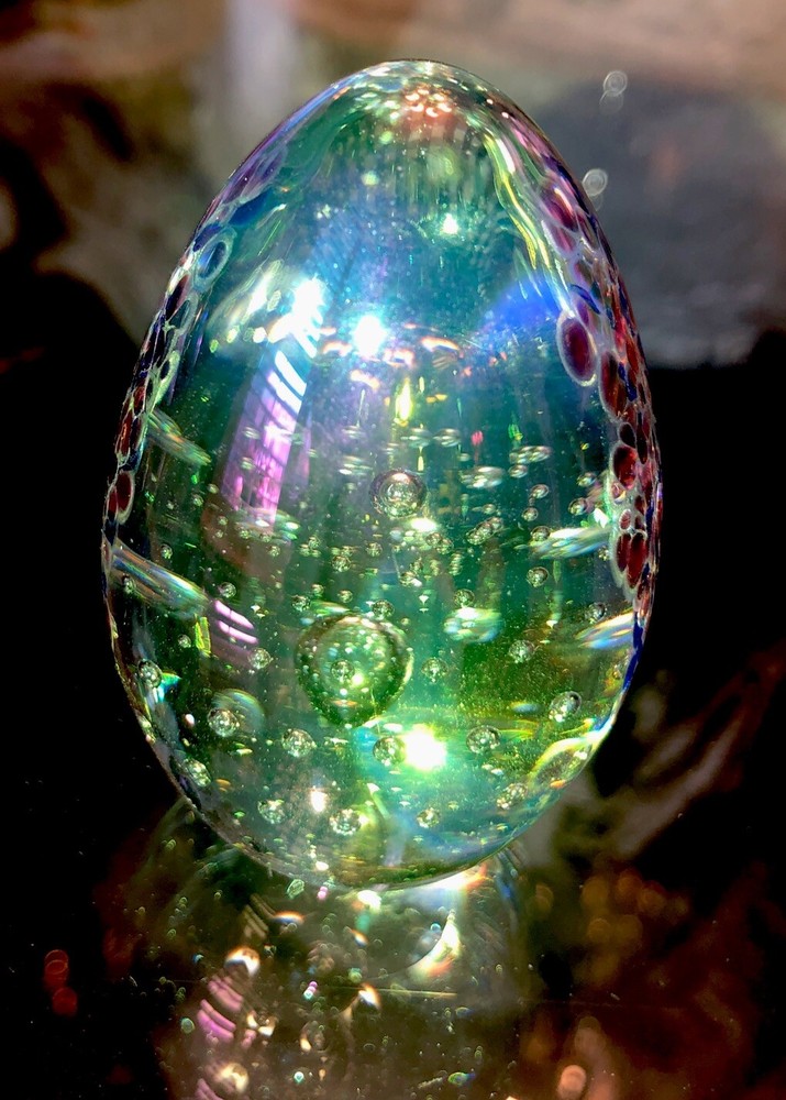 Exquisitely beautiful from every angle. If you look at the included photographs, you will see this egg from every angle. It is stunning from every view. The iridescent colors, including greens, blues, purples, golds, and clear bubbles are magnificent. It is etched GES 93 on the bottom signifying that it comes from G lass Ey e studios and was completed in 1993.