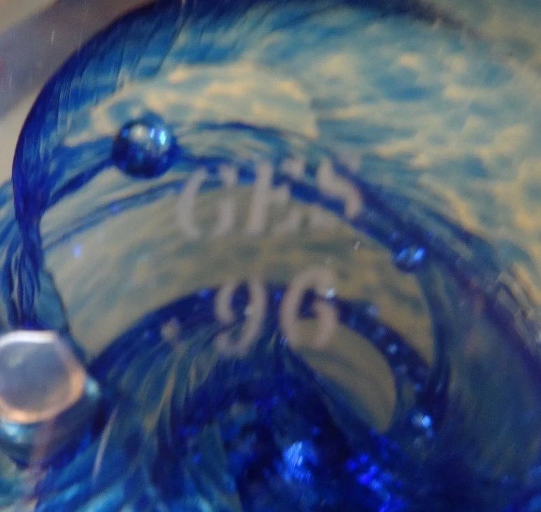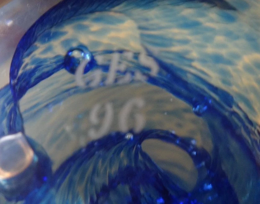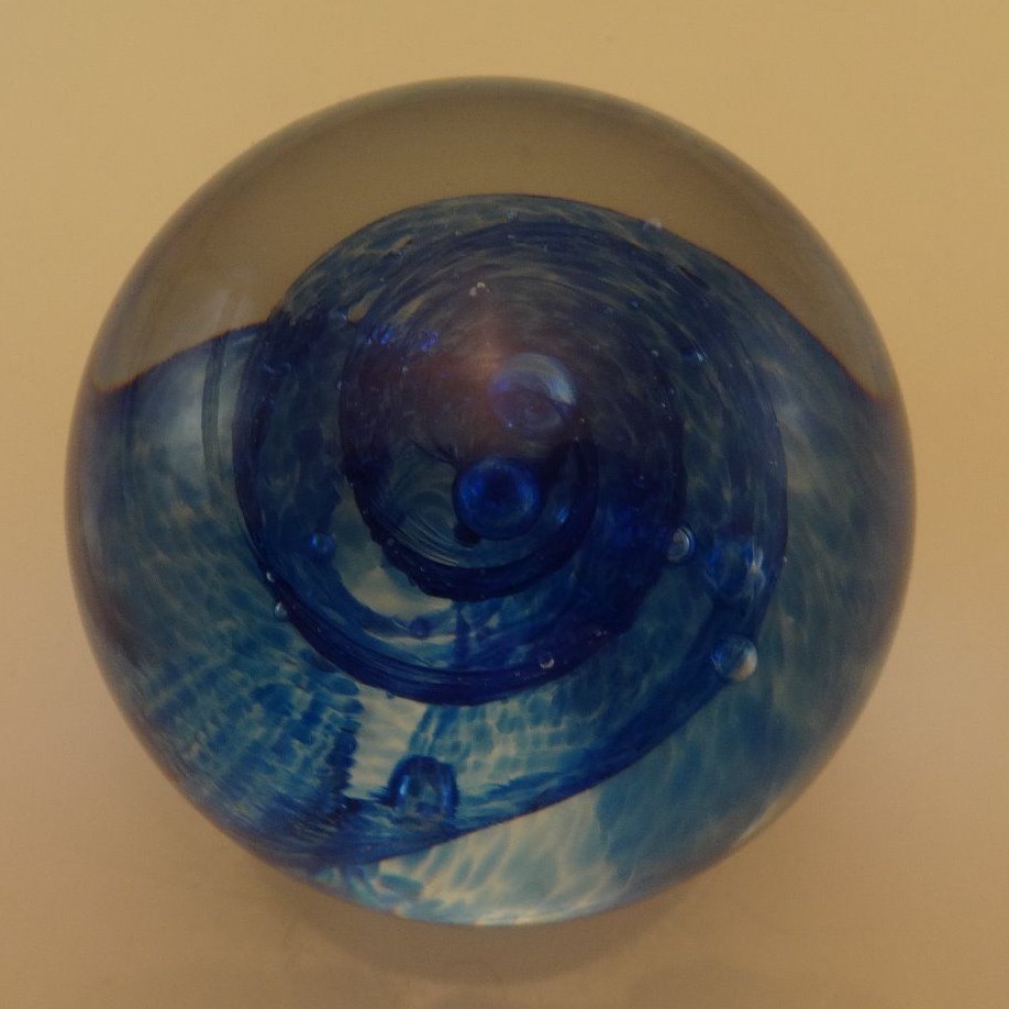 Glass Eye Studio Paperweight Blue spiral swirls encircle elongated bubble flowers Marked "GES 96" on bottom near 3 inches wide and 2 3/4 inches tall tall No chips or cracks, repairs or signs of use