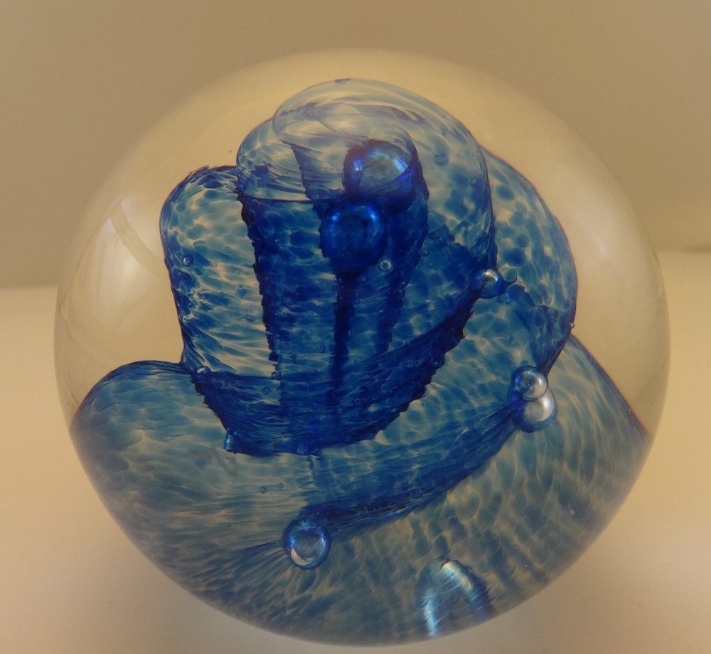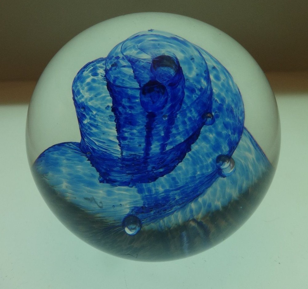 Glass Eye Studio Paperweight Blue spiral swirls encircle elongated bubble flowers Marked "GES 96" on bottom near 3 inches wide and 2 3/4 inches tall tall No chips or cracks, repairs or signs of use...