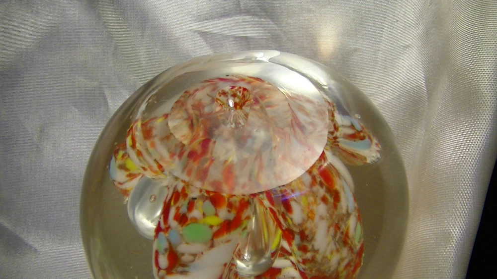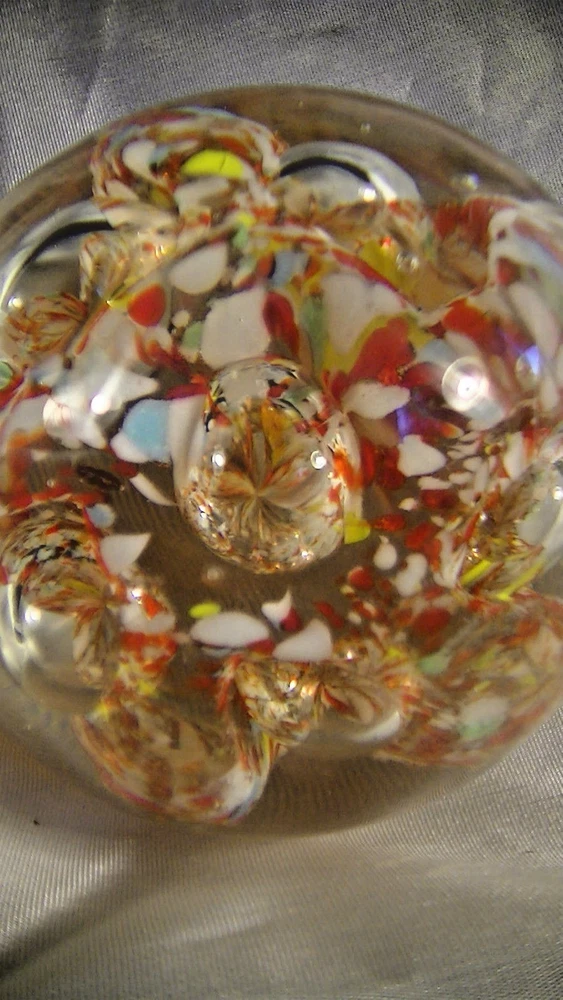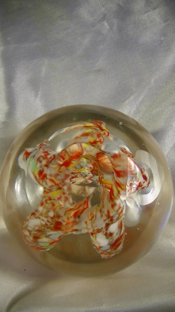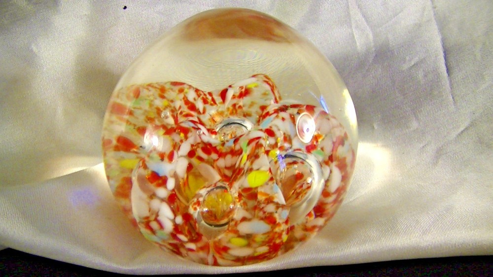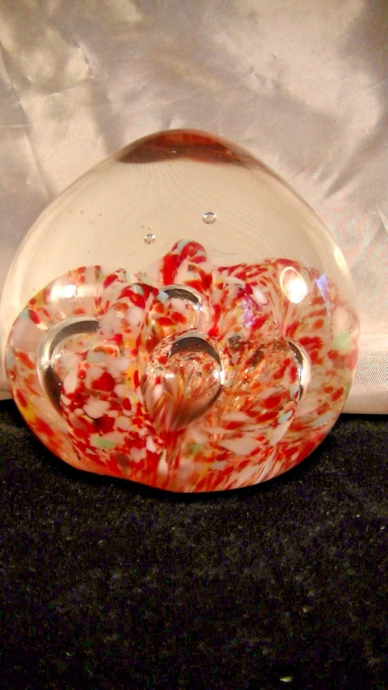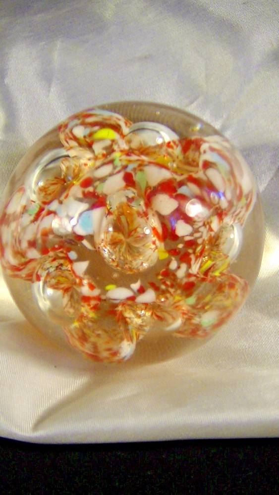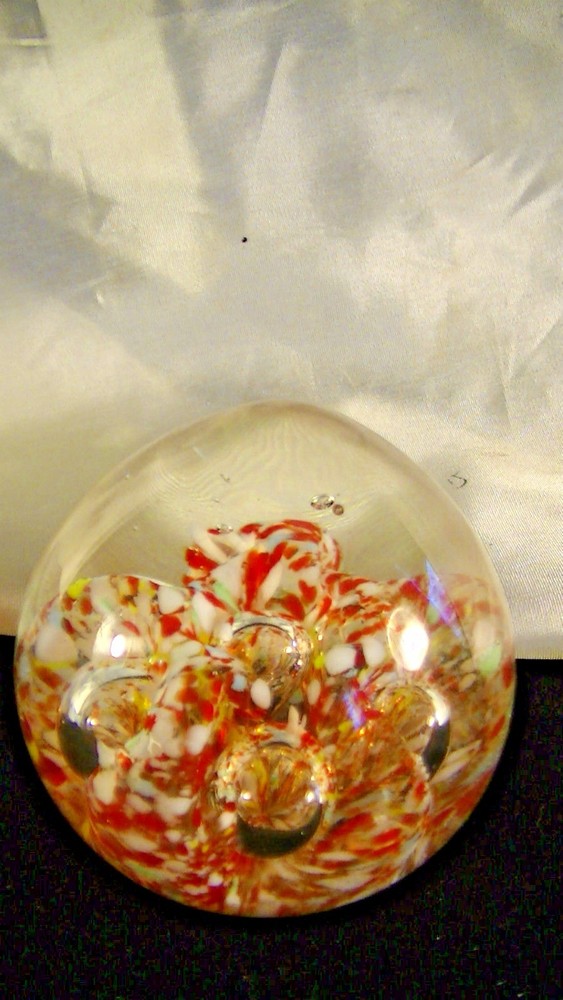 This listing is for a Spectacular Antique glass egg shaped paperweight, Glass Chip Scramble with large bubbles.. The pontil is ground and has a divot towards the center and is rather irregular. This beautiful work of glass art is about 2 5/8" tall x 2 3/4" diameter. This is an exemplary example of art glass and would be the center piece of any collection. What a terrific and unusual gift it would make. Please excuse the lighting reflections. Please be sure to check out our other recent listings of glass paperweights and other collectible artifacts. I will be listing almost 50 vintage or antique paperweights from the estate of a glass collector who has been collecting for the past 60 years. Please review photographs for condition and features. Thank you for visiting. Please be sure to mark us as a favorite, visit our E-Bay Store and review our other offerings including Art Pottery, Pewter, Sterling, Antiques, Vintage Toys, Railroadiana and Toy Trains and accessories, Crystal Glass, Old tins, Militaria, Bronze Sculptures, Women’s accessories, Primitives and so much more. Here is a link to our listings, http://stores.ebay.com/paladinsknights We are glad to combine shipping and we usually ship within one business day of payment. If you are interested in combined shipping, please refrain from making payment until you request an invoice and it is received. Please note that the cowboy is my avatar and used for scale ( He is about 2 ¼” tall) as others might use a Coke can. He is not to be considered as part of the item for sale. .