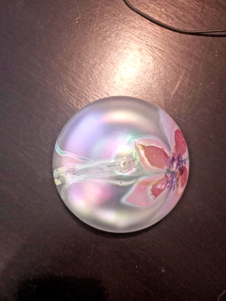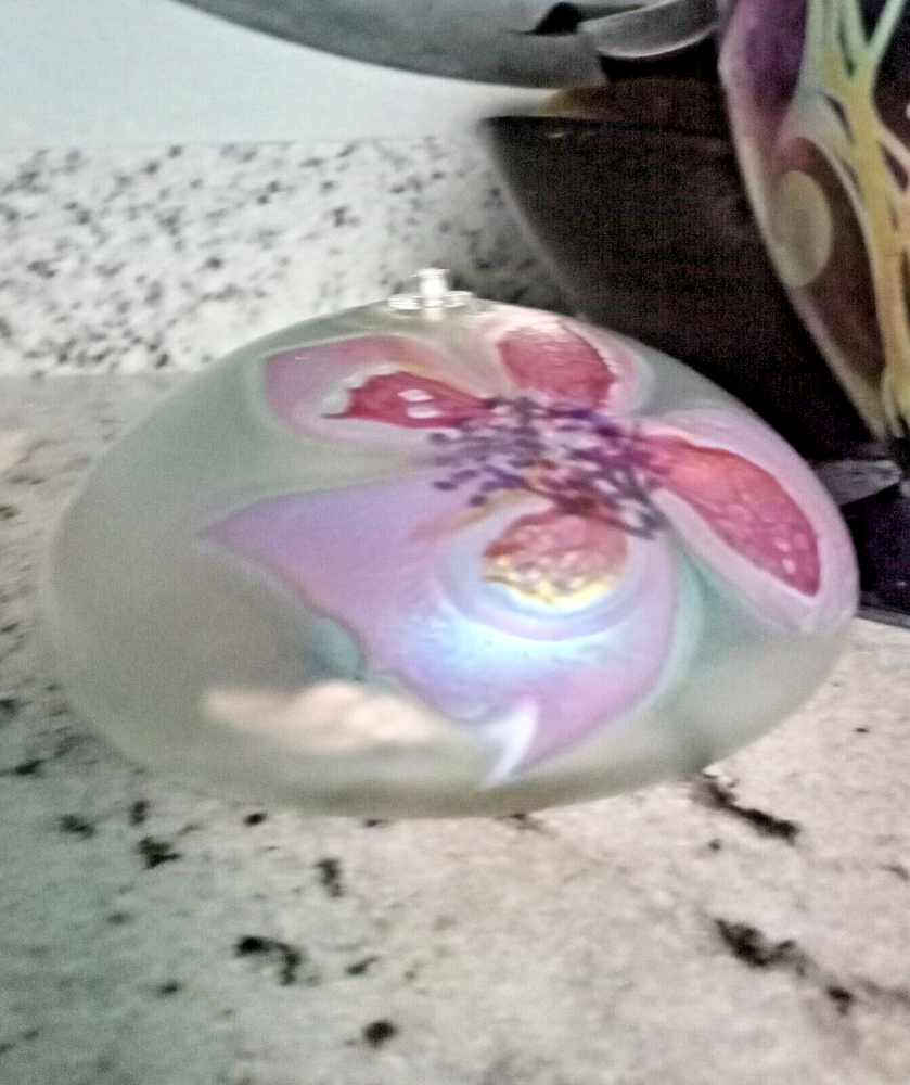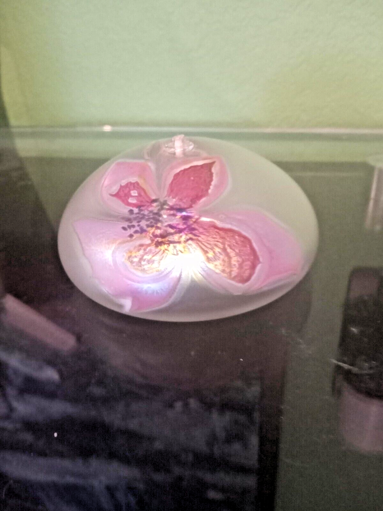Breathtakingly Beautiful. This is part of a Vintage Collection of Handblown Art Glass by Seattle Artisians. This is basically New, displayed behind glass, never exposed to sunlight, smoke, etc. Has original unused wick with holder. Please feel free to ask any questions you may have. Measures: 6" in circumference and 2 1/2" in height Style is Clematis and it is Iridescent White Glass. Ships in Original Gift Box, boxed within a USPS Priority Mail Box