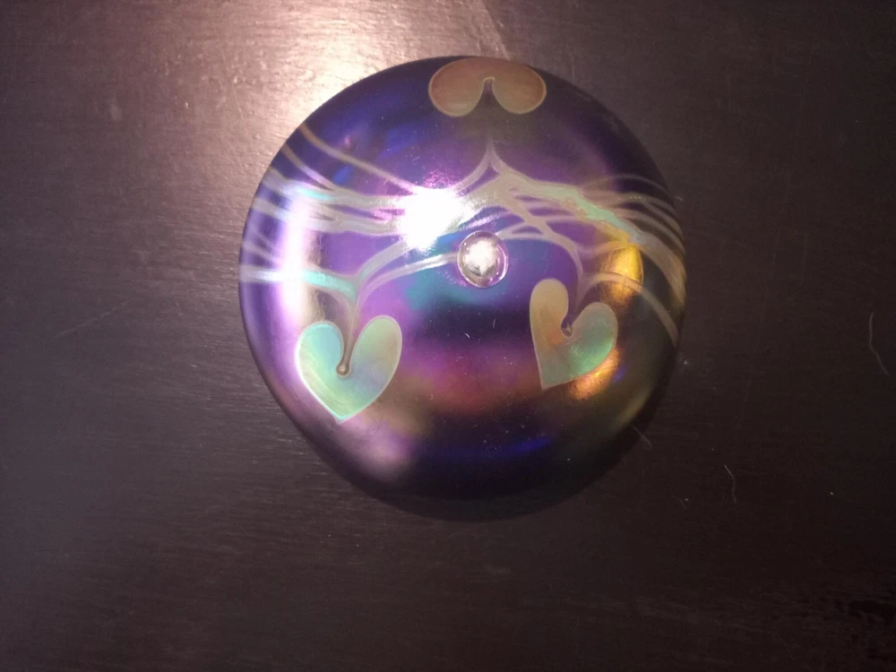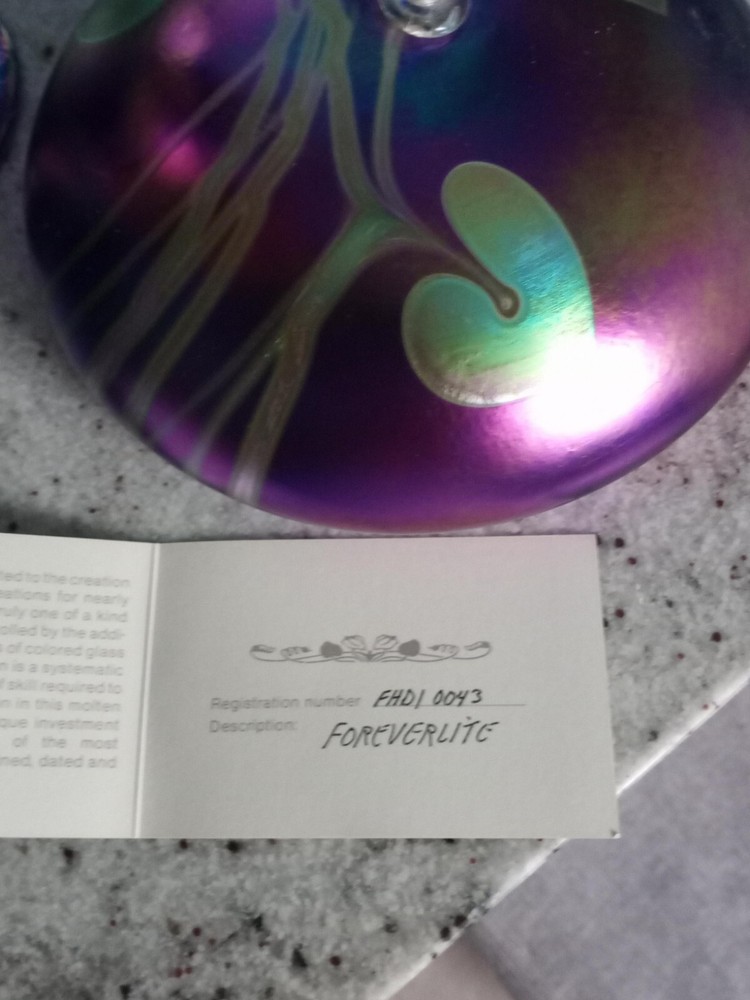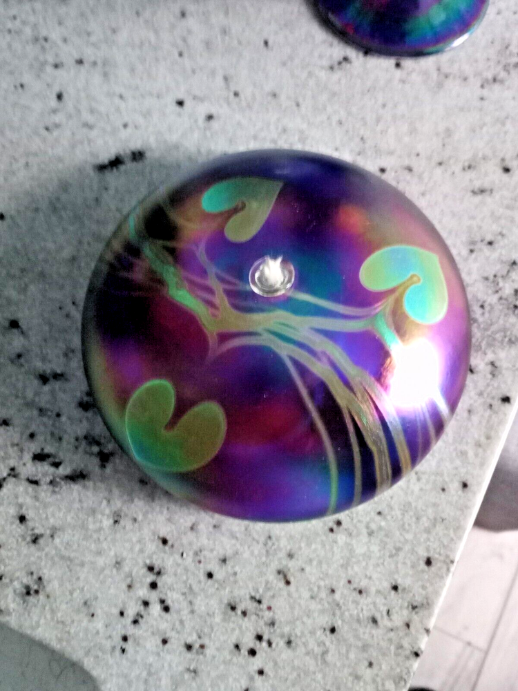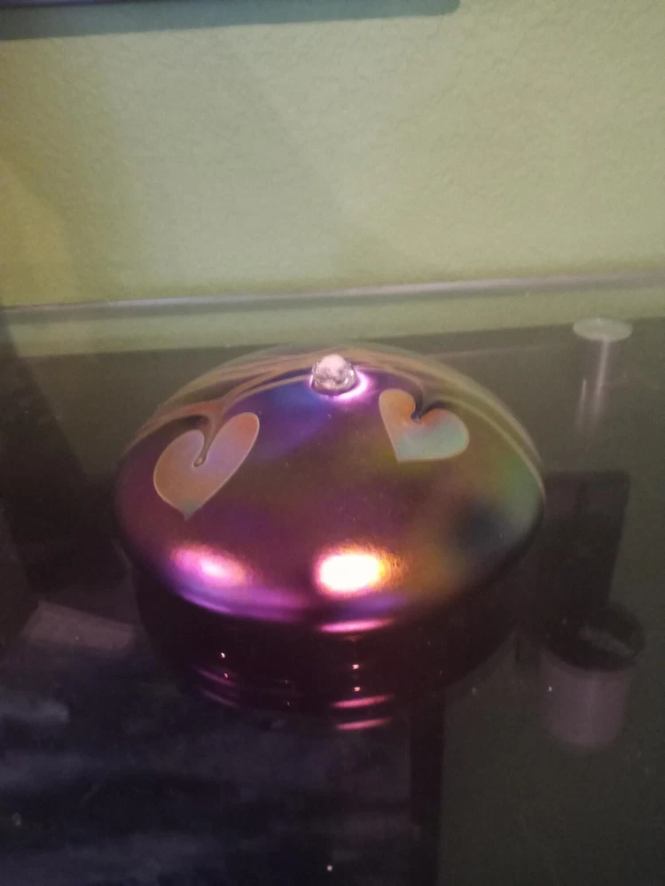 Breathtakingly Beautiful. This is part of a Vintage Collection of Handblown Art Glass by Seattle Artisians. This is basically New, displayed behind glass, never exposed to sunlight, smoke, etc. Has original history, documentation and Identification card, along with original unused wick with holder. Please feel free to ask any questions you may have. Measures: 6 1/2" in circumference and 2 1/2" in height Style is Hearts and Vines, and it is Iridescent Cobalt Blue Glass. Ships boxed within a USPS Priority Mail Box