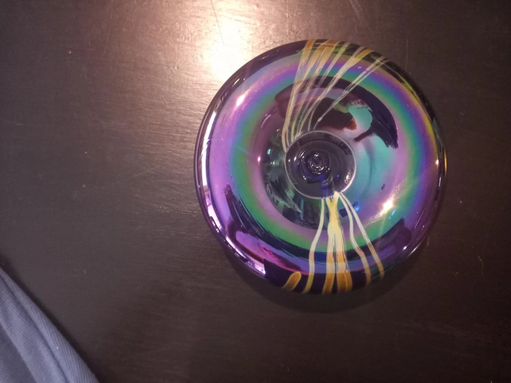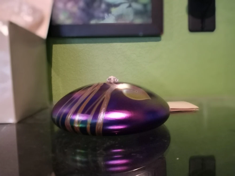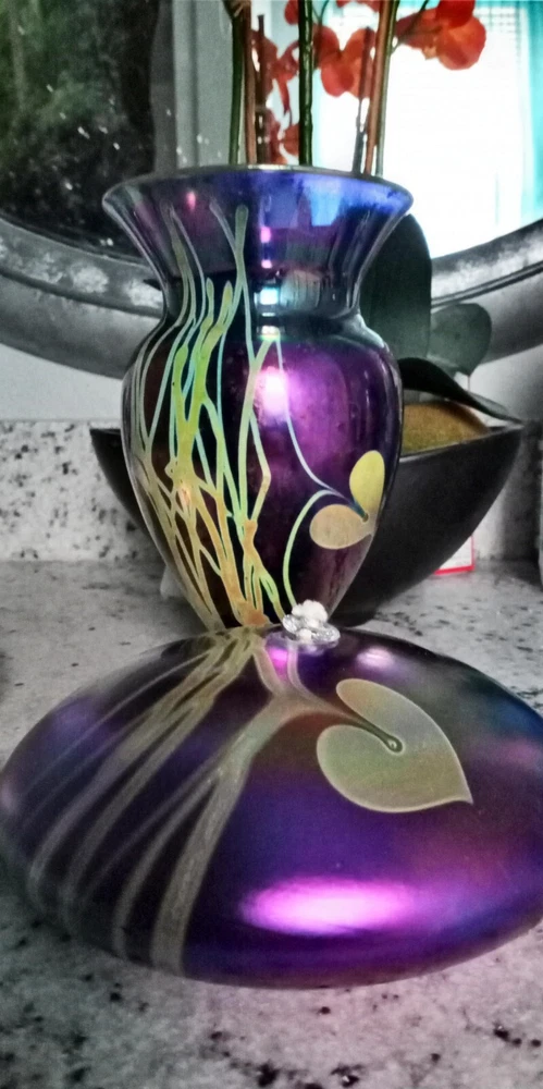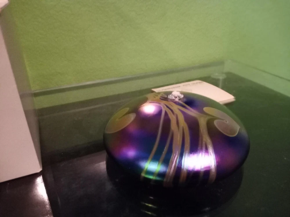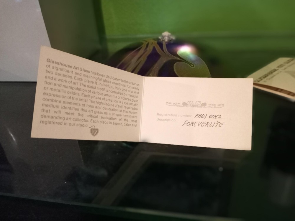 Breathtakingly Beautiful. This is part of a Vintage Collection of Handblown Art Glass by Seattle Artisians. This is basically New, displayed behind glass, never exposed to sunlight, smoke, etc. Has original history, documentation and Identification card, along with original unused wick with holder. Please feel free to ask any questions you may have. Measures: 6 1/2" in circumference and 2 1/2" in height Style is Hearts and Vines, and it is Iridescent Cobalt Blue Glass. Ships boxed within a USPS Priority Mail Box