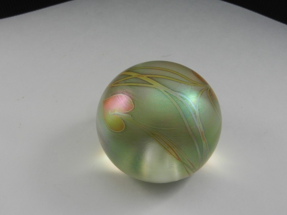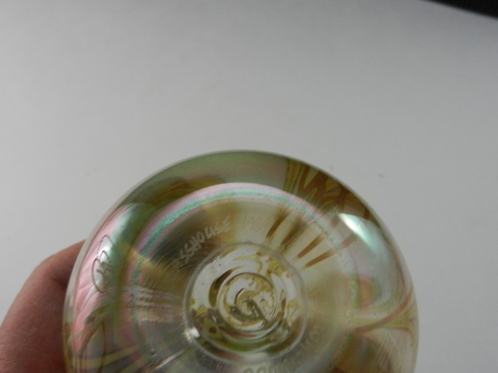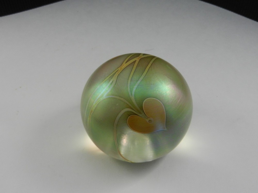 Glasshouse Studio, Art Glass Paperweight, Hanging Hearts, Iridized Light Gold, 3" T, 3 1/2" D. Produced ca 1988. Signed and numbered WHL180086. Has the artists initials, Glasshouse 1988 and the Glasshouse embossed G on the bottom. Condition - excellent (see condition category item 2 below) - no chips, cracks, or cloudiness. 1.) Mint- Like New or New; 2.) Excellent- Used but near new with very minor wear, if any (small scratches or abrasions which are not very noticeable) 3.) Very Good- Used shows wear (scratches and/or abrasions) consistent with age of item; 4.) Fair - Shows considerable wear (many scratches or abrasions) and/or multiple chips and/or much cloudiness; 5.) Poor- Considerable wear and/or severe damage
