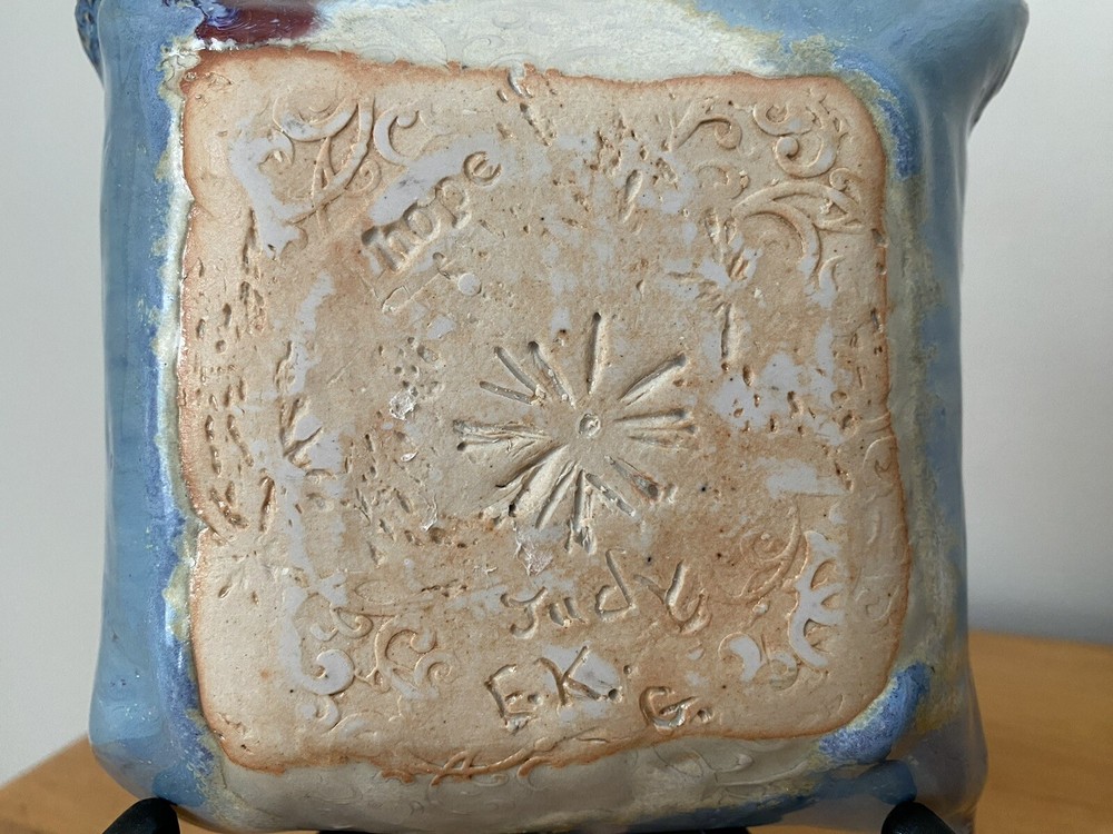 Add stunning, handcrafted art to your decor with this beautiful Studio Pottery Signed Trinket Dish. The square shape and glossy finish make it a perfect addition to any space. This handmade ceramic dish features an abstract pattern in blue and scarlet, with a depth of 1.5 inches and weight of 9.2 ounces. The dish is perfect for storing small items like candies or trinkets, and can be easily hand washed for maintenance. The backstamp is impressed with the artist’s name. This unique piece is a great way to showcase your artistic style and add a small touch of art pottery to your collection.