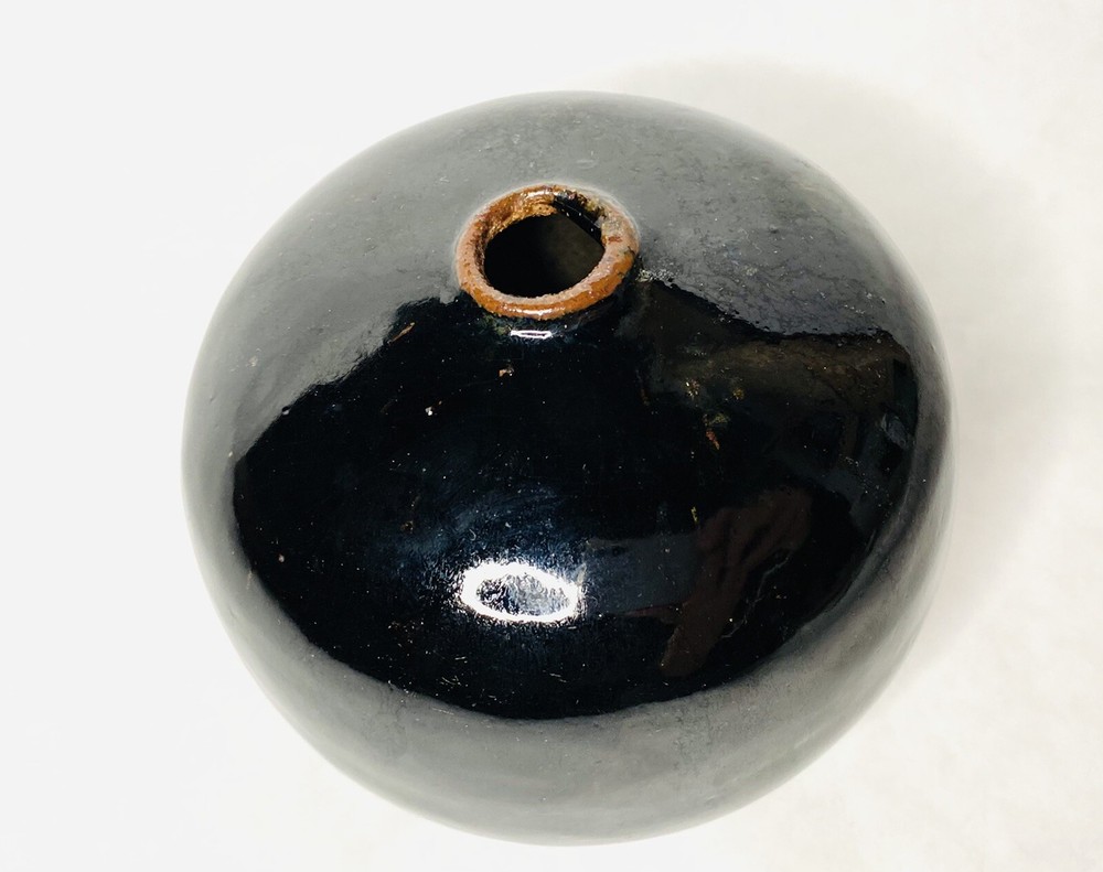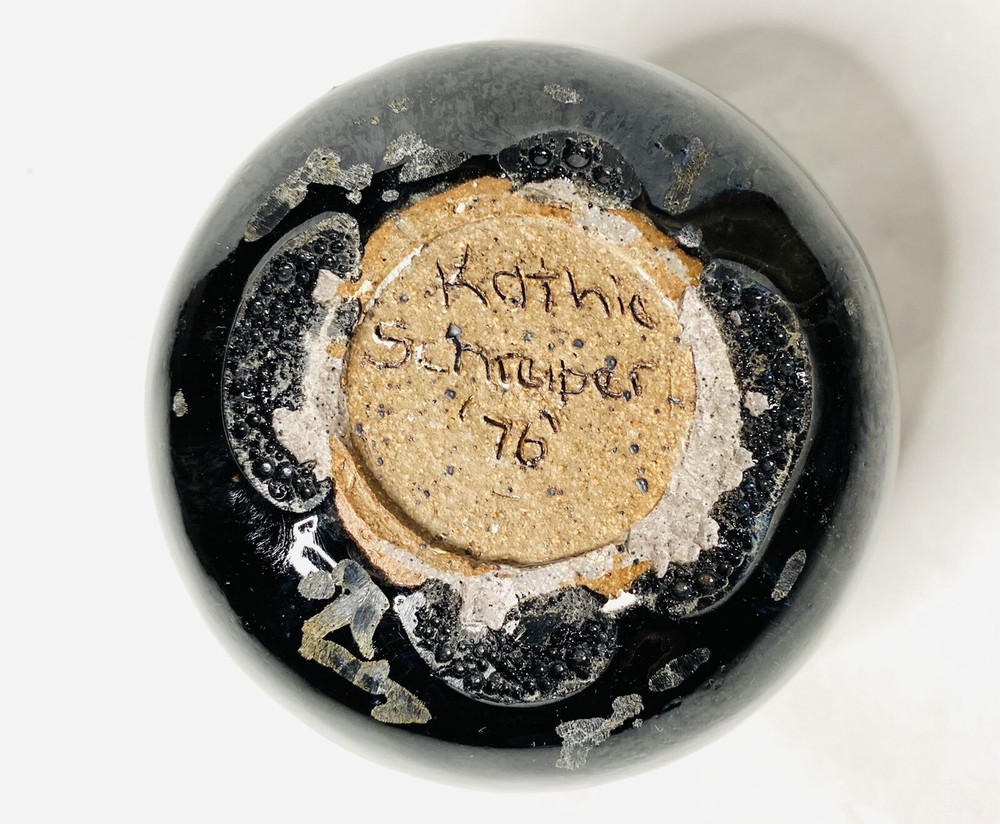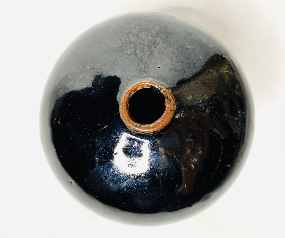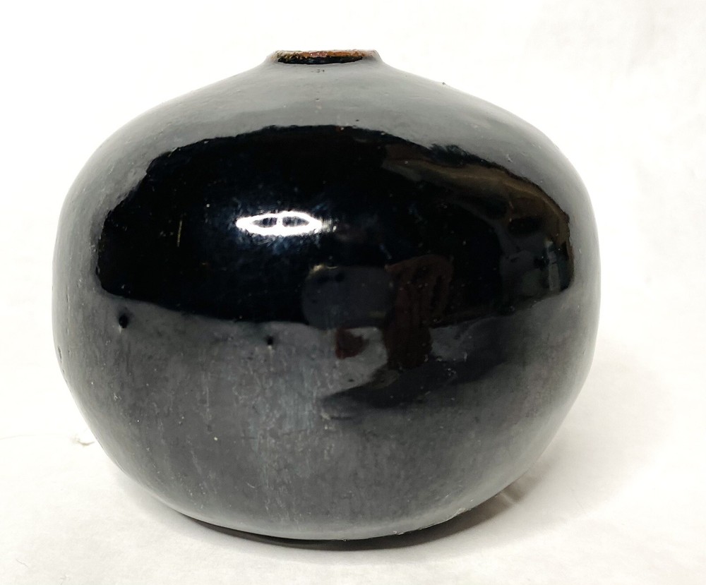 This is a Signed 1976 Globe Orb Shaped Studio Pottery Weed Pot Bud Vase in a glossy Black. Get it quick! Approx. 3.5. Tall x 4” wide Good vintage preowned condition...