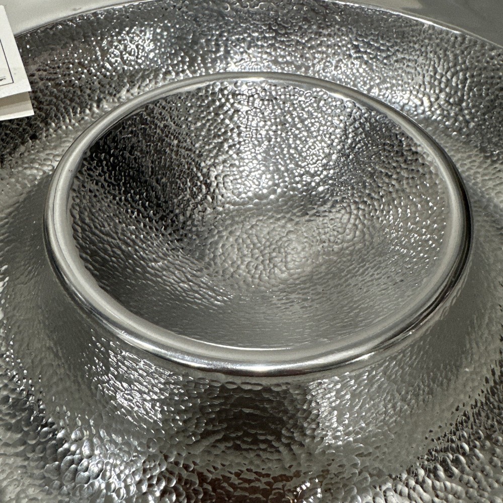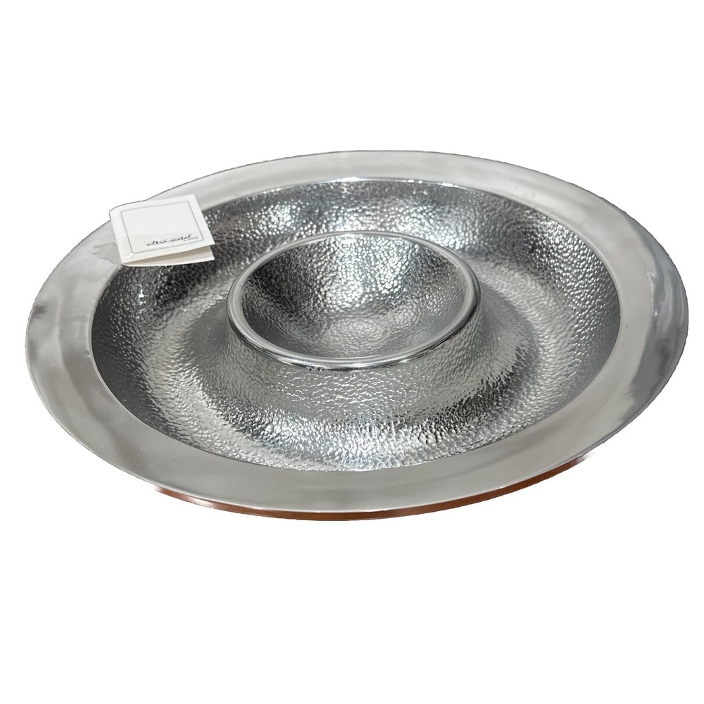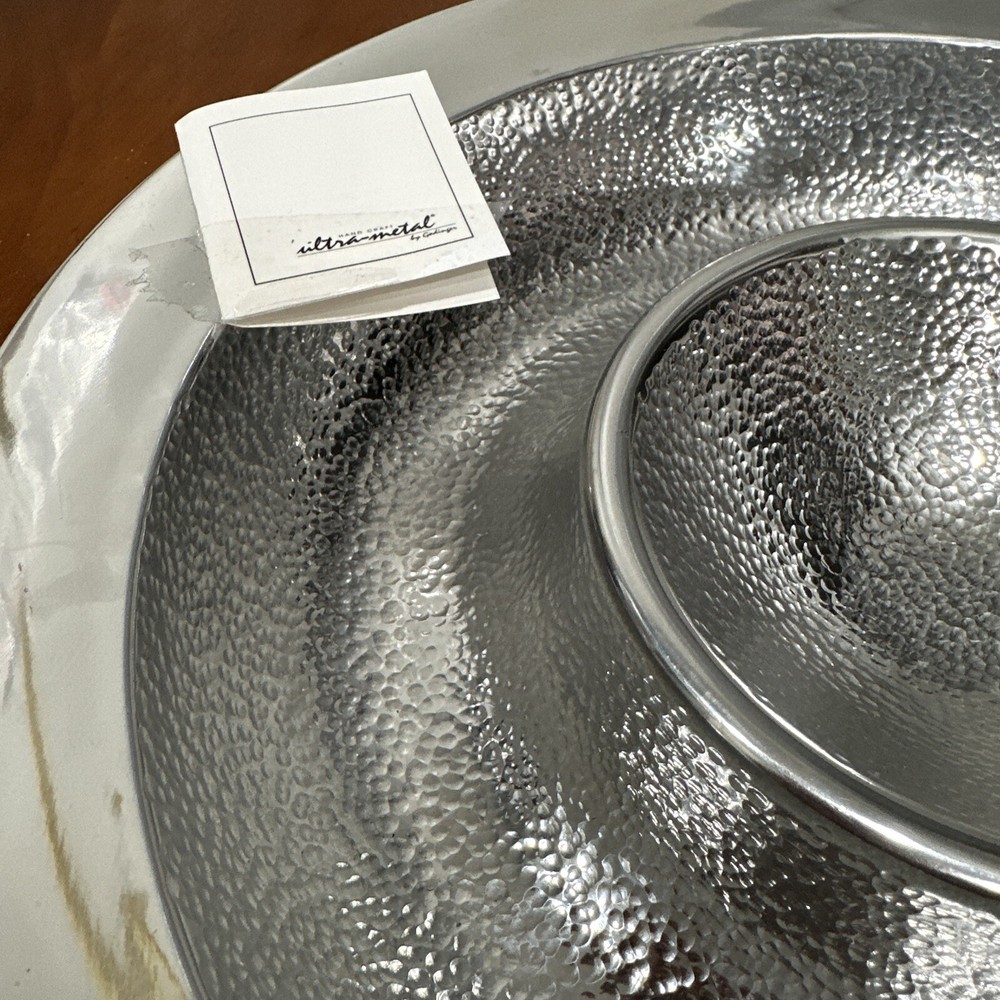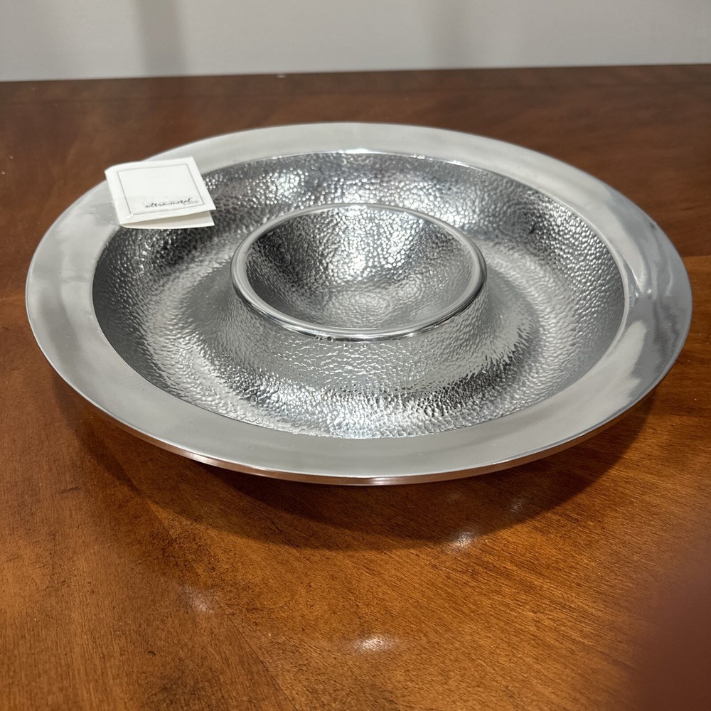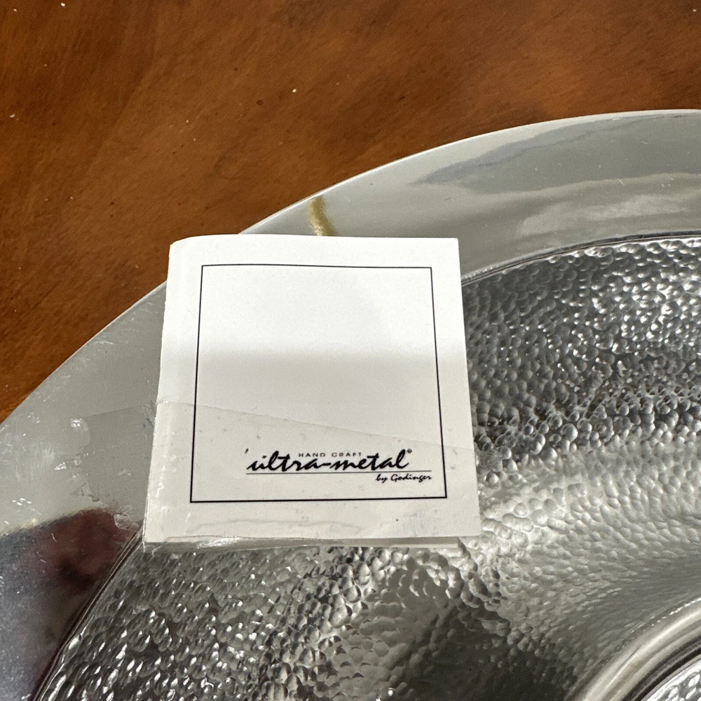 This Godinger Ultra-Metal Round 14" Hammered Chip and Dip Tray Serving Platter is a stunning addition to any kitchen or dining set. The large, round shape is perfect for serving chips, dips, and other small appetizers, while the hammered design adds a touch of elegance and sophistication. Crafted from high-quality ultra-metal, this tray is durable and built to last. The silver color is timeless and will complement any decor, making it a versatile piece for any occasion. Measuring 14 inches in both length and width, this chip and dip tray is perfect for serving up your favorite snacks in style. All of my listings benefit the National Down Syndrome Society. Thanks so much for your interest! It’s in stock and ready to ship, great for any collector. The item appears to be in good shape. May have sticker residue, foxing, boxing, warping, dents, dings, tears, etc., please refer to pictures before bidding or purchasing