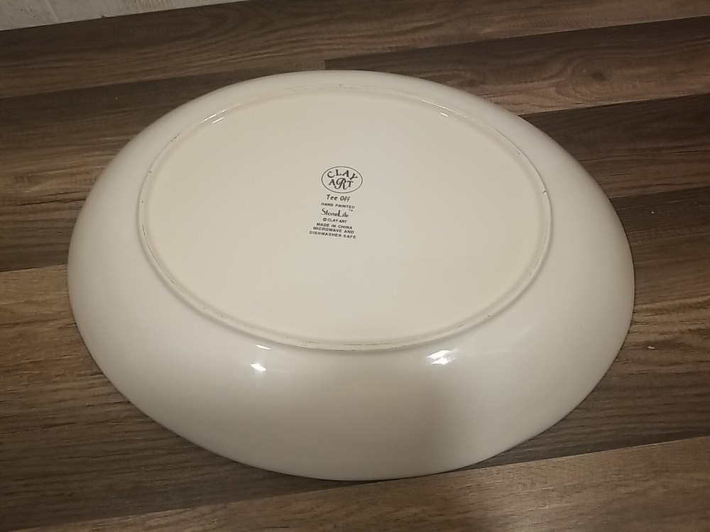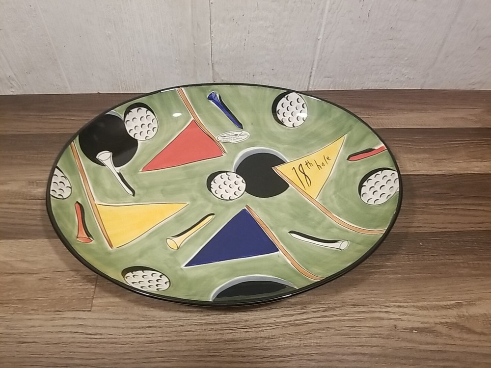 This golf platter chip n dip tray by Clay Art is perfect for all occasions. The oval shape and hand-painted multicolor design make it a great addition to any dinnerware collection. With two compartments, a dip bowl, and a tray, it's perfect for serving chips and dips or any other small appetizers. The tray measures 17.5" in length and 14" in width, and is made of durable stone material. It's both microwave and dishwasher safe, making cleanup a breeze. The golf theme adds a fun touch to any table setting. This chip and dip platter is a must-have for any golf enthusiast or collector.