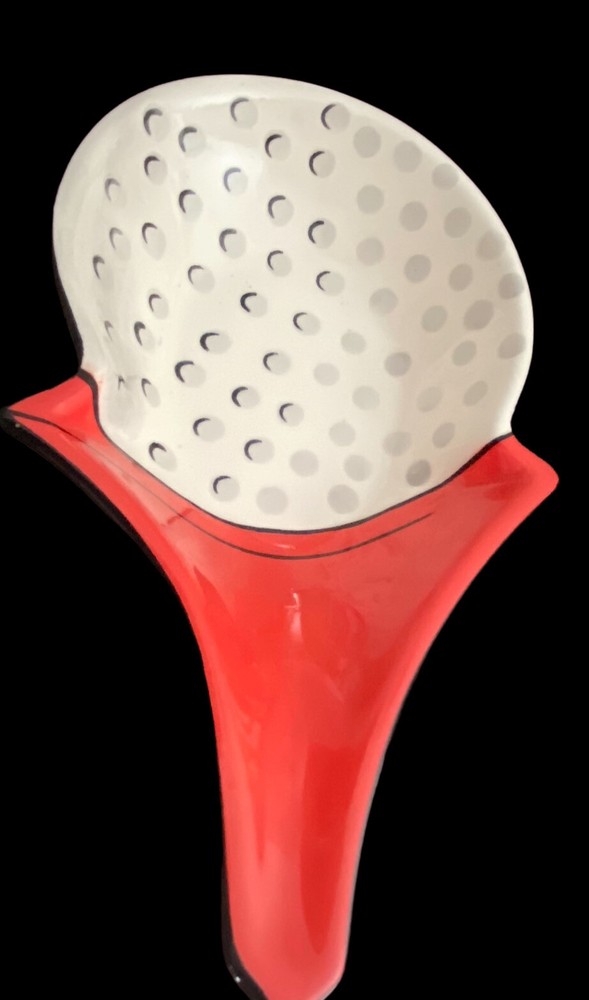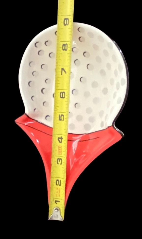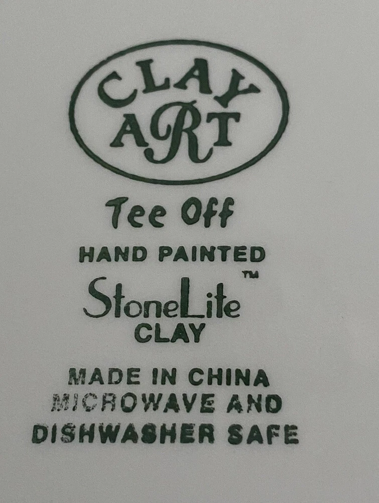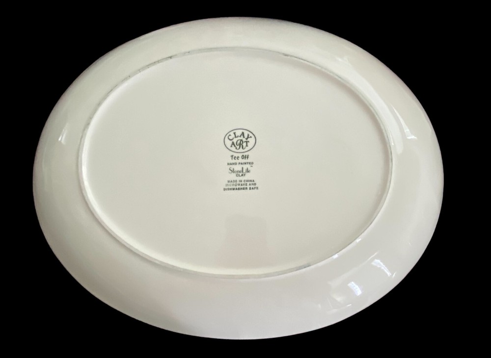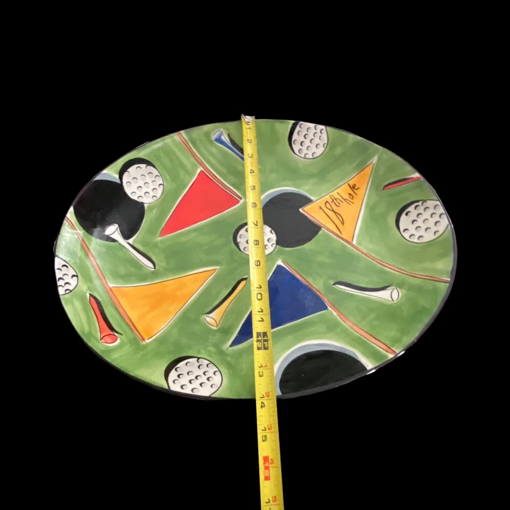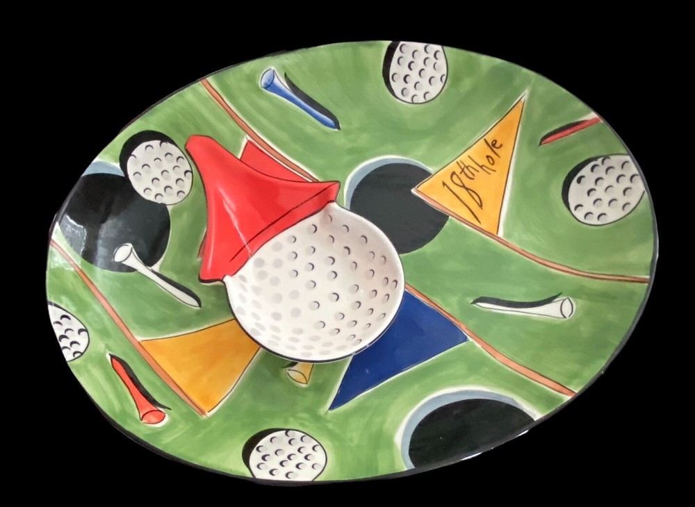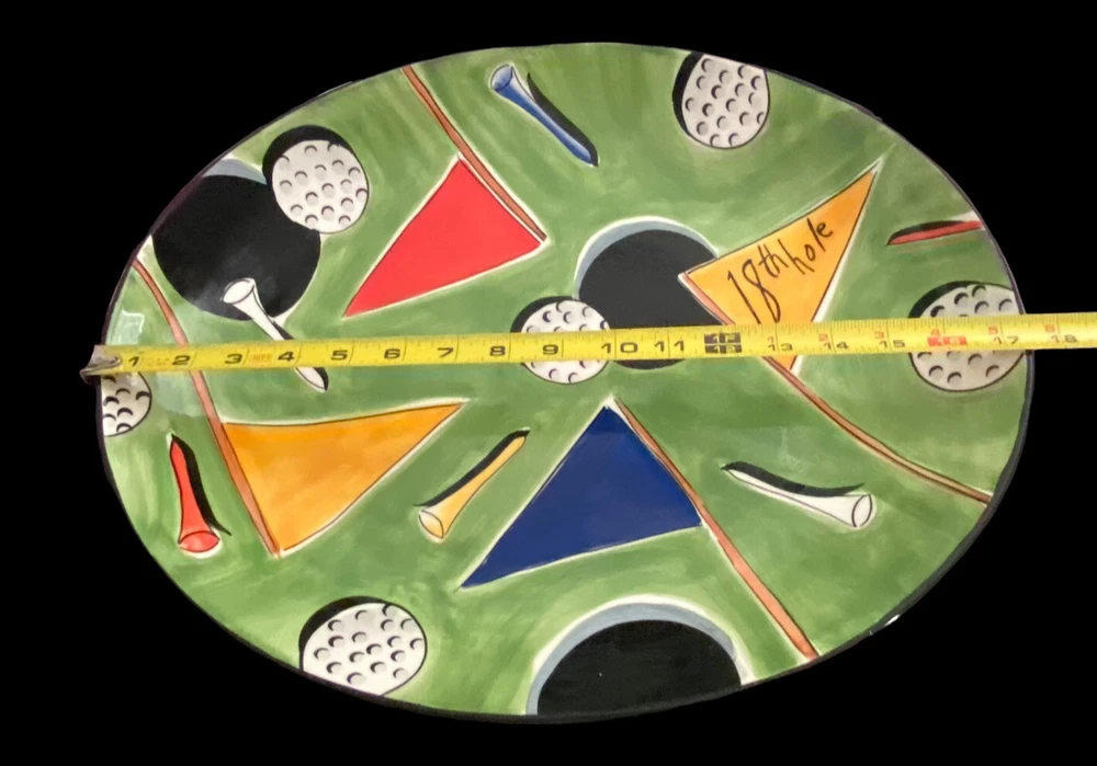 Golf platter chip n dip tray large hand painted Clay Art Tee Off 17.5” X 14”. This tray is preowned but is still in like new condition with no chips, no cracks, no stains, and no repairs. It still has original price tag sticker residue on the back. Please see the last picture which shows slight Discoloration on the foot part of the platter. It will come securely wrapped and shipped in a box. Thank you for shopping with us.