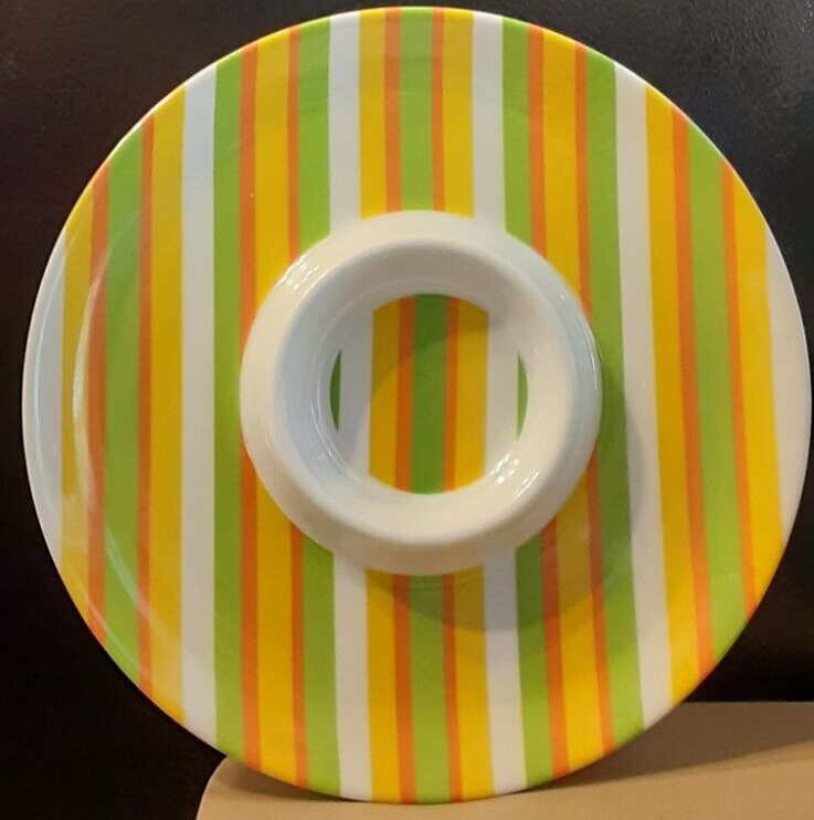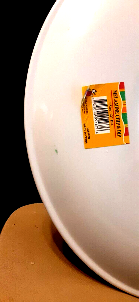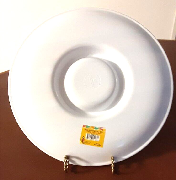 12" Melamine chip and dip platter This platter has 2 blue marks on the backside Front feels gritty, but nothing comes off when I scrape it. Dip section is 5" x 1" Top rack dishwasher safe Microwaveable according to back of dish Chip and dip platter will ship least expensive way. If you have any questions, please email me.