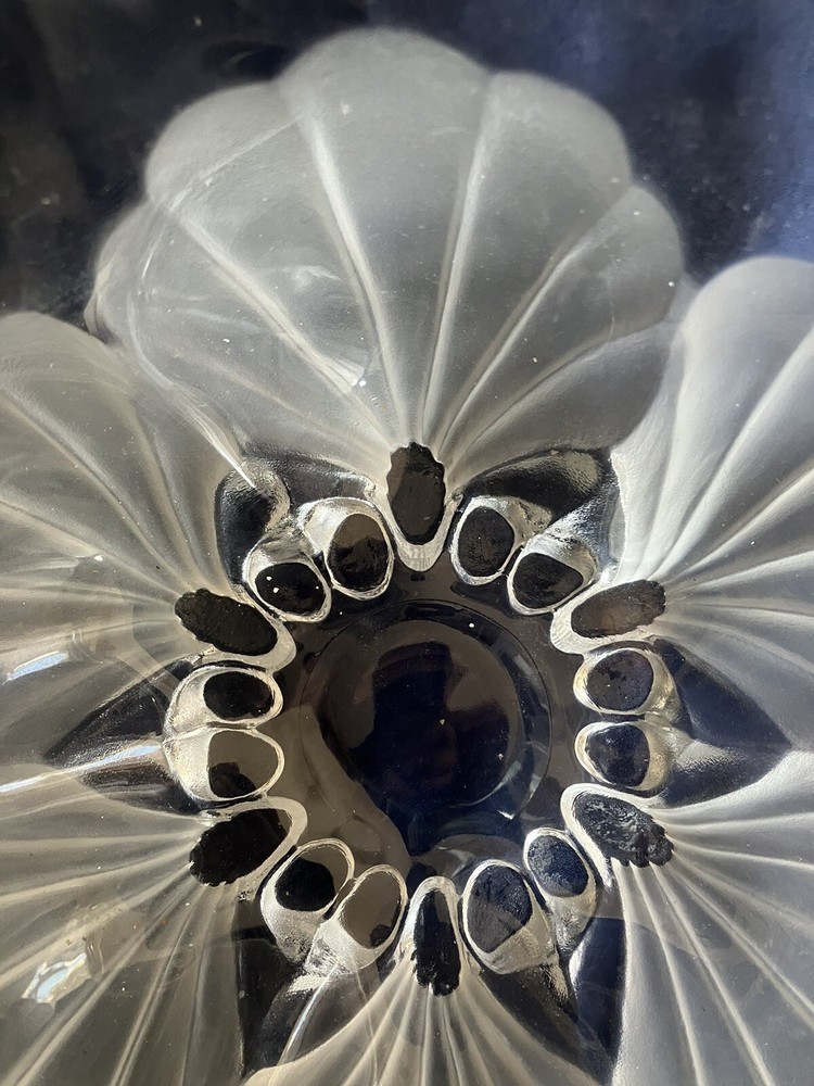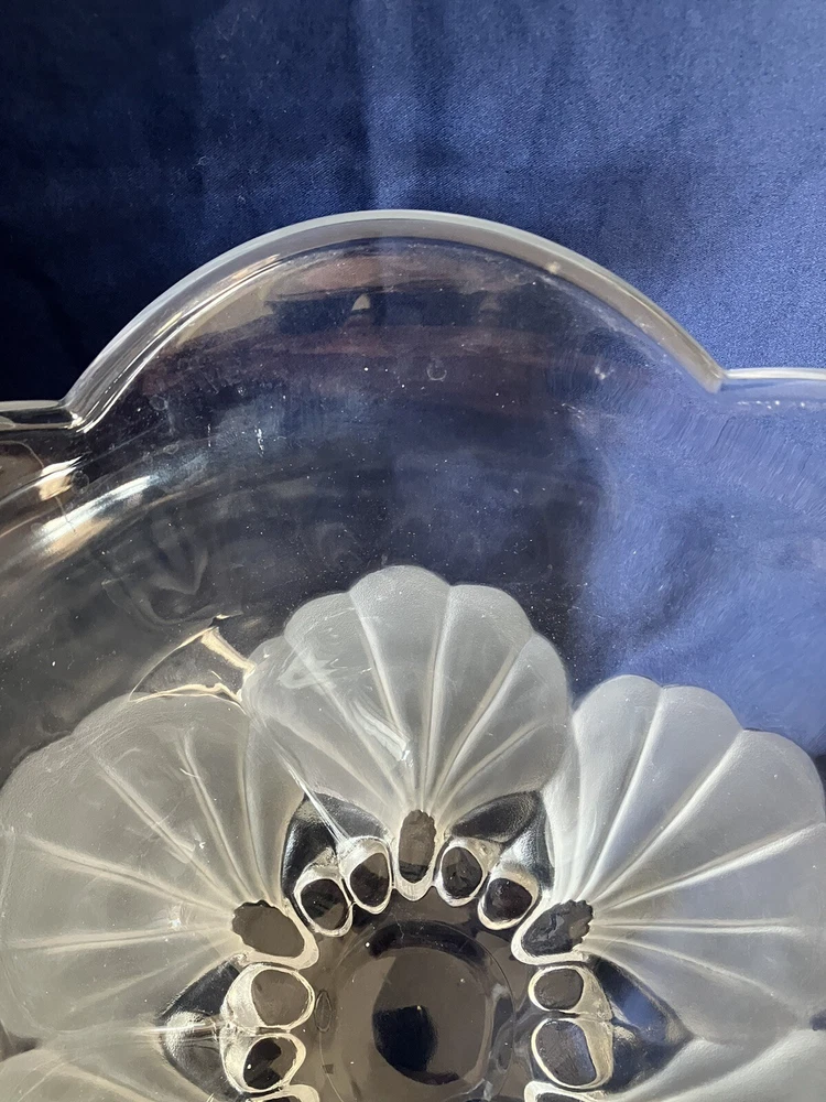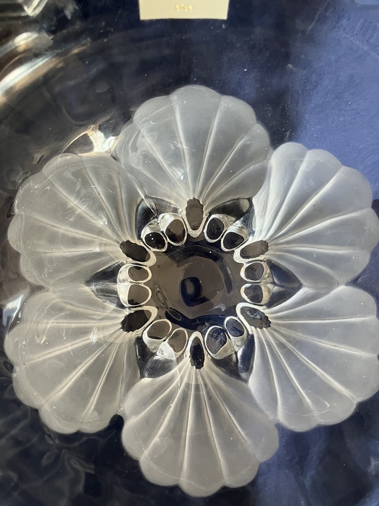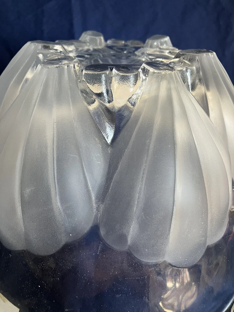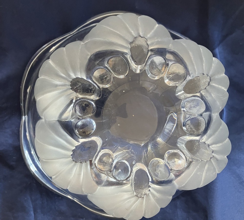 This crystal tulip bowl is from Studio Nova Japan. The “ping” when struck is clear and lovely. There is no visible damage. It’s just a beautiful piece. 9-5/8” across opening, 6-1/4” high, and 4” across base.