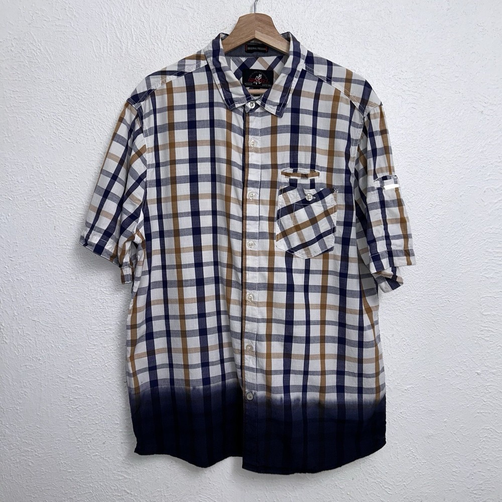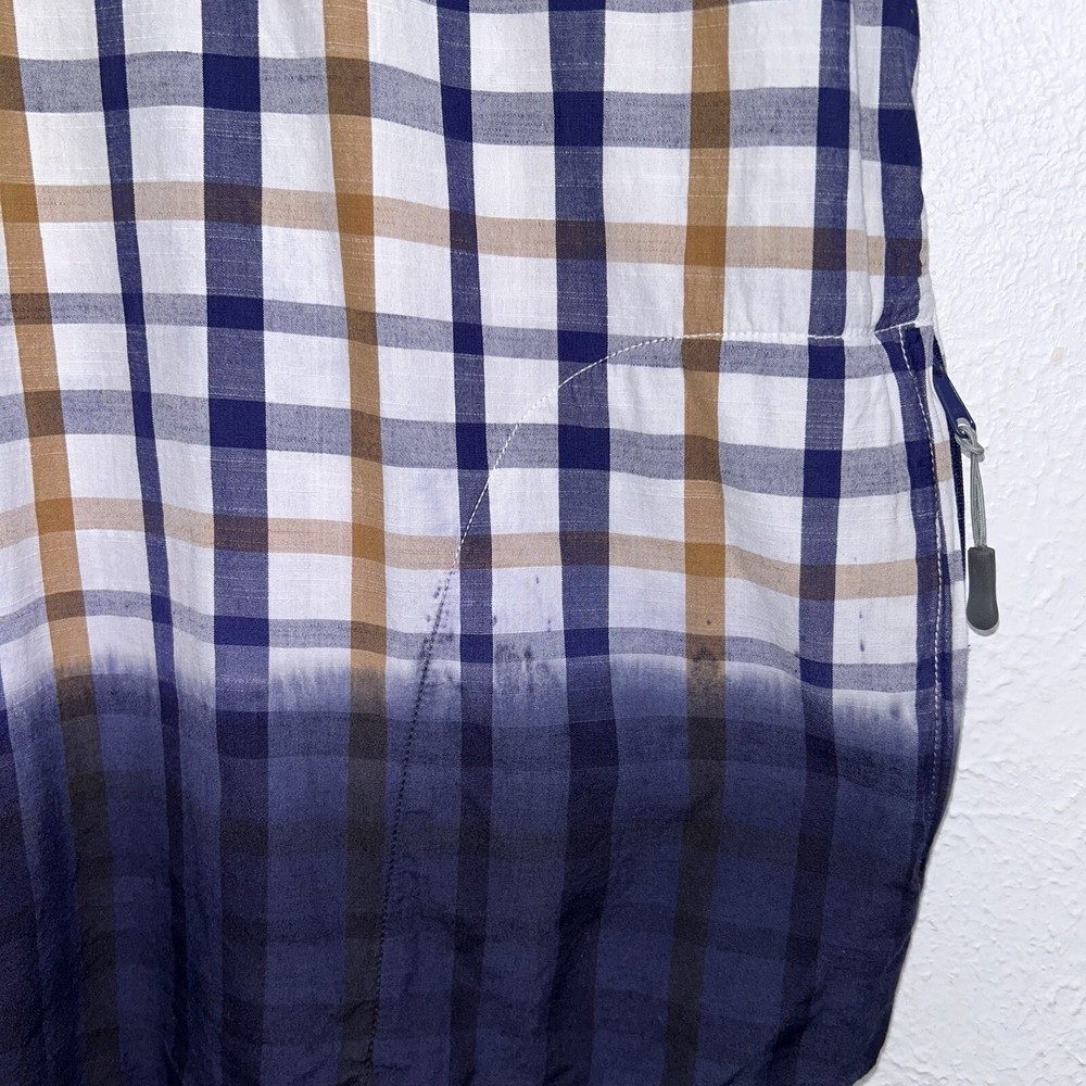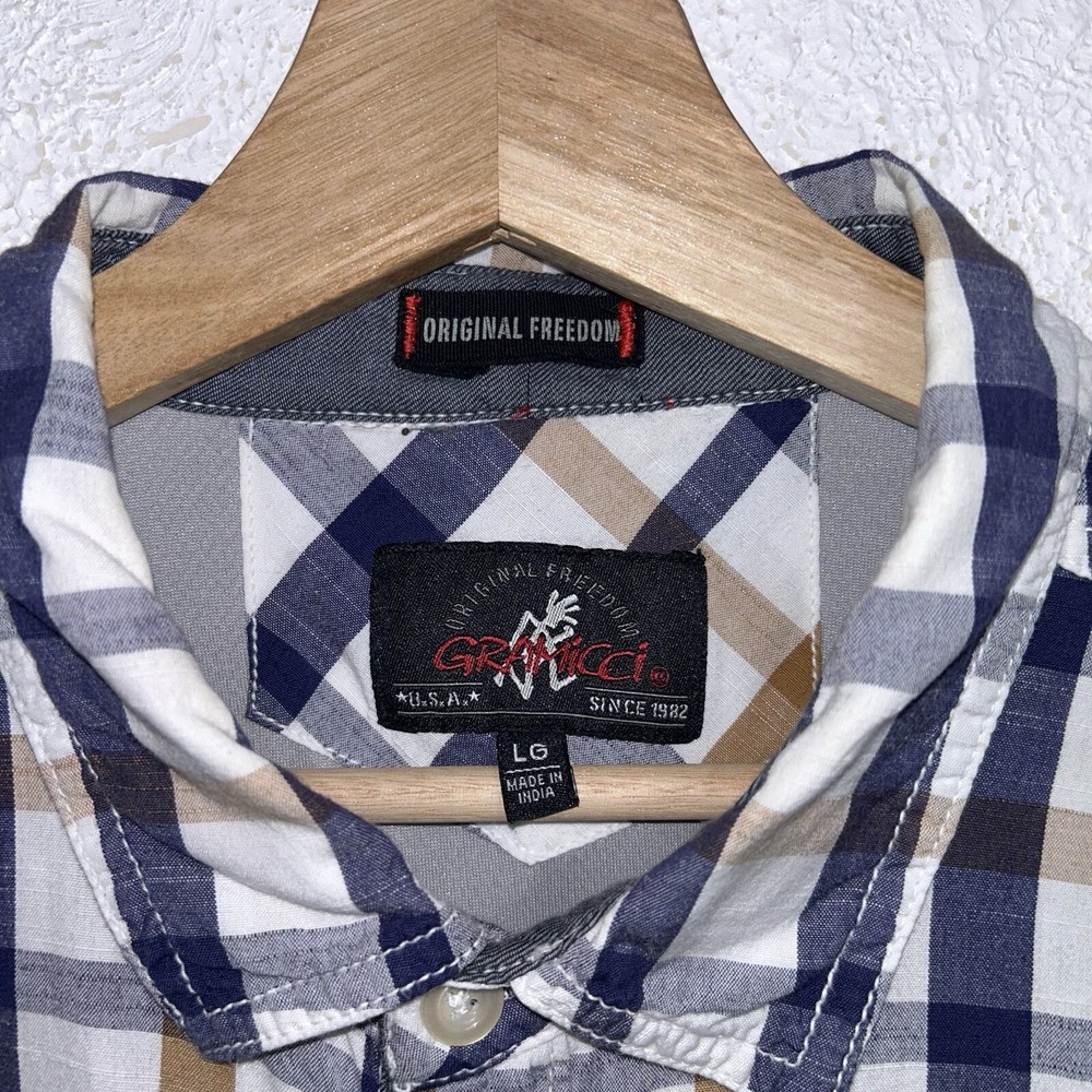 Condition is preowned , question or additional photo’s please DM. Also please pay close attention to measurements provided Dimensions 23 pit to pit 30 lengtb This Gramicci Original Freedom Button Shirt in Cliff Plaid Dip Dye is a versatile addition to any wardrobe. With a collared neckline and button closure, it's suitable for a range of occasions including travel, casual wear, and workwear. The shirt is made from lightweight cotton knit fabric, which makes it perfect for all seasons. The shirt features easy care and pockets, making it both stylish and practical. The multicolor plaid pattern adds a touch of urban fashion, while the embroidered accents give it a classic streetwear look. This shirt is machine washable and is available in size M for men. It's part of the Button Down Shirt product line from Gramicci, a trusted brand in city apparel.