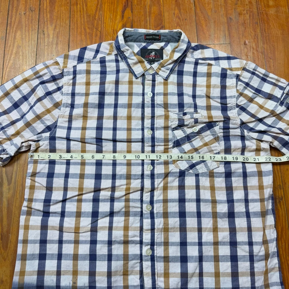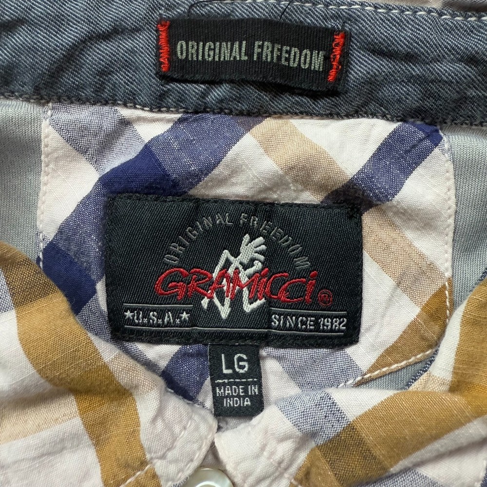 Gramicci Original Freedom Shirt Button Up Cliff Plaid Dip Dye Size: L Measurements: 22x31 Color: Multicolor Condition: 8/10 This item has signs of wear Message me with any questions you may have. If you are not completely satisfied with your purchase, I accept 30 day returns.