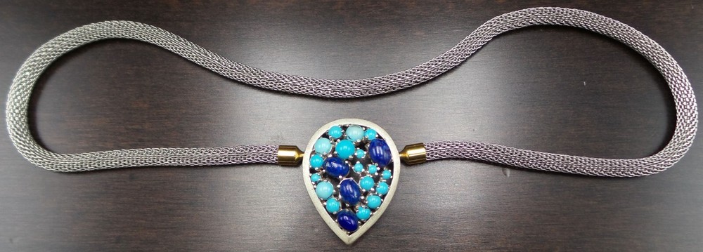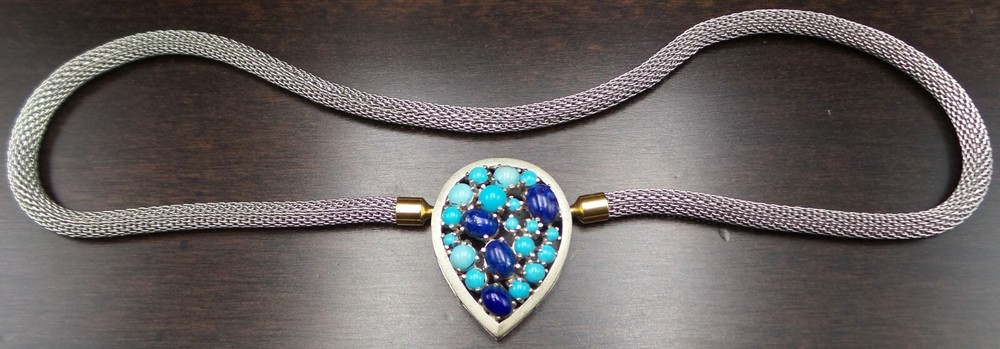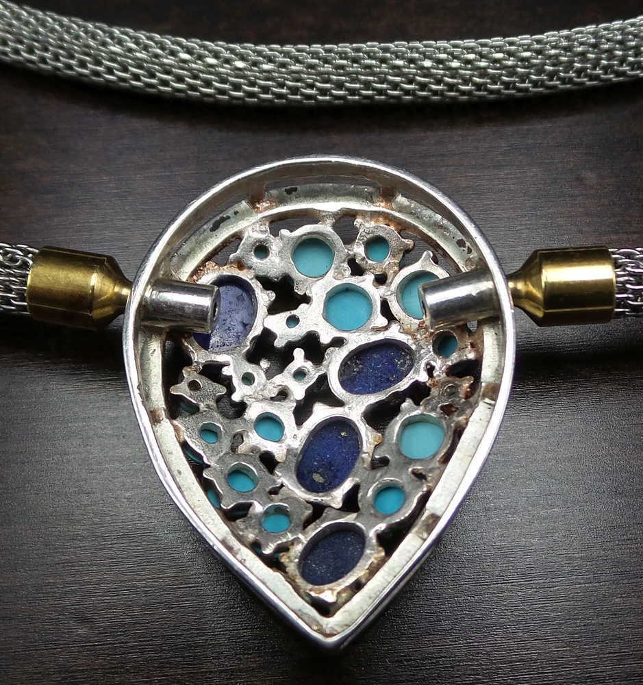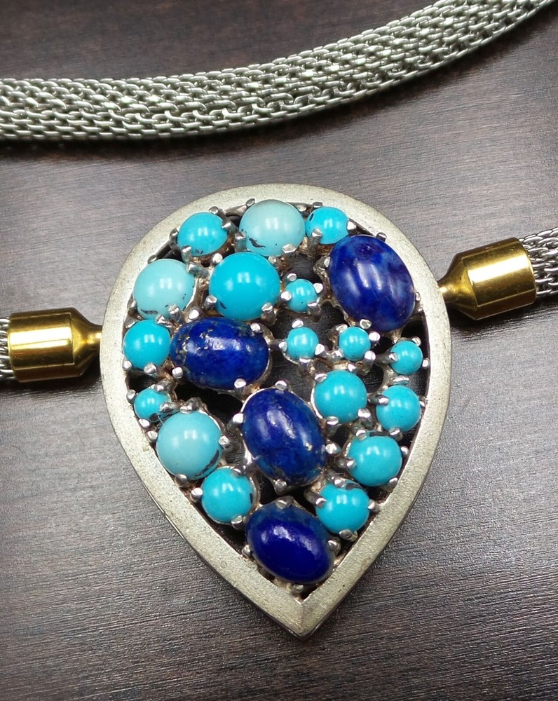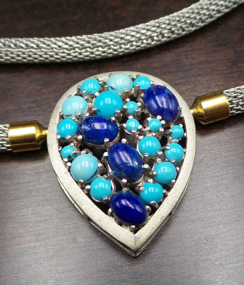 Vintage Sterling Silver, Turquoise & Lapis Lazuli Studio Pendant Necklace This very unique vintage studio piece features a teardrop shaped centerpiece adorned with Turquoise and Lapis Lazuli cabochons. The beautiful thick mesh necklace attaches to the centerpiece with two gilt "push-an-twist" clasps which enables complete removal of the necklace to wear the centerpiece as a pendant on a different chain. The centerpiece measures approx. 1 3/8" long x 1 1/16" wide and the necklace measures approx. 17" long (18" when adding the centerpiece). Total weight is 26.7 grams. Stamped "925" for Sterling Silver. A very unusual and beautiful vintage piece! It is very important to us that you are happy with your purchase. We describe our items as accurately as possible but a picture is worth a thousand words, so please be sure to view all pictures since they are considered part of the description. Please read the written description for dimensions and weight. We directly charge Florida sales tax to Florida residents and pass the sales tax collected from you to the state government. Based on recent legislation, depending on your state of residence, E-Bay may charge sales tax to submit it to the respective state. We acknowledge your right to return an item if you don't like it since you're only able to really tell once you can touch and see it in person. In this case we may apply a 10% restocking fee. You can return an item for any reason within 30 business days after the purchase date and we will, provided the item is in unaltered / undamaged condition, issue a full refund (adjusted for the restocking fee if applicable). If you buy several items we are happy to consolidate shipping to save you some money. We usually ship with USPS first class or priority mail but may use other carriers depending on speed of delivery and value of items. The shipping cost we charge includes handling, packaging, material, and shipping. We ship on Mondays, Thursdays and Saturdays (except on national holidays) and upload tracking information the same day.