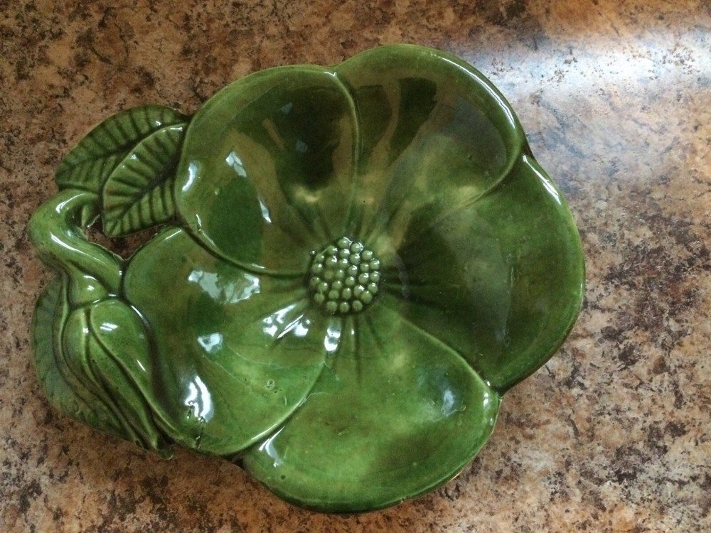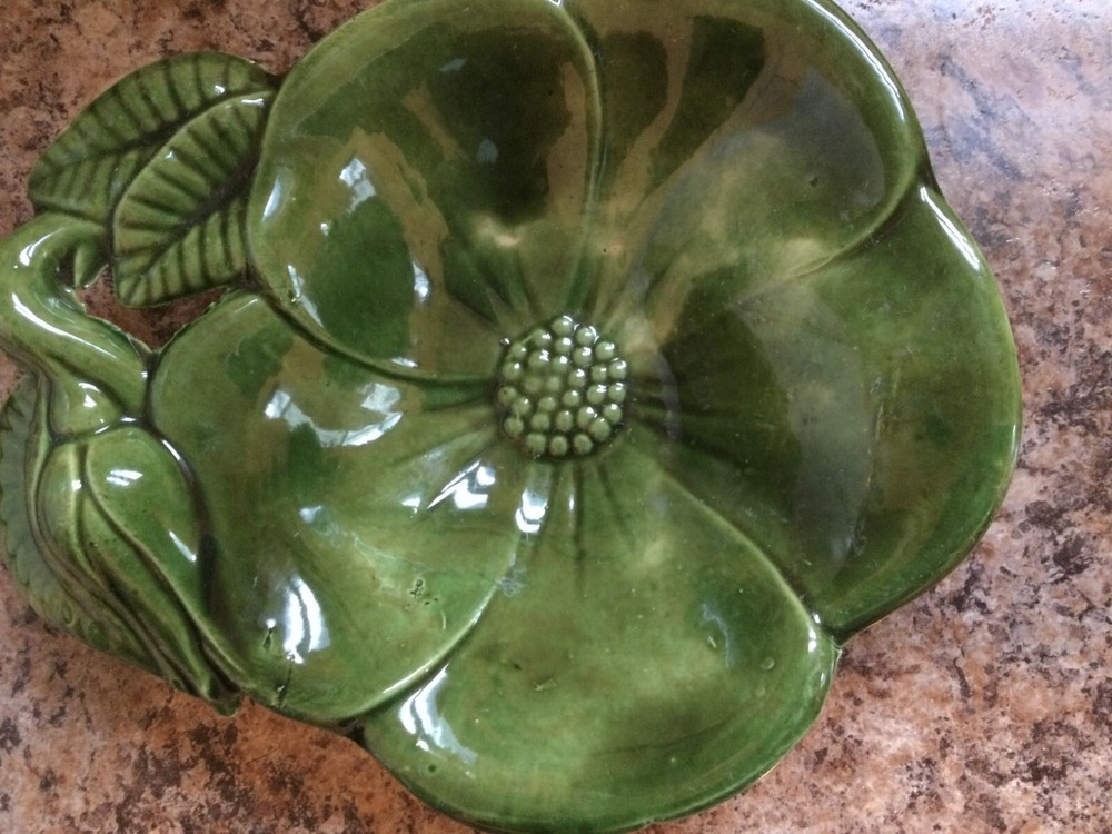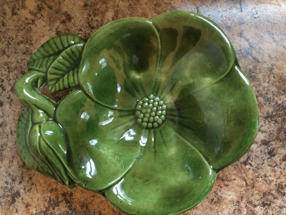 It is a very nice sunflower shaped bowl plate handled very decorative. Size: 17.2cm long, 15.3cm wide, 5cm tall Condition: pre-owned, very good, please check the pictures....