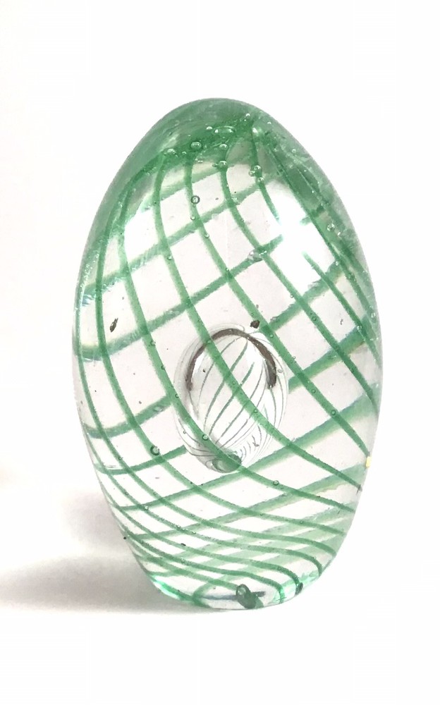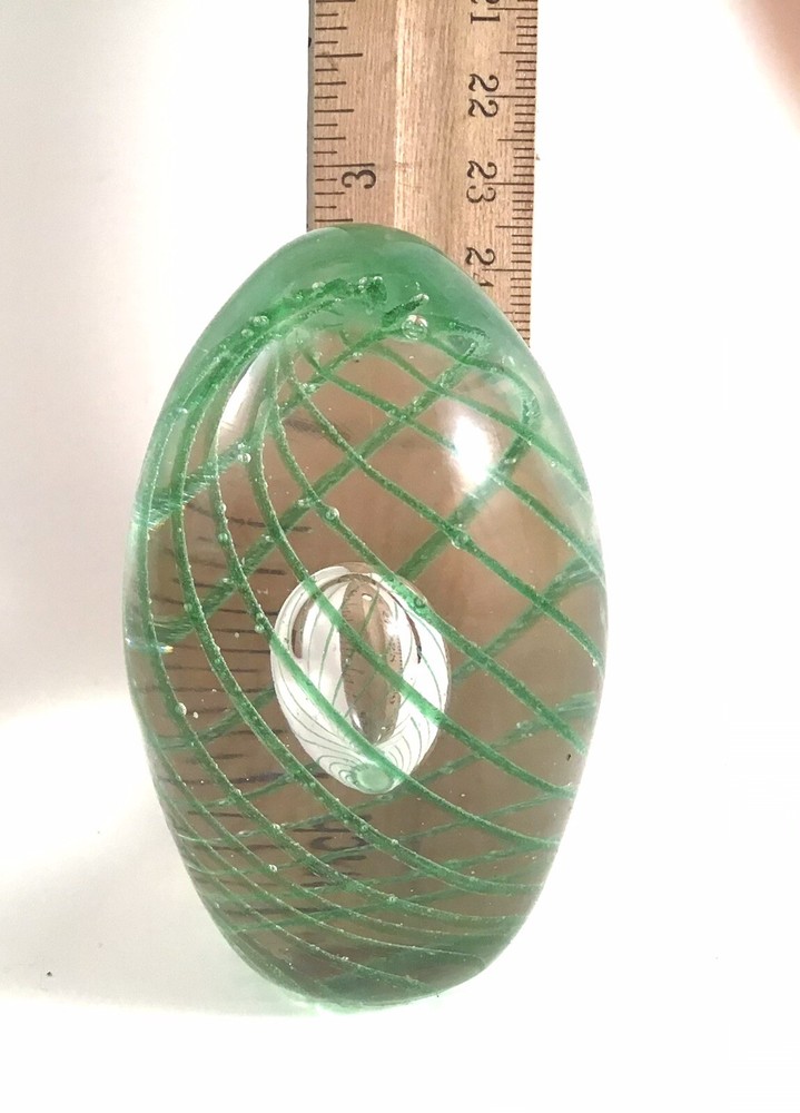Green Swirl Art Glass Egg-Shaped Paperweight With Teardrop Controlled Bubble.