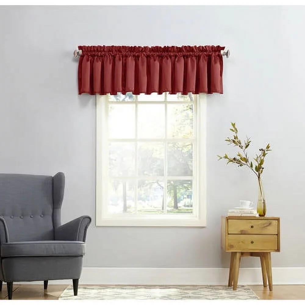 Gregory Brick Red Polyester 54 in. W X 18 in. L Rod Pocket Room Darkening Curtain Valance (Single Panel) The Sun Zero Gregory Room Darkening Rod Pocket Curtain Valance delicately adorns the top of any window in your home. Pair with Sun Zero curtains or hang alone for maximum light exposure. Equipped with a rod pocket that fits curtain rods up to 1.5 in. Dia. Machine wash cold on gentle cycle. Use non-chlorine bleach when needed. Tumble dry on low heat, using a cool iron as needed. Color: Brick Red. Attributes: MPN: 45999 Size: 54 x 18 Color: brick red Material: Polyester Weight: 1 lb