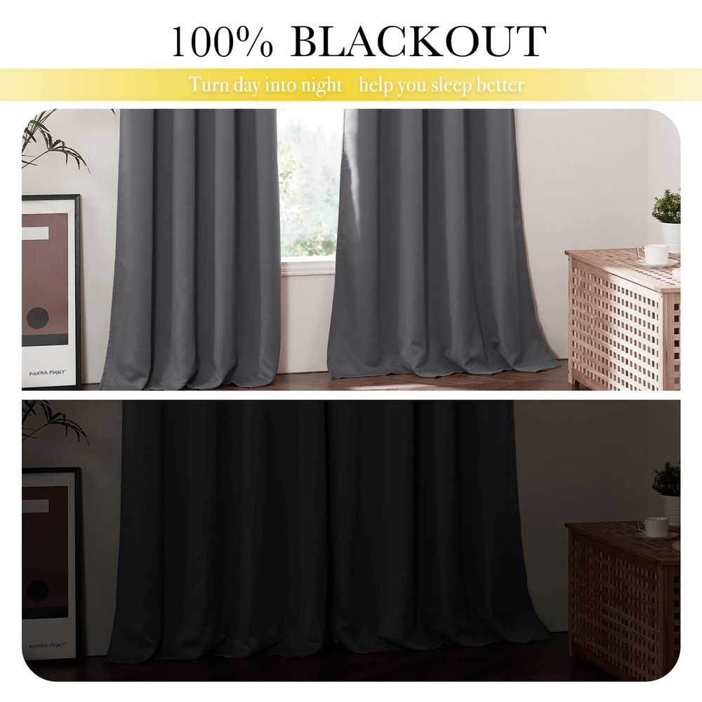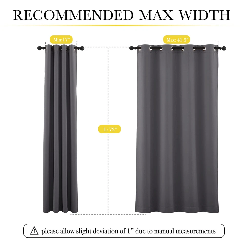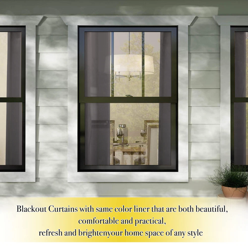 Blackout Curtains Ready Made: 2 panels per package. Each Classic Lined Curtain measures 52" wide x 72" long (Total width is 104"). The unique design of the silver grommet (1.6 inch inner diameter) creates casual elegance for your house, which makes the curtains easy to install and slide. Blackout Effect: The real blackout curtains on the market. Sew in same color liner backing makes the drapes thick enough to completely keep out the sunlight and uv ray. The benefit is to offer you a real dark environment, bringing you a good night's sleep during the day. Noise Reducing: Heavyweight Blackout Lined Curtain Panels can be a good sense of drape, making the window completely closed, to cut noise down. The effect of absorbing sound is 2 times higher than the ordinary 1 layer of curtains so that at any time you are not disturbed by noise. Unique Design: Draperies constructed with 2 layers are all triple weave blackout fabric, balancing room temperature by insulating against summer heat and winter chill meanwhile protect privacy. No coating, no formaldehyde, bring harmony to your family. Easy Care: Quality finishing will withstand years of use. Machine washable and Wash the water temperature below 86℉. Mild detergent no bleaching. Low temperature ironing. Don't use sharp things scratching curtains.