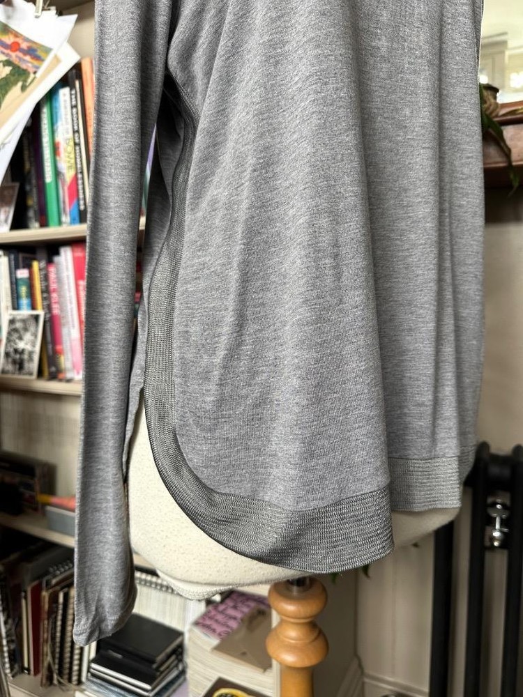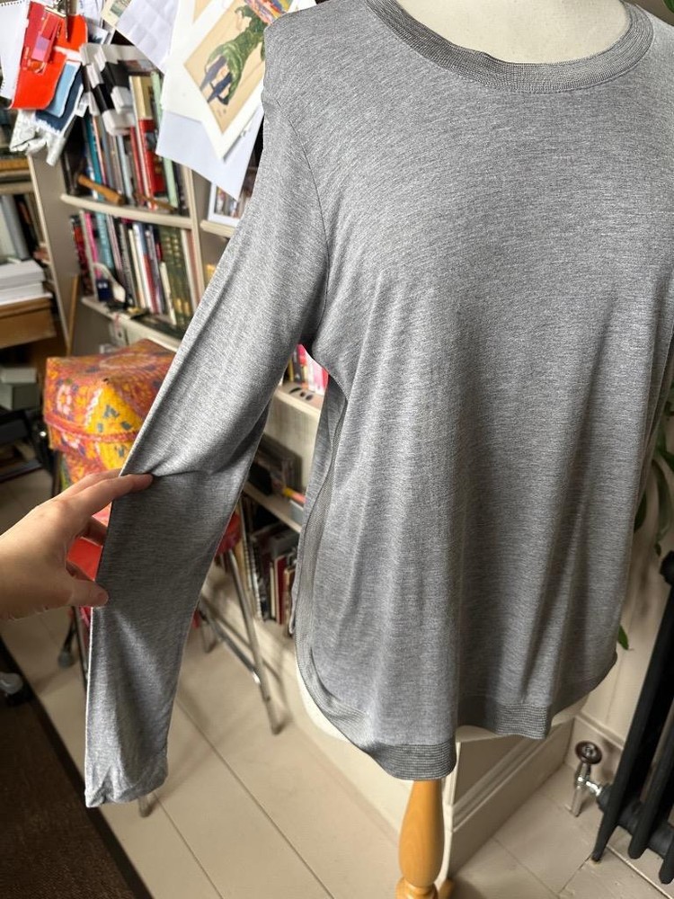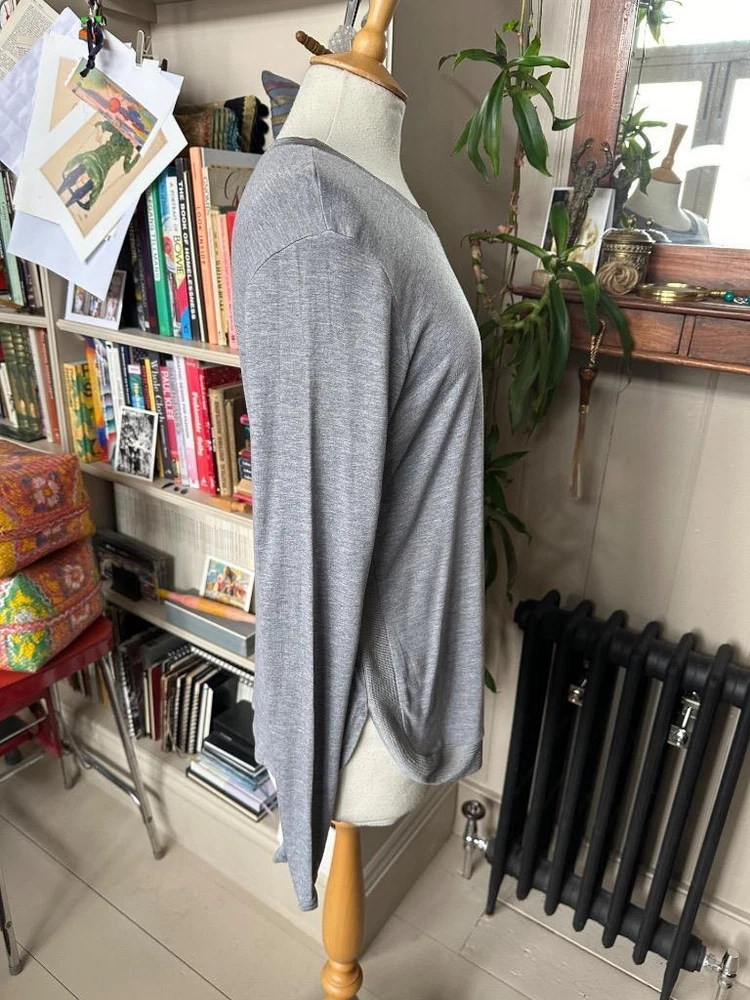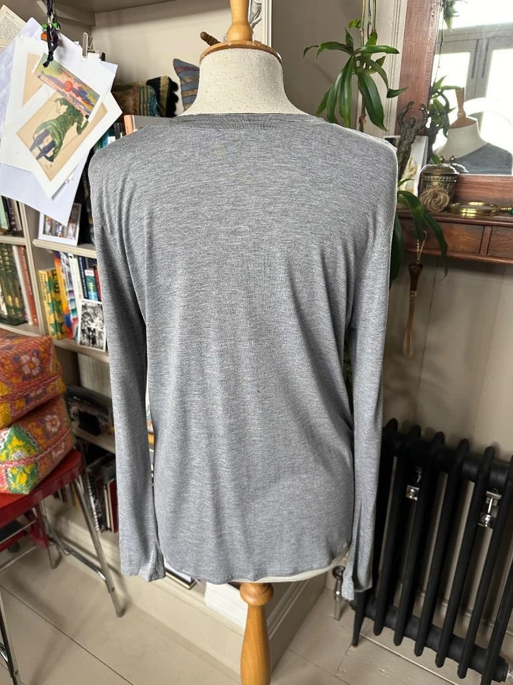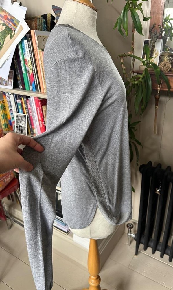 Grey Zara W & B size L long sleeve dip hem jersey t-shirt top silky knit trim the content label has been removed i beleive its viscose Measurements (all approx, unstretched): pit to pit 21" length 26" Get images that make Supersized seem small. THE simple solution for eBay sellers.