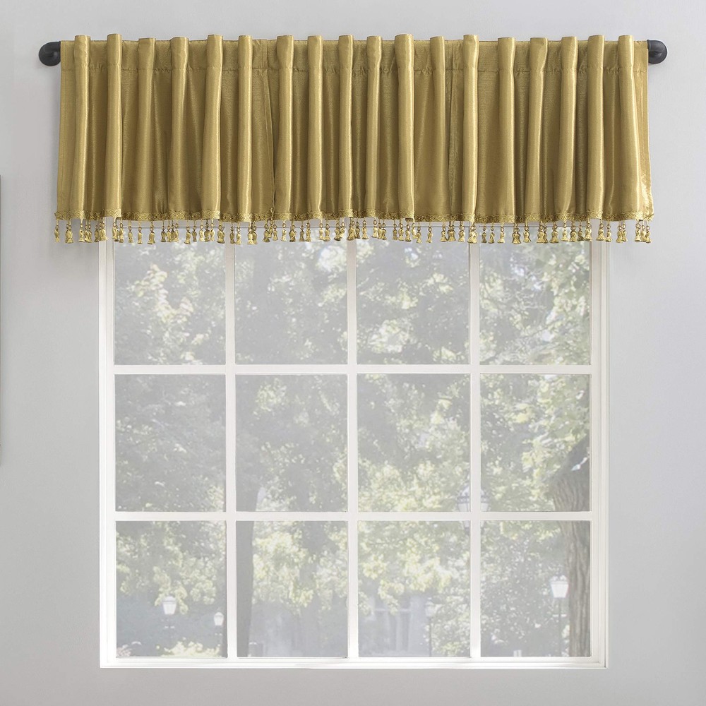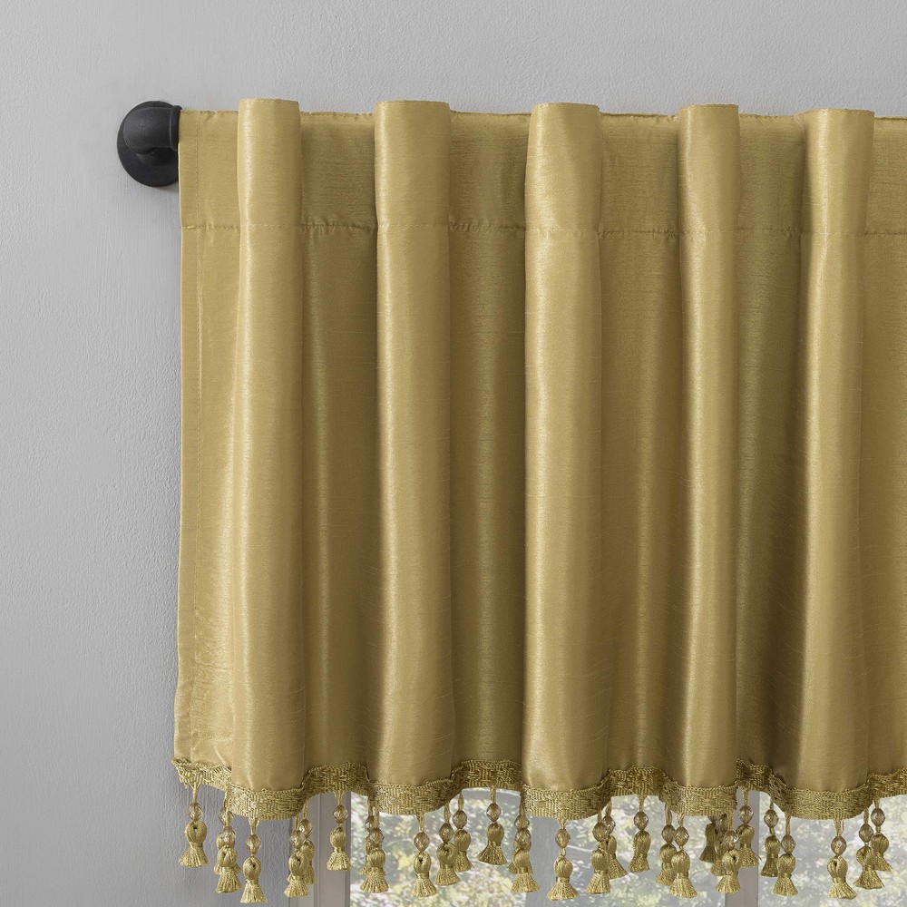Featuring an elegant dupioni faux silk fabric with a raw slub texture, Greyson Faux Dupioni Silk Valances add a touch of glamour with ornately beaded tassels while providing the ultimate in light blocking technology to keep out even the harshest of light. Extreme Blackout Thermal Lining is laboratory tested to block out 100% of light where window is covered. Back tabs fit curtain rods up to 1.5" in diameter for easy slide-through installation. Hang with the matching Greyson Curtains on a double rod, or use as a standalone valance. Sold as individual valances measuring 50" width by 17" length in color gold. Coordinating curtain panels are sold separately. Measure carefully before selecting your desired size and quantity. Rod not included. Machine wash cold on gentle cycle. Use non-chlorine bleach when needed. Tumble dry on low heat, using a cool iron as needed. Elegant faux dupioni silk valance with a raw slub texture imparts opulent radiance Tassels with ornate beaded detail add a touch of glamor Blocks out 100% of outside light where window is covered Coodinate with the matching curtains (sold separately) on a double rod, or use as a standalone valance Back tabs fit curtain rods up to 1.5" in diameter Valances sold individually (image features 2)