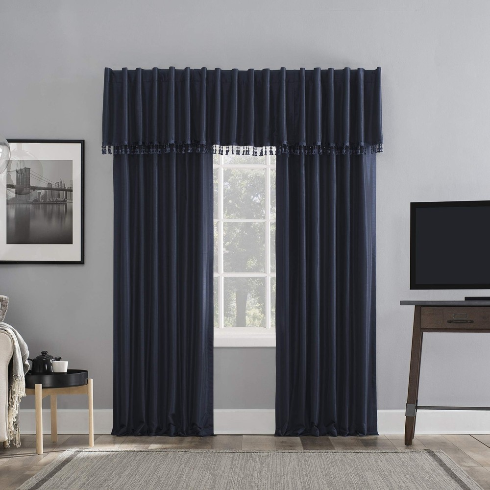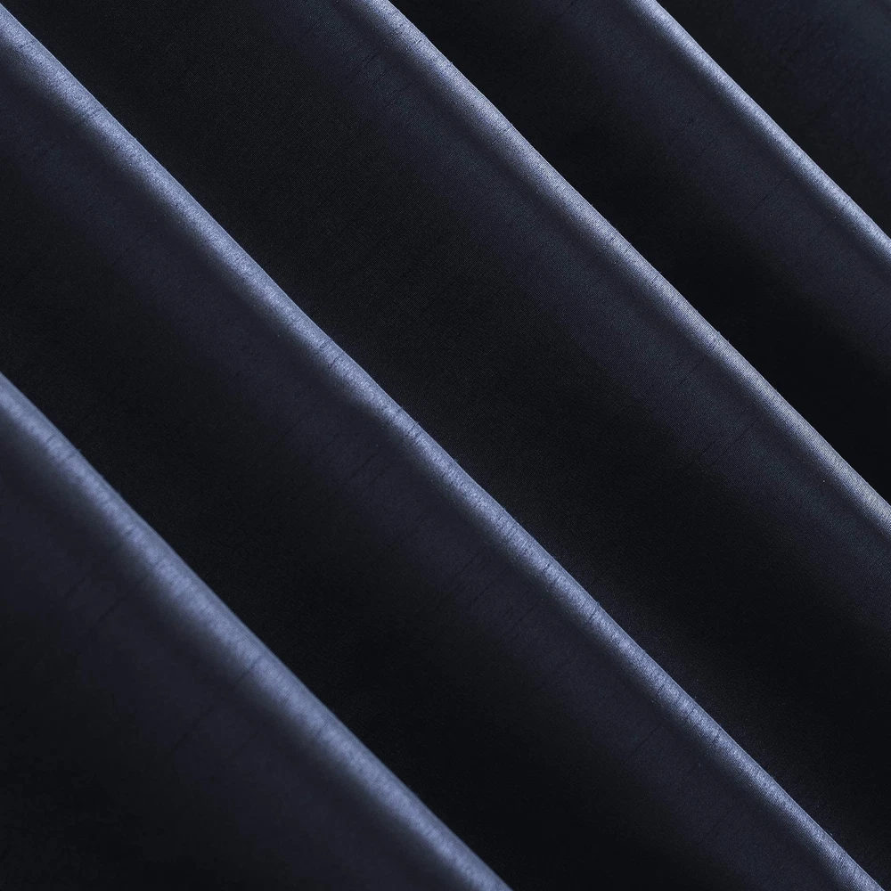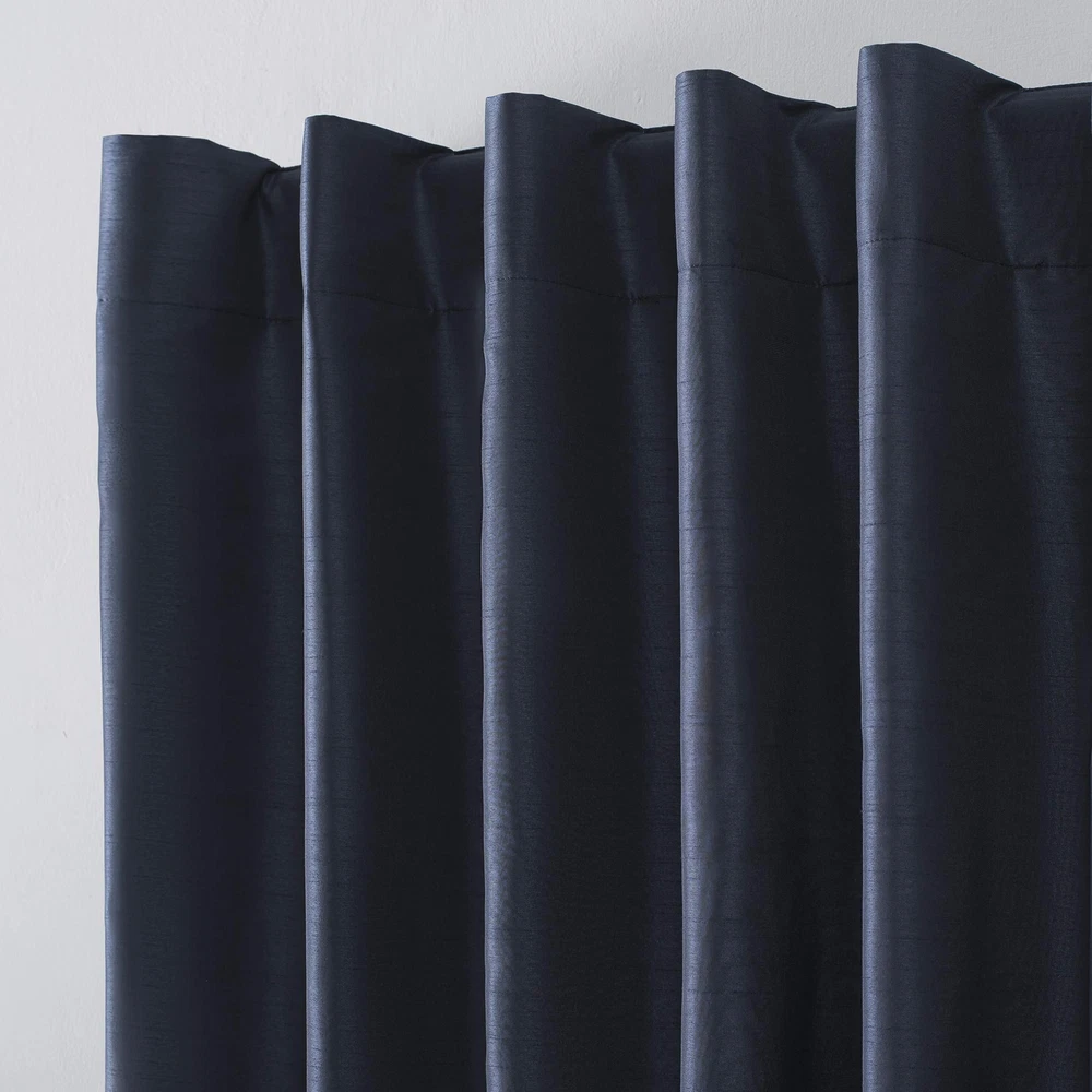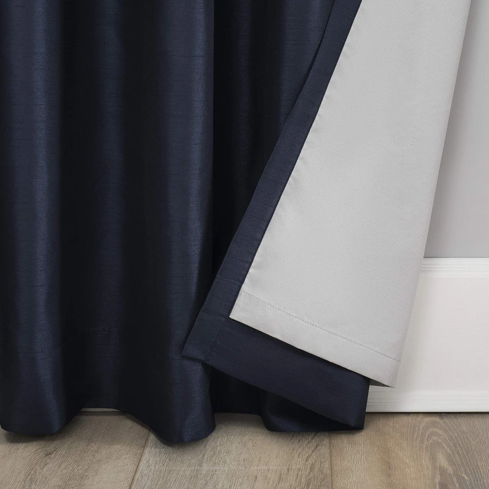Featuring an elegant dupioni faux silk fabric with a raw slub texture, Evelina Faux Dupioni Silk Extreme 100% Blackout Back Tab Curtains provide the ultimate in light blocking technology to keep out even the harshest of light while adding opulent radiance to any room of your home. Extreme Blackout Thermal Lining is laboratory tested to block out 100% of light, reduce outside noise by up to 30%, and decrease energy lost through your windows by up to 40%. Comfort is optimized with thermal properties that help keep summer heat and winter chill out of your home. Hang in your entertainment room to eliminate screen glare and reduce distracting outside noise, or in your bedroom for enhanced privacy and a sounder, more uninterrupted sleep. Sold as individual panels measuring 50" width by 63" length in color navy. Measure carefully before selecting your desired size and quantity. Rod not included. Machine wash cold on gentle cycle. Use non-chlorine bleach when needed. Tumble dry on low heat, using a cool iron as needed. Item Package Dimension: 10.43L x 8.31W x 1.93H inches Item Package Weight - 1.44 Pounds Item Package Quantity - 1 Product Type - CURTAIN