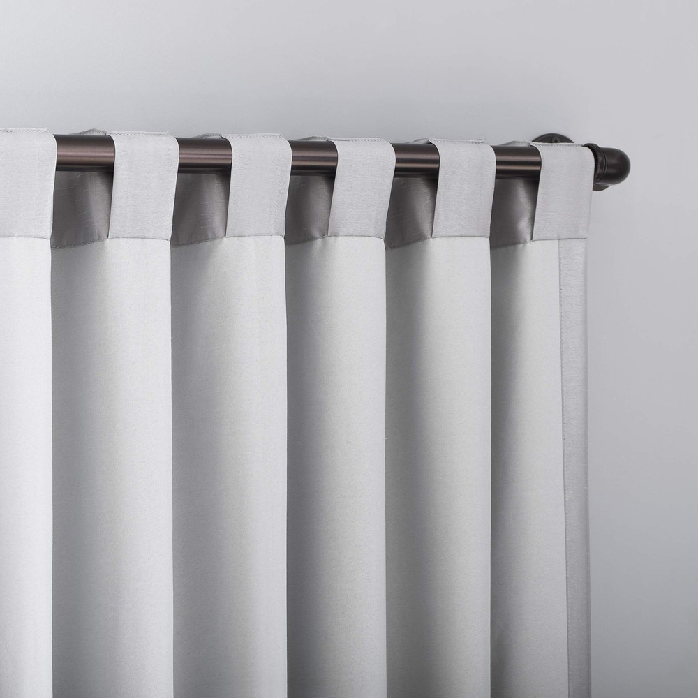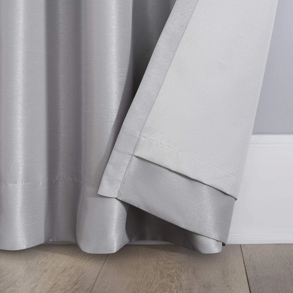 Featuring an elegant dupioni faux silk fabric with a raw slub texture, Greyson Faux Dupioni Silk Extreme 100% Blackout Back Tab Curtains provide the ultimate in light blocking technology to keep out even the harshest of light while adding opulent radiance to any room of your home. Extreme Blackout Thermal Lining is laboratory tested to block out 100% of light, reduce outside noise by up to 30%, and decrease energy lost through your windows by up to 40%. Comfort is optimized with thermal properties that help keep summer heat and winter chill out of your home. Built-in hidden back tabs allow for easy slide-through installation on curtain rods up to 1.5" in diameter. Hang in your entertainment room to eliminate screen glare and reduce distracting outside noise, or in your bedroom for enhanced privacy and a sounder, more uninterrupted sleep. Sold as individual panels measuring 50" width by 95" length in color chrome gray. Measure carefully before selecting your desired size and quantity. Rod not included. Machine wash cold on gentle cycle. Use non-chlorine bleach when needed. Tumble dry on low heat, using a cool iron as needed. Elegant faux dupioni silk fabric with a raw slub texture imparts opulent radiance Extreme Blackout Thermal Lining blocks out 100% of outside light Energy Efficient design reduces energy lost through your windows by up to 40% Thermal properties help keep summer heat and winter chill out of your home Noise reduction by up to 30% helps you get a sounder, more uninterrupted sleep Back tabs fit curtain rods up to 1.5" in diameter